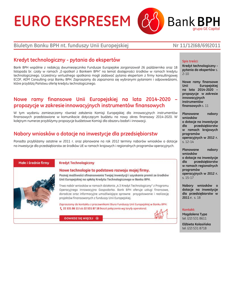 EURO EKSPRESEM Biuletyn Banku BPH nt. funduszy Unii Europejskiej Nr 11/12(68/69)2011 Kredyt technologiczny - pytania do ekspertów Bank BPH wspólnie z redakcją dwumiesięcznika Fundusze Europejskie zorganizował 26 października oraz 18 listopada br. czaty w ramach „E-spotkań z Bankiem BPH” na temat dostępności środków w ramach kredytu technologicznego. Uczestnicy wirtualnego spotkania mogli zadawać pytania ekspertom z firmy konsultingowej ECDF, ADM Consulting oraz Banku BPH. Zapraszamy do zapoznania się wybranymi pytaniami i odpowiedziami, które przybliżą Państwu ofertę kredytu technologicznego. Nowe ramy finansowe Unii Europejskiej na lata 2014-2020 – propozycje w zakresie innowacyjnych instrumentów finansowych W tym wydaniu zamieszczamy również założenia Komisji Europejskiej dla innowacyjnych instrumentów finansowych przedstawione w komunikacie dotyczącym budżetu na nowy okres finansowy 2014-2020. W kolejnym numerze przybliżymy propozycje budżetowe Komisji dla obszaru badań i innowacji. Nabory wniosków o dotacje na inwestycje dla przedsiębiorstw Ponadto przybliżamy ostatnie w 2011 r. oraz planowane na rok 2012 terminy naborów wniosków o dotacje na inwestycje dla przedsiębiorstw ze środków UE w ramach krajowych i regionalnych programów operacyjnych. Spis treści: Kredyt technologiczny pytania do ekspertów s. 2-10 Nowe ramy finansowe Unii Europejskiej na lata 2014-2020 – propozycje w zakresie innowacyjnych instrumentów finansowych s. 11 Planowane nabory wniosków o dotacje na inwestycje dla przedsiębiorstw w ramach krajowych programów operacyjnych w 2012 r. s. 12-14 Planowane nabory wniosków o dotacje na inwestycje dla przedsiębiorstw w ramach regionalnych programów operacyjnych w 2012 r. s. 15-17 Nabory wniosków o dotacje na inwestycje dla przedsiębiorstw w 2011 r. s. 18 Kontakt: Magdalena Typa tel. (22) 531 8611 Elżbieta Kolasińska tel. (22) 531 8718 Kredyt technologiczny - pytania do ekspertów Termin e-spotkania: 26 października 2011 r. Eksperci: Magdalena Typa (MT), Bank BPH, Karolina Kłobucka (KK), ECDF, Marek Szymański (MS), Fundusze Europejskie. Pyt.: Czy można starać się o kredyt na kilka projektów równocześnie? MT: Tak, jeden beneficjent może złożyć kilka wniosków o premię i kredyt technologiczny jednocześnie, przy czym każdy powinien dotyczyć wdrożenia nowej technologii. Pyt.: Witam serdecznie, czy mógłbym, uzyskać informację dotyczącą kredytu technologicznego? Jakie są warunki aby dostać dofinansowanie z Unii Europejskiej ? MT: W telegraficznym skrócie: aby ubiegać się o kredyt trzeba mieć zdolność kredytową; przy czym ze środków kredytu technologicznego można finansować realizację inwestycji technologicznej, polegającej na zakupie nowej technologii, jej wdrożeniu oraz uruchomieniu na jej podstawie wytwarzania nowych lub znacząco ulepszonych towarów, procesów lub usług albo wdrożeniu własnej nowej technologii oraz uruchomieniu na jej podstawie wytwarzania nowych lub znacząco ulepszonych towarów, procesów lub usług. Przez nową technologię należy rozumieć technologię w postaci: prawa własności przemysłowej, usługi badawczo-rozwojowej lub nieopatentowanej wiedzy technicznej, która umożliwia wytwarzanie nowych lub znacząco ulepszonych towarów, procesów lub usług, która nie jest stosowana na świecie dłużej niż 5 lat. Dofinansowanie, którego wysokość ustalana jest zgodnie z mapą pomocy publicznej i nie może przekroczyć 4 mln zł i może być przeznaczone na sfinansowanie kosztów kwalifikowalnych do których zalicza się m.in.: zakup gruntu, zakup nieruchomości zabudowanej, zakup lub wytworzenie środków trwałych, zakup robót i materiałów budowlanych, zakup wartości niematerialnych i prawnych. Pyt.: Zgodnie z definicją inwestycji technologicznej: inwestycja powinna polegać na zakupie/wdrożeniu własnej nowej technologii oraz uruchomieniu na jej podstawie wytwarzania nowych lub znacząco ulepszonych towarów, procesów lub usług. Czy wdrożenie inwestycji technologicznej może zakończyć się tylko i wyłącznie uruchomieniem nowego procesu? Czy wraz z uruchomieniem nowego procesu konieczne jest wytwarzanie nowych towarów/produktów? KK: Wraz z uruchomieniem nowego procesu technologicznego musi powstać nowy bądź udoskonalony produkt/usługa. EURO EKSPRESEM Pyt.: Mam pytanie jak realnie wygląda kwestia przygotowania dokumentacji, czy swoje pierwsze kroki powinnam skierować do banku, czy raczej do firmy doradczej? Jak w praktyce wygląda współpraca tych podmiotów? Nie chciałabym odbijać się od drzwi do drzwi, przyznam szczerze, że nie mam na to czasu. MT: Pierwsze kroki proszę skierować do Banku. Jeśli jest Pani zainteresowana ofertą naszego Banku, proszę o kontakt [email protected]. Jako Bank współpracujemy z firmami doradczymi na zasadzie wzajemnej rekomendacji usług. Przy czym nie musi Pani ograniczać się tylko do usług firm doradczych z którymi współpracuje Bank. Przy czym zakres współpracy jaki ustali Pani z wybraną firma doradczą podlega tylko dwustronnym negocjacjom, w które my jako Bank nie ingerujemy. Z naszej strony może Pani liczyć na informacje o zasadach aplikowania o kredyt i premię, dokumentację wymaganą przez nasz Bank i BGK oraz wsparcie merytoryczne w trakcie przygotowania wniosków o premię i kredyt. Pyt.: Jesteśmy dużą firmą budowlaną, zamierzamy realizować inwestycję deweloperska z zamiarem wykorzystania alternatywnej energii słonecznej, a także chcemy wdrożyć nowoczesne rozwiązania w zakresie budowy balkonów stosowaną na innych rynkach europejskich. Czy możemy się ubiegać o dofinansowanie ze środków unijnych? realizować KK: Jeżeli jesteście dużą firmą to niestety nie możecie ubiegać się o dofinansowanie z kredytu technologicznego. Program jest skierowany tylko do sektora MSP. Pyt.: Prowadzę firmę usługową, czy usługa może zaliczać się do nowej techno