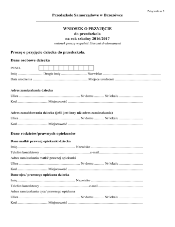 Załącznik nr 3 Przedszkole Samorządowe w Brzozówce __________________________________________________ WNIOSEK O PRZYJĘCIE do przedszkola na rok szkolny 2016/2017 wniosek proszę wypełnić literami drukowanymi Proszę o przyjęcie dziecka do przedszkola. Dane osobowe dziecka PESEL Imię ............................ Drugie imię ............................. Nazwisko .................................................................. Data urodzenia .............................................................. Miejsce urodzenia .................................................... Adres zamieszkania dziecka Ulica ..................................................................... Nr domu ........... Nr lokalu ........................... Kod .................................. Miejscowość ..................................................................................... Adres zameldowania dziecka (jeśli jest inny niż adres zamieszkania) Ulica ..................................................................... Nr domu ........... Nr lokalu ........................... Kod .................................. Miejscowość ..................................................................................... Dane rodziców/prawnych opiekunów Dane matki/ prawnej opiekunki dziecka Imię.................................................................. Nazwisko ........................................................... Telefon kontaktowy .........................................................e-mail.................................................. Adres zamieszkania matki/ prawnej opiekunki Ulica ..................................................................... Nr domu ........... Nr lokalu ........................... Kod .................................. Miejscowość ..................................................................................... Dane ojca/ prawnego opiekuna dziecka Imię.................................................................. Nazwisko ........................................................... Telefon kontaktowy ........................................................e-mail................................................... Adres zamieszkania ojca/ prawnego opiekuna Ulica ..................................................................... Nr domu ........... Nr lokalu ........................... Kod .................................. Miejscowość ..................................................................................... Informacje dodatkowe o dziecku 1. Opinia/orzeczenie poradni psychologiczno-pedagogicznej lub innej poradni specjalistycznej, lekarza, informacje o specyficznych trudnościach dziecka, o jego niepełnosprawności: ………………………………………………………………………………………….………………. ……………………………………………………………………………………………………………………… ……………………………………………………………………………………………………………………… …………..…………………………………………………………………..……. W przypadku dziecka niepełnosprawnego należy dołączyć do wniosku orzeczenie lub opinię poradni psychologiczno – pedagogicznej lub innej poradni specjalistycznej, lekarza. 2. Inne osoby niepełnosprawne w rodzinie, stopień pokrewieństwa – matka/prawna opiekunka, ojciec/prawny opiekun, brat, siostra (podkreślić właściwe). 3. Rodzina stanowi łącznie z dzieckiem ………osób, w tym ……….dzieci. 4. Jestem matką/ojcem samotnie wychowującym dziecko/dzieci. (jeśli nie dotyczy, wykreślić) 5. Dziecko wychowuje się w rodzinie zastępczej. (jeśli nie dotyczy, wykreślić) W postępowaniu rekrutacyjnym mogą brać udział kandydaci zamieszkali poza obwodem Przedszkola Samorządowego 6. Uzasadnienie wniosku o przyjęcie dziecka spoza obwodu: …………………………………………………………………………………………………………… …………………………………………………………………………………………………………… …………………………………………………………………………………………………………… …………………………………………………………………………………………………………..… Uprzedzony o odpowiedzialności karnej z art. 233 Kodeksu Karnego oświadczam, że podane dane są zgodne ze stanem faktycznym (mam świadomość skutków złożenia fałszywego oświadczenia). Niniejszym przyjmuję do wiadomości i wyrażam zgodę na gromadzenie, przetwarzanie i udostępnianie danych osobowych zawartych we wniosku, w systemach informatycznych szkoły oraz organów uprawnionych do nadzoru nad jednostkami oświatowymi. Przetwarzanie danych odbywać się będzie zgodnie z ustawą o ochronie danych osobowych (tekst jednolity Dz.U. z 2002r. Nr 101, poz.926 z późniejszymi zmianami ). Data złożenia wniosku …………………………… Podpis rodziców/prawnych opiekunów …………….…………………………….. Decyzja Komisji Rekrutacyjnej powołanej w Brzozówce o przyjęciu dziecka do przedszkola: przez dyrektora Przedszkola Dziecko zostało przyjęte / nie zostało przyjęte do przedszkola …........................................................ (data) …………….………………………………………….. (podpis członków Komisji) Decyzja Dyrektora Przedszkola Samorządowego w Brzozówce Dziecko zostało przyjęte / nie zostało przyjęte do przedszkola …................................................................... (data) ……………………………………….. (podpis dyrektora) Samorządowego