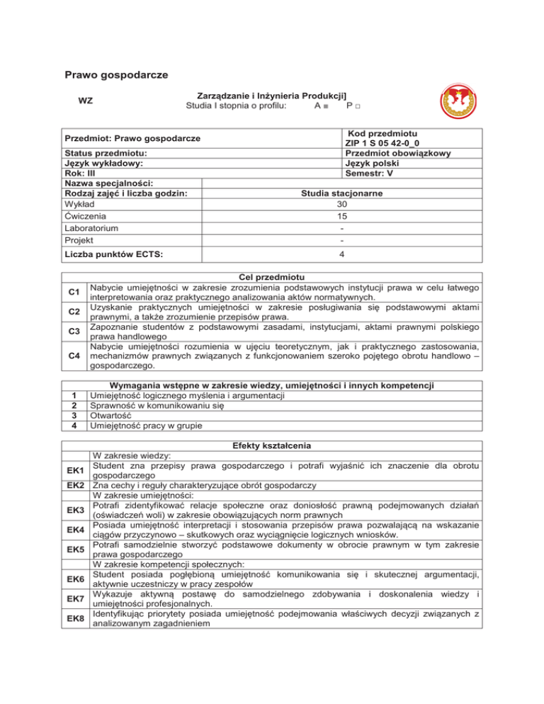 Prawo gospodarcze Zarz dzanie i In ynieria Produkcji] P Studia I stopnia o profilu: A WZ Kod przedmiotu ZIP 1 S 05 42-0_0 Przedmiot obowi zkowy J zyk polski Semestr: V Przedmiot: Prawo gospodarcze Status przedmiotu: J zyk wykładowy: Rok: III Nazwa specjalno ci: Rodzaj zaj i liczba godzin: Wykład wiczenia Laboratorium Projekt Liczba punktów ECTS: C1 C2 C3 C4 1 2 3 4 EK1 EK2 EK3 EK4 EK5 EK6 EK7 EK8 Studia stacjonarne 30 15 4 Cel przedmiotu Nabycie umiej tno ci w zakresie zrozumienia podstawowych instytucji prawa w celu łatwego interpretowania oraz praktycznego analizowania aktów normatywnych. Uzyskanie praktycznych umiej tno ci w zakresie posługiwania si podstawowymi aktami prawnymi, a tak e zrozumienie przepisów prawa. Zapoznanie studentów z podstawowymi zasadami, instytucjami, aktami prawnymi polskiego prawa handlowego Nabycie umiej tno ci rozumienia w uj ciu teoretycznym, jak i praktycznego zastosowania, mechanizmów prawnych zwi zanych z funkcjonowaniem szeroko poj tego obrotu handlowo – gospodarczego. Wymagania wst pne w zakresie wiedzy, umiej tno ci i innych kompetencji Umiej tno logicznego my lenia i argumentacji Sprawno w komunikowaniu si Otwarto Umiej tno pracy w grupie Efekty kształcenia W zakresie wiedzy: Student zna przepisy prawa gospodarczego i potrafi wyja ni ich znaczenie dla obrotu gospodarczego Zna cechy i reguły charakteryzuj ce obrót gospodarczy W zakresie umiej tno ci: Potrafi zidentyfikowa relacje społeczne oraz doniosło prawn podejmowanych działa (o wiadcze woli) w zakresie obowi zuj cych norm prawnych Posiada umiej tno interpretacji i stosowania przepisów prawa pozwalaj c na wskazanie ci gów przyczynowo – skutkowych oraz wyci gni cie logicznych wniosków. Potrafi samodzielnie stworzy podstawowe dokumenty w obrocie prawnym w tym zakresie prawa gospodarczego W zakresie kompetencji społecznych: Student posiada pogł bion umiej tno komunikowania si i skutecznej argumentacji, aktywnie uczestniczy w pracy zespołów Wykazuje aktywn postaw do samodzielnego zdobywania i doskonalenia wiedzy i umiej tno ci profesjonalnych. Identyfikuj c priorytety posiada umiej tno podejmowania wła ciwych decyzji zwi zanych z analizowanym zagadnieniem Tre ci programowe przedmiotu Forma zaj – wykłady Tre ci programowe W1 W2 W3 W4 W5 W6 Elementy prawoznawstwa: Normy prawne jako szczególny rodzaj norm społecznych. Stosunek prawny: podmiot, przedmiot, tre , zdarzenia prawne. Wykładnia prawa. Poj cie systemu prawa i gał zi prawa. System prawa w Polsce. Wymiar sprawiedliwo ci i organy ochrony prawnej. . Istota i cechy prawa handlowego Poj cie i rodzaje przedsi biorców. Obowi zki przedsi biorców w wietle prawa Dobra osobiste przedsi biorcy Zasady podejmowania i prowadzenia działalno ci gospodarczej na terytorium RP. Zasada wolno ci działalno ci gospodarczej, prawa i obowi zki przedsi biorcy, koncesje i zezwolenia, Krajowy Rejestr S dowy. Formy organizacyjno prawne prowadzenia działalno ci gospodarczej: Osoby fizyczne prowadz ce działalno gospodarcz , Spółka prawa cywilnego, Spółki handlowe – uwagi ogólne. Spółki osobowe - zasady funkcjonowania: spółka jawna, spółka komandytowa, spółka partnerska. spółka komandytowo – akcyjna. Spółki kapitałowe: Spółka z ograniczon odpowiedzialno ci . Spółka akcyjna,. Wybrane aspekty ł czenia i podziału spółek oraz przekształcania spółek. Wybrane aspekty likwidacji przedsi biorstw, post powania upadło ciowego i post powania naprawczego –. Elementy prawa cywilnego – podstawowe poj cia z zakresu prawa cywilnego: podmiot, przedmiot, zakres regulacji, ródła prawa cywilnego. Koncepcja czynno ci prawnych. Podstawowe zagadnienia prawa rzeczowego. Poj cie rzeczy, istota i podział praw rzeczowych. Elementy prawa zobowi za – Istota, tre i cel zobowi zania. Koncepcja umów zobowi zaniowych - umowy w obrocie społecznym i gospodarczym. Umowa sprzeda y w obrocie gospodarczym. Szczególne rodzaje umów sprzeda y: umowa sprzeda y na raty, sprzeda konsumencka (ochrona konsumenta). Umowa przewozu. Umowa składu. Umowa leasingu, agencyjna komisu, składu Standardowo wykorzystywane umowy nienazwane w obrocie gospodarczym. Suma godzin: Forma zaj – wiczenia Tre ci programowe W1 W2 W3 W4 W5 Elementy prawoznawstwa: Normy prawne jako szczególny rodzaj norm społecznych. Stosunek prawny: podmiot, przedmiot, tre , zdarzenia prawne. Wykładnia prawa. Poj cie systemu prawa i gał zi prawa. System prawa w Polsce. Wymiar sprawiedliwo ci i organy ochrony prawnej - kazusy Istota i cechy prawa handlowego Poj cie i rodzaje przedsi biorców. Obowi zki przedsi biorców w wietle prawa Dobra osobiste przedsi biorcy Zasady podejmowania i prowadzenia działalno ci gospodarczej na terytorium RP. Zasada wolno ci działalno ci gospodarczej, prawa i obowi zki przedsi biorcy, koncesje i zezwolenia, Krajowy Rejestr S dowy - kazusy Formy organizacyjno prawne prowadzenia działalno ci gospodarczej: Osoby fizyczne prowadz ce działalno gospodarcz , Spółka prawa cywilnego, Spółki handlowe – uwagi ogólne. Spółki osobowe - zasady funkcjonowania: spółka jawna, spółka komandytowa, spółka partnerska. spółka komandytowo – akcyjna. Spółki kapitałowe: Spółka z ograniczon odpowiedzialno ci . Spółka akcyjna - kazusy Wybrane aspekty ł czenia i podziału spółek oraz przekształcania spółek. Wybrane aspekty likwidacji przedsi biorstw, post powania upadło ciowego i post powania naprawczego – kazusy Elementy prawa cywilnego. Prawo zobowi za – Istota, tre i cel zobowi zania. Koncepcja umów zobowi zaniowych - umowy w obrocie społecznym i gospodarczym. Umowa sprzeda y w obrocie gospodarczym. Szczególne rodzaje umów sprzeda y: umowa sprzeda y na raty, sprzeda konsumencka (ochrona konsumenta). Umowa przewozu. Umowa składu. Umowa leasingu, agencyjna komisu, składu Standardowo wykorzystywane umowy nienazwane w obrocie gospodarczym - kazusy Suma godzin: Liczba godzin 4 4 8 2 6 6 30 Liczba godzin 2 2 6 1 4 15 Narz dzia