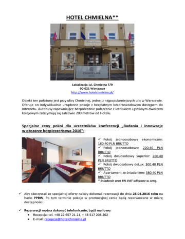 HOTEL CHMIELNA** Lokalizacja: ul. Chmielna 7/9 00-021 Warszawa http://www.hotelchmielna.pl/ Obiekt ten położony jest przy ulicy Chmielnej, jednej z najpopularniejszych ulic w Warszawie. Oferuje on indywidualnie urządzone pokoje z bezpłatnym bezprzewodowym dostępem do Internetu. Autobusy zapewniające bezpośrednie połączenie z lotniskiem i głównym dworcem kolejowym zatrzymują się zaledwie 200 metrów od Hotelu. Specjalne ceny pokoi dla uczestników konferencji „Badania i innowacje w obszarze bezpieczeństwa 2016”: Pokój jednoosobowy ekonomiczny: 180.40 PLN BRUTTO Pokój jednoosobowy: 220.40 PLN BRUTTO Pokój dwuosobowy Superior: 260.40 PLN BRUTTO Pokój dwuosobowy deLux: 300.40 PLN BRUTTO Apartament ze śniadaniem: 380.40 PLN BRUTTO * śniadanie oraz 8% VAT wliczone w cenę. Aby skorzystać ze specjalnej oferty należy dokonać rezerwacji do dnia 28.04.2016 roku na hasło PPBW. Po tym terminie pokoje w promocyjnej cenie będą rezerwowane w miarę dostępności. Rezerwacji można dokonać telefonicznie, bądź mailowo: Recepcja: tel. +48 22 657 21 21, + 48 517 208 202 E-mail: [email protected]