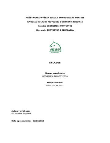 PAŃSTWOWA WYŻSZA SZKOŁA ZAWODOWA W KONINIE WYDZIAŁ KULTURY FIZYCZNEJ I OCHRONY ZDROWIA Katedra EKONOMIKI TURYSTYKI Kierunek: TURYSTYKA I REKREACJA SYLABUS Nazwa przedmiotu GEOGRAFIA TURYSTYCZNA Kod przedmiotu TiR III_03_SS_2012 Autorzy sylabusa: Dr Jarosław Styperek Data opracowania: 12.04.2012 1. Podstawowe informacje Poziom kształcenia studia pierwszego stopnia Profil kształcenia praktyczny Forma studiów stacjonarne Rok studiów I Semestr I Moduł kształcenia kierunkowy Forma zajęć wykłady/ćwiczenia Wymiar godzinowy 30/30 Liczba punktów ECTS 5 Język wykładowy polski Forma zaliczenia zaliczenie z oceną i egzamin Rok akademicki 2012/2013 2. Cele kształcenia C01 Zapoznanie z atrakcjami turystycznymi wybranych regionów turystycznych C02 Wypracowanie umiejętności pozyskiwania i prezentowania informacji dotyczących atrakcyjności turystycznej C03 Zrozumienie współczesnych trendów w światowym ruchu turystycznym 3. Wymagania wstępne Student, który rozpoczyna zajęcia z przedmiotu: Posiada podstawową wiedzę z zakresu geografii fizycznej i społeczno – ekonomicznej świata Posiada umiejętność dostrzegania związków i zależności pomiędzy poszczególnymi sferami środowiska geograficznego Potrafi pracować w zespołach (podgrupach) i prezentować posiadaną wiedzę 4. Efekty kształcenia Tabela odniesień przedmiotowych efektów kształcenia do efektów kierunkowych i obszarowych Symbol P_W01 P_W02 P_U01 Efekty kształcenia dla przedmiotu Krajoznawstwo Student, który zaliczył przedmiot: Ma uporządkowaną wiedzę ogólną związaną z aktualnymi trendami w turystyce światowej Potrafi zdefiniować podstawowe pojęcia związane wybranym kierunkiem studiów i wybraną specjalnością Posiada umiejętność rozumienia i analizowania zjawisk społecznych, przyrodniczych i innych występujących w turystyce i rekreacji Odniesienie do efektów kształcenia dla kierunku studiów turystyka i rekreacja Odniesienie do efektów kształcenia w obszarze kształcenia w zakresie nauk przyrodniczych K_W01 P1P_W01 K_W02 P1P_W05 K_U04 P1P_U07 P_K01 Rozumie potrzebę poszerzania wiedzy K_K01 P1P_K01 P_K02 Potrafi współdziałać i pracować w grupie, przyjmując w niej różne role K_K03 P1P_K02 2 5. Treści kształcenia WYK01 WYK02 WYKŁADY Wprowadzenie w przedmiot geografia turystyczna Mapy turystyczne jako podstawowe źródło informacji turystycznej liczba godzin 2 2 Wykorzystanie internetu i programów komputerowych w uzyskiwaniu WYK03 informacji turystycznej 2 WYK04 Metody oceny atrakcyjności środowiska geograficznego dla potrzeb turystyki 2 Rozwój, uwarunkowania i obecny stan ruchu turystycznego w Europie i na WYK05 2 świecie Obiekty z listy światowego dziedzictwa przyrodniczego i kulturalnego WYK06 WYK07 2 UNESCO Rola obszarów chronionych w aspekcie atrakcyjności turystycznej 2 Charakterystyka atrakcyjności turystycznej regionu na przykładzie basenu WYK08 4 Morza Śródziemnego WYK09 Charakterystyka atrakcyjności turystycznej na przykładzie wybranych państw 6 WYK10 Charakterystyka atrakcyjności turystycznej na przykładzie wybranych miast 6 ogółem 30 ĆWICZENIA liczba godzin ĆW01 Wprowadzenie w przedmiot geografia turystyczna i organizacja zajęć 2 ĆW02 Proces czytania mapy topograficznej 2 ĆW03 Mapa wysokości – opracowanie graficzne 4 ĆW04 Kartogram – opracowanie graficzne 4 ĆW05 Ocena atrakcyjności turystycznej środowiska geograficznego – opracowanie graficzne 4 ĆW06 Zaliczenie znajomości mapy świata 2 ĆW07 Prezentacja atrakcyjności turystycznej wybranych regionów – prezentacja multimedialna ĆW08 Kolokwium, zaliczenie przedmiotu ogółem 10 2 30 6. Metody kształcenia MK01 Wykład z elementami dyskusji MK02 Prezentacja multimedialna MK03 Film dydaktyczny 7. Metody oceny (ocena formująca, ocena podsumowująca) OF01 Ocena za przygotowanie do ćwiczeń OF02 Ocena za przygotowanie do prezentacji multimedialnej OP01 Kolokwium OP02 Egzamin 8. Obciążenie pracą studenta liczba godzin Godziny kontaktowe z nauczycielem 60 Praca indywidualna studenta, w tym: 50 • Analiza treści wykładów powiązana ze studiami literaturowymi 10 • Przygotowanie opracowań graficznych 15 3 • Przygotowanie opracowań multimedialnych • Przygotowanie do kolokwium i egzaminu 5 20 Łączne obciążenie pracą studenta 110 9. Liczba punktów ECTS Liczba punktów ECTS, którą student uzyskuje za: • • udział w zajęciach wymagających bezpośredniego udziału nauczycieli i studentów (godziny kontaktowe z nauczycielem) 2 pracę indywidualną 3 Sumaryczna liczba punktów ECTS dla przedmiotu 5 10. Literatura podstawowa J.Warszyńska,2000: Geografia turystyczna świata cz.1 i 2, Wydawnictwo Naukowe PWN, Warszawa J.Makowski, M.Jędrusik, F.Plit, 2010: Geografia turystyczna świata. Nowe trendy. Regiony turystyczne, Wyd. Uniwersytet Warszawski Z.Kruczek, S.Sacha,2003: Europa. Zarys geografii turystycznej, „Proksenia”, Kraków 11. Literatura uzupełniająca T.Bartkowski, 1977: Wypisy do geografii turystycznej, cz.I, Monografie, podręczniki skrypty AWF w Poznaniu, nr 111. J.Kondracki, 1998: Geografia regionalna Polski, Wydawnictwo naukowe PWN, Warszawa 12. Sposoby weryfikacji zakładanych efektów kształcenia Efekty kształcenia dla przedmiotu Cele kształcenia (C) Treści kształcenia (WYK, ĆW, LAB) Metody kształcenia (MK) Metody oceny (OF, OP) P_W01 C01, C03 WYK01 – WYK10 MKO1, MKO2, MKO3 OP01, OP02 P_U01 C02 ĆW02 – ĆW08 MKO1, MKO2 OF01, OF02 P_K01 C01, C02, C03 WYK01, WYK05 MK01, MKO2 OF01, OF02, OP01, OP02 13. Kryteria oceny Efekty kształcenia dla przedmiotu Ocena 2,0 Ocena 3,0 Ocena 3,5 Ocena 4,0 Ocena 4,5 Ocena 5,0 posiada dobre opanowanie wiadomości, ale pozbawione precyzyjności posiada dobre opanowanie wiedzy, którą precyzuje właściwie posiada bardzo dobrze opanowany wymagany zakres wiedzy P_W01 nie posiada wymaganej wiedzy posiada minimum wiedzy zna dostatecznie wymagany zakres wiedzy P_U01 nie posiada wymaganych umiejęt