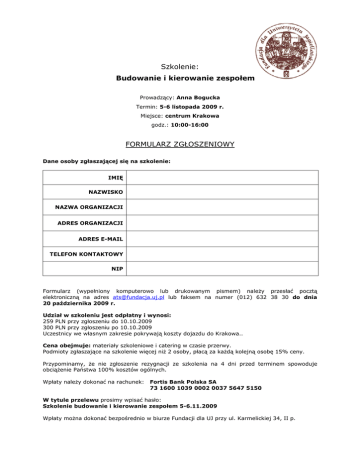 Szkolenie: Budowanie i kierowanie zespołem Prowadzący: Anna Bogucka Termin: 5-6 listopada 2009 r. Miejsce: centrum Krakowa godz.: 10:00-16:00 FORMULARZ ZGŁOSZENIOWY Dane osoby zgłaszającej się na szkolenie: IMIĘ NAZWISKO NAZWA ORGANIZACJI ADRES ORGANIZACJI ADRES E-MAIL TELEFON KONTAKTOWY NIP Formularz (wypełniony komputerowo lub drukowanym pismem) naleŜy przesłać pocztą elektroniczną na adres [email protected] lub faksem na numer (012) 632 38 30 do dnia 20 października 2009 r. Udział w szkoleniu jest odpłatny i wynosi: 259 PLN przy zgłoszeniu do 10.10.2009 300 PLN przy zgłoszeniu po 10.10.2009 Uczestnicy we własnym zakresie pokrywają koszty dojazdu do Krakowa.. Cena obejmuje: materiały szkoleniowe i catering w czasie przerwy. Podmioty zgłaszające na szkolenie więcej niŜ 2 osoby, płacą za kaŜdą kolejną osobę 15% ceny. Przypominamy, Ŝe nie zgłoszenie rezygnacji ze szkolenia na 4 dni przed terminem spowoduje obciąŜenie Państwa 100% kosztów ogólnych. Wpłaty naleŜy dokonać na rachunek: Fortis Bank Polska SA 73 1600 1039 0002 0037 5647 5150 W tytule przelewu prosimy wpisać hasło: Szkolenie budowanie i kierowanie zespołem 5-6.11.2009 Wpłaty moŜna dokonać bezpośrednio w biurze Fundacji dla UJ przy ul. Karmelickiej 34, II p.