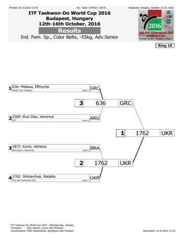Printed: 16.10.2016 12:53 Div. Code: CAFS55 / 26141 Budapest, Hungary, October 12-16, 2016 ITF Taekwon-Do World Cup 2016 Budapest, Hungary 12th-16th October, 2016 Results Ind. Fem. Sp., Color Belts, -55kg, Adv.Senior Ring 10 1 636: Maliasa, Efthymia Athletic Club "Analipsis" place: 2 3 2 1569: Ruiz Diaz, Veronica FATI place: 3 GRC 636 GRC ARG 1 3 1872: Kuniy, Adriana ABT/Classe a Taekwondo place: 3 2 4 1762: Shkliarchuk, Nataliia True Way Taekwondo Club ITF Taekwon-Do World Cup 2014 - Montego Bay, Jamaica Champion : ARG Giberto, Laura (Not Present) Vicechampion: ENG Abdulwahab, Agnieszka (Not Present) place: 1 1762 UKR BRA 1762 UKR UKR Generated: 16.10.2016 12:10