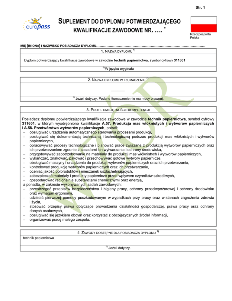 Str. 1 SUPLEMENT DO DYPLOMU POTWIERDZAJĄCEGO KWALIFIKACJE ZAWODOWE NR. …. * Rzeczpospolita Polska IMIĘ (IMIONA) I NAZWISKO POSIADACZA DYPLOMU…………………………………………………………………………………… 1. NAZWA DYPLOMU 1) Dyplom potwierdzający kwalifikacje zawodowe w zawodzie technik papiernictwa, symbol cyfrowy 311601 1) W języku oryginału 2. NAZWA DYPLOMU W TŁUMACZENIU 1) _______ 1) Jeżeli dotyczy. Podane tłumaczenie nie ma mocy prawnej. 3. PROFIL UMIEJĘTNOŚCI I KOMPETENCJI Posiadacz dyplomu potwierdzającego kwalifikacje zawodowe w zawodzie technik papiernictwa, symbol cyfrowy 311601, w którym wyodrębniono kwalifikacje A.57. Produkcja mas włóknistych i wytworów papierniczych i A.58. Przetwórstwo wytworów papierniczych, potrafi: – obsługiwać urządzenia automatycznego sterowania procesami produkcji, – posługiwać się dokumentacją techniczną i technologiczną podczas produkcji mas włóknistych i wytworów papierniczych, – opracowywać procesy technologiczne i planować prace związane z produkcją wytworów papierniczych oraz ich przetwarzaniem zgodnie z zasadami ich wytwarzania i ochrony środowiska, – przygotowywać zapotrzebowanie na materiały do produkcji mas włóknistych i wytworów papierniczych, – wykańczać, znakować, pakować i przechowywać gotowe wytwory papiernicze, – obsługiwać maszyny i urządzenia do produkcji wytworów papierniczych oraz ich przetwarzania, – kontrolować produkcję wytworów papierniczych oraz ich przetwarzanie, – oceniać jakość półproduktów i mieszanek uszlachetniających, – zabezpieczać materiały i produkty papiernicze przed wpływem czynników szkodliwych, – gospodarować racjonalnie substancjami chemicznymi oraz energią, a ponadto, w zakresie wykonywanych zadań zawodowych: – przestrzegać przepisów bezpieczeństwa i higieny pracy, ochrony przeciwpożarowej i ochrony środowiska oraz wymagań ergonomii, – udzielać pierwszej pomocy poszkodowanym w wypadkach przy pracy oraz w stanach zagrożenia zdrowia i życia, – stosować przepisy prawa dotyczące prowadzenia działalności gospodarczej, prawa pracy oraz ochrony danych osobowych, – posługiwać się językiem obcym oraz korzystać z obcojęzycznych źródeł informacji, – organizować pracę małego zespołu. 4. ZAWODY DOSTĘPNE DLA POSIADACZA DYPLOMU technik papiernictwa 1) Jeżeli dotyczy. 1) Str. 2 5.PODSTAWA WYDANIA DYPLOMU Nazwa podmiotu wydającego dyplom Okręgowa Komisja Egzaminacyjna w …………………………. Nazwa władz sprawujących nadzór nad podmiotem wydającym dyplom Minister Edukacji Narodowej Poziom wykształcenia (krajowy lub międzynarodowy) ISCED 4 Warunki zdania egzaminu potwierdzającego kwalifikacje w zawodzie Egzamin przeprowadzany jest z każdej kwalifikacji wyodrębnionej w zawodzie. Warunkiem zdania egzaminu zawodowego, złożonego z dwóch części, jest uzyskanie: 1) z części pisemnej - co najmniej 50% punktów możliwych do uzyskania, 2) z części praktycznej - co najmniej 75% punktów możliwych do uzyskania. Dostęp do następnego poziomu kształcenia Jeżeli posiadacz dyplomu uzyskał świadectwo dojrzałości, może kontynuować kształcenie w szkole wyższej. Umowy międzynarodowe _______ Podstawa prawna wydania dyplomu stosowne rozporządzenie 6. OFICJALNIE UZNANE SPOSOBY UZYSKANIA DYPLOMU Posiadacz dyplomu uzyskał wykształcenie średnie oraz zdał egzaminy potwierdzające kwalifikacje A.57. Produkcja mas włóknistych i wytworów papierniczych i A.58. Przetwórstwo wytworów papierniczych w zawodzie technik papiernictwa. Kwalifikacje wyodrębnione w tym zawodzie są możliwe do uzyskania w ramach poniższych sposobów nabywania kwalifikacji: Możliwe sposoby nabywania kwalifikacji w zawodzie technik papiernictwa Udział kształcenia teoretycznego/praktycznego (%) Kształcenie w szkole (4-letnie technikum) Kształcenie ustawiczne w formach pozaszkolnych (minimalna liczba godzin kształcenia określona w podstawie programowej kształcenia w zawodach) Potwierdzanie kwalifikacji w trybie egzaminów eksternistycznych dla osób, które ukończyły gimnazjum albo 8-letnią szkołę podstawową oraz: a) co najmniej 2 lata kształciły się w zawodzie lub b) co najmniej 2 lata pracowały w zawodzie 50/50 50/50 50/50 0/100 Informacje dodatkowe: Okręgowa Komisja Egzaminacyjna w ………………………, e-mail: Więcej informacji (w tym opis krajowego systemu kwalifikacji) można znaleźć w Internecie pod adresem: www.men.gov.pl, www.koweziu.edu.pl Krajowy punkt informacyjny: www.europass.org.pl *Nota objaśniająca Niniejszy dokument ma na celu dostarczenie dodatkowych informacji na temat dyplomu potwierdzającego kwalifikacje zawodowe i sam w sobie nie ma mocy prawnej. Podstawą opisu są następujące teksty: Rezolucja Rady nr 93/C 49/01 z dnia 3 grudnia 1992 r. dotycząca przejrzystości kwalifikacji, Rezolucja Rady nr 96/C 224/04 z dnia 15 lipca 1996 r. dotycząca przejrzystości dyplomów szkolenia zawodowego, Zalecenie Parlamentu Europejskiego oraz Rady nr 2001/613/EC z dnia 10 lipca 2001 r. w sprawie mobilności w ramach Wspólnoty studentów, osób przechodzących szkolenia, wolontariuszy, nauczycieli i instruktorów. Więcej informacji można uzyskać pod adresem: http://europass.cedefop.eu.int © European Communities 2002