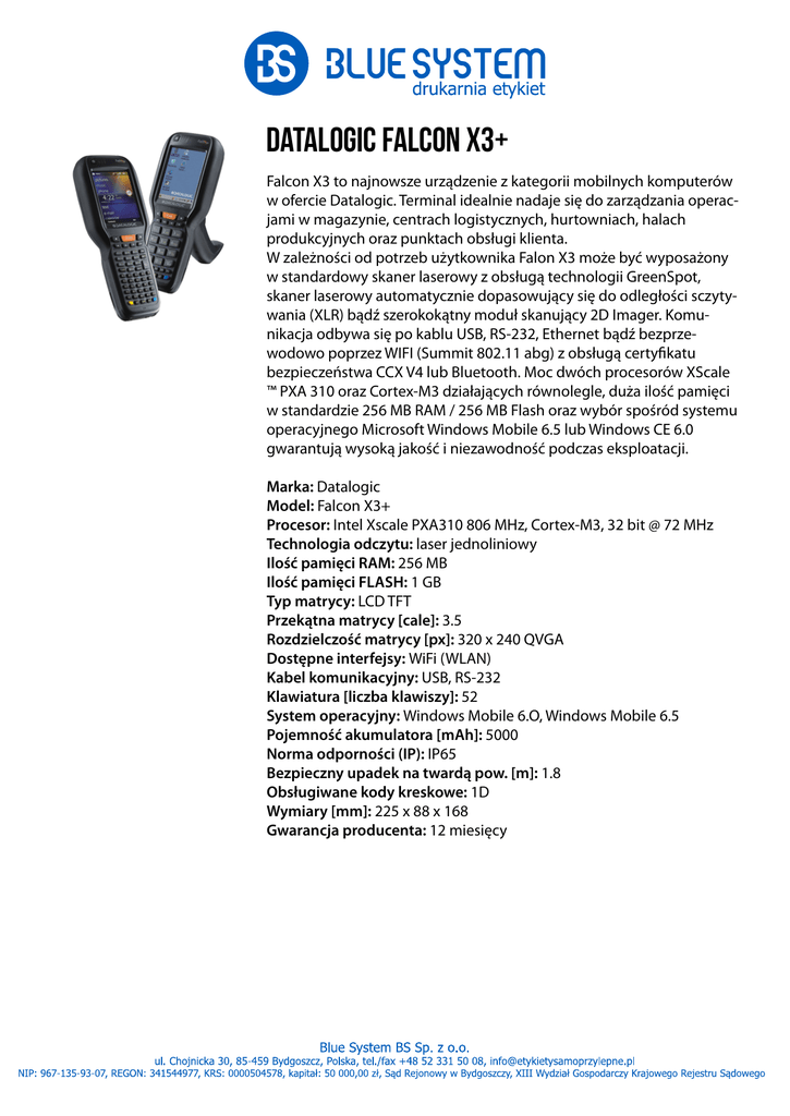 Datalogic Falcon X3+ Falcon X3 to najnowsze urządzenie z kategorii mobilnych komputerów w ofercie Datalogic. Terminal idealnie nadaje się do zarządzania operacjami w magazynie, centrach logistycznych, hurtowniach, halach produkcyjnych oraz punktach obsługi klienta. W zależności od potrzeb użytkownika Falon X3 może być wyposażony w standardowy skaner laserowy z obsługą technologii GreenSpot, skaner laserowy automatycznie dopasowujący się do odległości sczytywania (XLR) bądź szerokokątny moduł skanujący 2D Imager. Komunikacja odbywa się po kablu USB, RS-232, Ethernet bądź bezprzewodowo poprzez WIFI (Summit 802.11 abg) z obsługą certyfikatu bezpieczeństwa CCX V4 lub Bluetooth. Moc dwóch procesorów XScale ™ PXA 310 oraz Cortex-M3 działających równolegle, duża ilość pamięci w standardzie 256 MB RAM / 256 MB Flash oraz wybór spośród systemu operacyjnego Microsoft Windows Mobile 6.5 lub Windows CE 6.0 gwarantują wysoką jakość i niezawodność podczas eksploatacji. Marka: Datalogic Model: Falcon X3+ Procesor: Intel Xscale PXA310 806 MHz, Cortex-M3, 32 bit @ 72 MHz Technologia odczytu: laser jednoliniowy Ilość pamięci RAM: 256 MB Ilość pamięci FLASH: 1 GB Typ matrycy: LCD TFT Przekątna matrycy [cale]: 3.5 Rozdzielczość matrycy [px]: 320 x 240 QVGA Dostępne interfejsy: WiFi (WLAN) Kabel komunikacyjny: USB, RS-232 Klawiatura [liczba klawiszy]: 52 System operacyjny: Windows Mobile 6.O, Windows Mobile 6.5 Pojemność akumulatora [mAh]: 5000 Norma odporności (IP): IP65 Bezpieczny upadek na twardą pow. [m]: 1.8 Obsługiwane kody kreskowe: 1D Wymiary [mm]: 225 x 88 x 168 Gwarancja producenta: 12 miesięcy