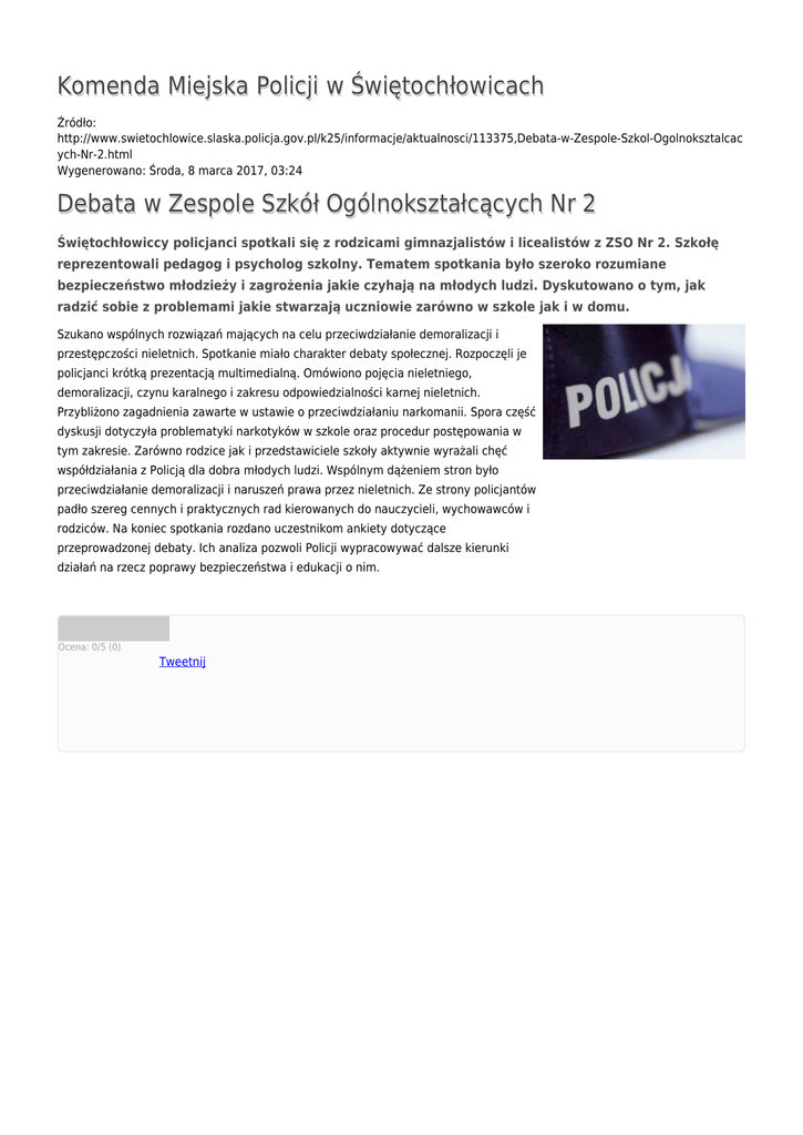 Komenda Miejska Policji w Świętochłowicach Źródło: http://www.swietochlowice.slaska.policja.gov.pl/k25/informacje/aktualnosci/113375,Debata-w-Zespole-Szkol-Ogolnoksztalcac ych-Nr-2.html Wygenerowano: Środa, 8 marca 2017, 03:24 Debata w Zespole Szkół Ogólnokształcących Nr 2 Świętochłowiccy policjanci spotkali się z rodzicami gimnazjalistów i licealistów z ZSO Nr 2. Szkołę reprezentowali pedagog i psycholog szkolny. Tematem spotkania było szeroko rozumiane bezpieczeństwo młodzieży i zagrożenia jakie czyhają na młodych ludzi. Dyskutowano o tym, jak radzić sobie z problemami jakie stwarzają uczniowie zarówno w szkole jak i w domu. Szukano wspólnych rozwiązań mających na celu przeciwdziałanie demoralizacji i przestępczości nieletnich. Spotkanie miało charakter debaty społecznej. Rozpoczęli je policjanci krótką prezentacją multimedialną. Omówiono pojęcia nieletniego, demoralizacji, czynu karalnego i zakresu odpowiedzialności karnej nieletnich. Przybliżono zagadnienia zawarte w ustawie o przeciwdziałaniu narkomanii. Spora część dyskusji dotyczyła problematyki narkotyków w szkole oraz procedur postępowania w tym zakresie. Zarówno rodzice jak i przedstawiciele szkoły aktywnie wyrażali chęć współdziałania z Policją dla dobra młodych ludzi. Wspólnym dążeniem stron było przeciwdziałanie demoralizacji i naruszeń prawa przez nieletnich. Ze strony policjantów padło szereg cennych i praktycznych rad kierowanych do nauczycieli, wychowawców i rodziców. Na koniec spotkania rozdano uczestnikom ankiety dotyczące przeprowadzonej debaty. Ich analiza pozwoli Policji wypracowywać dalsze kierunki działań na rzecz poprawy bezpieczeństwa i edukacji o nim. Ocena: 0/5 (0) Tweetnij