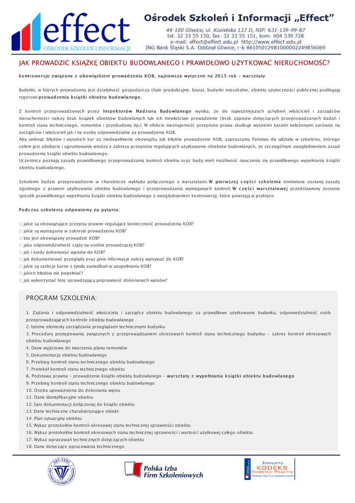 JAK PROWADZIĆ KSIĄŻKĘ OBIEKTU BUDOWLANEGO I PRAWIDŁOWO UŻYTKOWAĆ NIERUCHOMOŚĆ? ko ntro we rsje związa ne z o b o wiązkie m p ro wa d ze nia K O B, na jno wsze wytyc zne na 20 1 5 ro k wa rszta ty Budynki, w których prowadzona jest działalność gospodarcza (hale produkcyjne, biura), budynki mieszkalne, obiekty użyteczności publicznej podlegają rygorowi p ro wa d ze nia książki o b ie ktu b ud o wla ne g o . Z kontroli przeprowadzonych przez Insp e kto ró w N a d zo ru Bud o wla ne g o wynika, że do najważniejszych uchybień właścicieli i zarządców nieruchomości należy brak książek obiektów budowlanych lub ich niewłaściwe prowadzenie (brak zapisów dotyczących przeprowadzanych badań i kontroli stanu technicznego, remontów i przebudowy itp.). W efekcie nieznajomość przepisów prawa skutkuje wysokimi karami nałożonymi zarówno na zarządców i właścicieli jak i na osoby odpowiedzialne za prowadzenie KOB. Aby uniknąć błędów i wysokich kar za niedopełnienie obowiązku lub błędne prowadzenie KOB, zapraszamy Państwa do udziału w szkoleniu, którego celem jest zdobycie i ugruntowanie wiedzy z zakresu przepisów regulujących użytkowanie obiektów budowlanych, ze szczególnym uwzględnieniem zasad prowadzenia książki obiektu budowlanego. Uczestnicy poznają zasady prawidłowego przeprowadzania kontroli obiektu oraz będą mieli możliwość nauczenia się prawidłowego wypełniania książki obiektu budowlanego. Szkolenie będzie przeprowadzone w charakterze wykładu połączonego z warsztatami. W p ie rwsze j c zę śc i szko le nia omówione zostaną zasady zgodnego z prawem użytkowania obiektu budowlanego i przeprowadzania wymaganych kontroli. W c zę śc i wa rszta to we j przedstawiony zostanie sposób prawidłowego wypełniania książki obiektu budowlanego z uwzględnieniem kontrowersji, które powstają w praktyce. P o d c za s szko le nia o d p o wie my na p yta nia : jakie są obowiązujące przepisy prawne regulujące konieczność prowadzenia KOB? jakie są wymagania w zakresie prowadzenia KOB? kto jest obowiązany prowadzić KOB? jaka odpowiedzialność ciąży na osobie prowadzącej KOB? jak i kiedy dokonywać wpisów do KOB? jak dokumentować przeglądy oraz jakie informacje należy wpisywać do KOB? jakie są sankcje karne z tytułu zaniedbań w uzupełnianiu KOB? jakich błędów nie popełniać? jak wykorzystać listę sprawdzającą poprawność dokonanych wpisów? PROGRAM SZKOLENIA: 1. Zadania i odpowiedzialność właściciela i zarządcy obiektu budowlanego za prawidłowe użytkowanie budynku, odpowiedzialność osób przeprowadzających kontrole obiektu budowlanego 2. Istotne elementy zarządzania przeglądami technicznymi budynku 3. Procedury postępowania związanych z przeprowadzaniem okresowych kontroli stanu technicznego budynku - zakres kontroli okresowych obiektu budowlanego 4. Dane wyjściowe do tworzenia planu remontów 5. Dokumentacja obiektu budowlanego 6. Przebieg kontroli stanu technicznego obiektu budowlanego 7. Protokół kontroli stanu technicznego obiektu 8. Podstawa prawna - prowadzenie książki obiektu budowlanego - wa rszta ty z wyp e łnia nia książki o b ie ktu b ud o wla ne g o 9. Przebieg kontroli stanu technicznego obiektu budowlanego 10. Osoba upoważniona do dokonania wpisu 11. Dane identyfikacyjne obiektu 12. Spis dokumentacji dołączonej do książki obiektu 13. Dane techniczne charakteryzujące obiekt 14. Plan sytuacyjny obiektu 15. Wykaz protokołów kontroli okresowej stanu technicznej sprawności obiektu 16. Wykaz protokołów kontroli okresowych stanu technicznej sprawności i wartości użytkowej całego obiektu 17. Wykaz opracowań technicznych dotyczących obiektu 18. Dane dotyczące opracowania technicznego 19. Wykaz protokołów odbioru robót remontowych i modernizacyjnych w obiekcie 20. Dane dotyczące dokumentacji technicznej 21. Wykaz protokołów awarii i katastrof obiektu 22. Zmiana sposobu użytkowania obiektu 23. Uprawnienia organu nadzoru budowlanego w przypadku stwierdzenia nieodpowiedniego stanu technicznego obiektu lub innych nieprawidłowości w jego użytkowaniu METODY PROWADZENIA WARSZTATÓW: Szkolenie będzie prowadzone systemem interaktywnym, tj. metodą aktywnego uczestnictwa słuchaczy w zajęciach. praca z dokumentem (analiza i wypełnianie KOB - warsztaty) dyskusja kierowana omawianie problemów praktycznych rozwiązywanie problemów praktycznych tzw. kazusów SZKOLENIE ADRESOWANE JEST DO: właścicieli budynków firmowych, członków zarządów przedsiębiorstw, osób prowadzących działalność gospodarczą we własnych budynkach, pracowników firm produkcyjnych, którzy są odpowiedzialni za stan techniczny hal produkcyjnych, magazynów, biurowców i innych obiektów, pracowników, którzy zarządzają obiektami użyteczności publicznej członków i zarządców wspólnot mieszkaniowych, administratorów i zarządców nieruchomości i spółdzielni mieszkaniowych, zarządców budynków komunalnych wszystkich osób, które są odpowiedzialne za przeglądy nieruchomości i prowadzenie KOB WYKŁADOWCĄ NA SZKOLENIU BĘDZIE: N ie za le żny Inżynie r K o nsulta nt posiada certyfikat Stowarzyszenia Inżynierów Doradców i Rzeczoznawców EFCA, jest członkiem Międzynarodowej Federacji Inżynierów Konsultantów FIDIC / SIDIR, Rzeczoznawcą Kosztorysowym Stowarzyszenia Kosztorysantów Budowlanych, współautorem dokumentacji przetargowych dla realizacji inwestycji finansowanych z funduszy ISPA, Phare, Spójności oraz PO IiŚ. Ekspert zarządzania kosztami przedsięwzięcia budowlanego. Członek Zarządu Stowarzyszenia Kosztorysantów Budowlanych. Wykładowca praktyk na Studiach Podyplomowych na Politechnice Śląskiej oraz Politechnice Krakowskiej z zakresu przygotowania do realizacji i rozliczania inwestycji finansowanych z funduszy UE. Na co dzień wspiera inwestorów w postępowaniach związanych z ustaleniem warunków zabudowy i zagospodarowania terenu