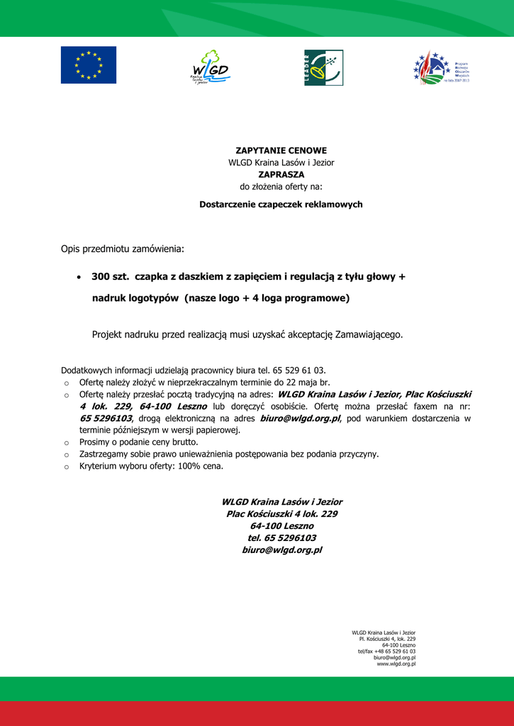 ZAPYTANIE CENOWE WLGD Kraina Lasów i Jezior ZAPRASZA do złożenia oferty na: Dostarczenie czapeczek reklamowych Opis przedmiotu zamówienia: 300 szt. czapka z daszkiem z zapięciem i regulacją z tyłu głowy + nadruk logotypów (nasze logo + 4 loga programowe) Projekt nadruku przed realizacją musi uzyskać akceptację Zamawiającego. Dodatkowych informacji udzielają pracownicy biura tel. 65 529 61 03. o Ofertę należy złożyć w nieprzekraczalnym terminie do 22 maja br. o Ofertę należy przesłać pocztą tradycyjną na adres: WLGD Kraina Lasów i Jezior, Plac Kościuszki 4 lok. 229, 64-100 Leszno lub doręczyć osobiście. Ofertę można przesłać faxem na nr: 65 5296103, drogą elektroniczną na adres [email protected], pod warunkiem dostarczenia w terminie późniejszym w wersji papierowej. o Prosimy o podanie ceny brutto. o Zastrzegamy sobie prawo unieważnienia postępowania bez podania przyczyny. o Kryterium wyboru oferty: 100% cena. WLGD Kraina Lasów i Jezior Plac Kościuszki 4 lok. 229 64-100 Leszno tel. 65 5296103 [email protected] WLGD Kraina Lasów i Jezior Pl. Kościuszki 4, lok. 229 64-100 Leszno tel/fax +48 65 529 61 03 [email protected] www.wlgd.org.pl