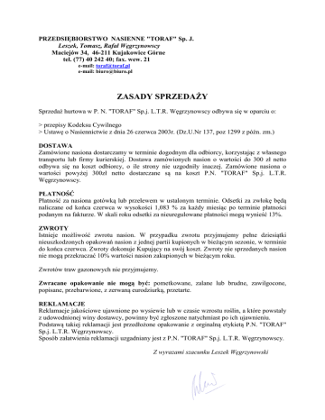 PRZEDSIĘBIORSTWO NASIENNE "TORAF" Sp. J. Leszek, Tomasz, Rafał Węgrzynowscy Maciejów 34, 46-211 Kujakowice Górne tel. (77) 40 242 40; fax. wew. 21 e-mail: [email protected] e-mail: [email protected] ZASADY SPRZEDAŻY Sprzedaż hurtowa w P. N. "TORAF" Sp.j. L.T.R. Węgrzynowscy odbywa się w oparciu o: > przepisy Kodeksu Cywilnego > Ustawę o Nasiennictwie z dnia 26 czerwca 2003r. (Dz.U.Nr 137, poz 1299 z późn. zm.) DOSTAWA Zamówione nasiona dostarczamy w terminie dogodnym dla odbiorcy, korzystając z własnego transportu lub firmy kurierskiej. Dostawa zamówionych nasion o wartości do 300 zł netto odbywa się na koszt odbiorcy, o ile strony nie uzgodniły inaczej. Zamówione nasiona o wartości powyżej 300zł netto dostarczane są na koszt P.N. "TORAF" Sp.j. L.T.R. Węgrzynowscy. PŁATNOŚĆ Płatność za nasiona gotówką lub przelewem w ustalonym terminie. Odsetki za zwłokę będą naliczane od końca czerwca w wysokości 1,083 % za każdy miesiąc po terminie płatności podanym na fakturze. W skali roku odsetki za nieuregulowane płatności mogą wynieść 13%. ZWROTY Istnieje możliwość zwrotu nasion. W przypadku zwrotu przyjmujemy pełne dziesiątki nieuszkodzonych opakowań nasion z jednej partii kupionych w bieżącym sezonie, w terminie do końca czerwca. Zwroty dokonuje Kupujący na swój koszt. Zwroty nie sprzedanych nasion nie mogą przekraczać 10% wartości nasion zakupionych w bieżącym roku. Zwrotów traw gazonowych nie przyjmujemy. Zwracane opakowanie nie mogą być: pometkowane, zalane lub brudne, zawilgocone, popisane, przebarwione, z zerwaną eurodziurką, przetarte. REKLAMACJE Reklamacje jakościowe ujawnione po wysiewie lub w czasie wzrostu roślin, a które powstały z udowodnionej winy dostawcy, powinny być zgłoszone natychmiast po ich ujawnieniu. Podstawą takiej reklamacji jest przedłożone opakowanie z orginalną etykietą P.N. "TORAF" Sp.j. L.T.R. Węgrzynowscy. Sposób załatwienia reklamacji uzgadniany jest z P.N. "TORAF" Sp.j. L.T.R. Węgrzynowscy. Z wyrazami szacunku Leszek Węgrzynowski