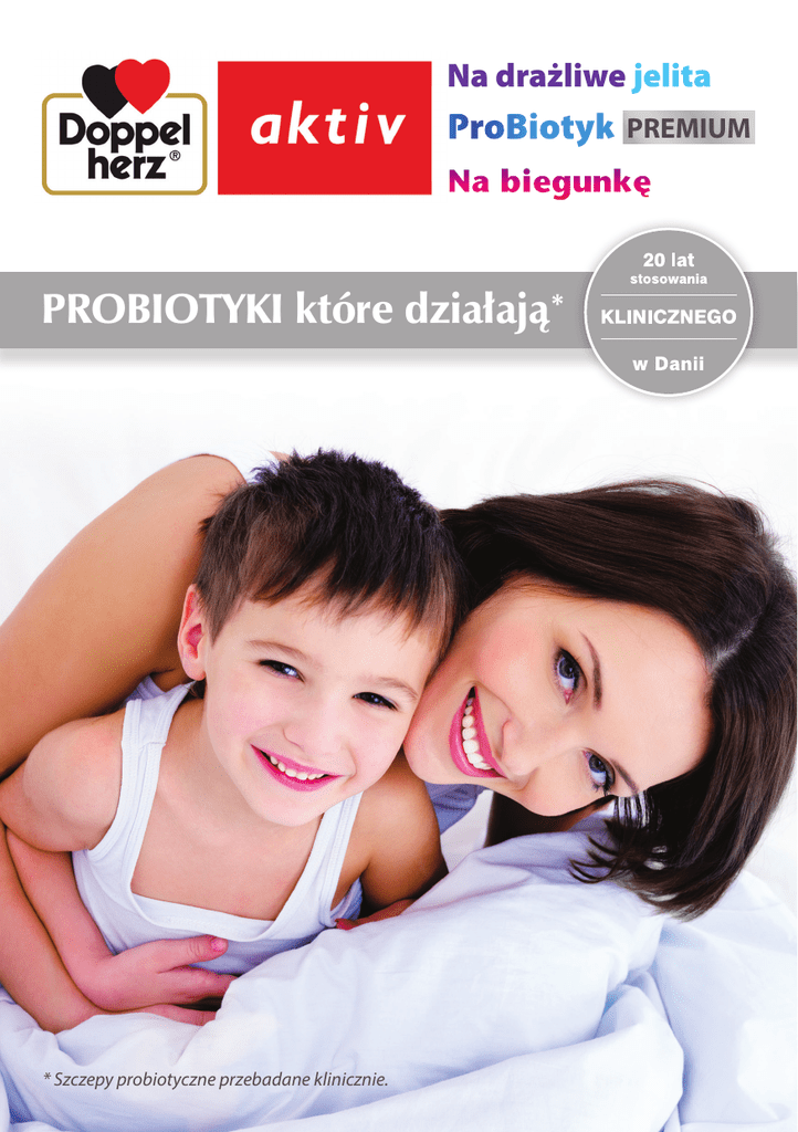 Na drażliwe jelita PREMIUM PROBIOTYKI które działają* * Szczepy probiotyczne przebadane klinicznie. Zdrowy brzuch to brzuch, którego nie czujesz Zdrowy układ pokarmowy zapewnia Ci komfort i prawidłowe trawienie bez wzdęć, odbijania i bolesnych gazów jelitowych oraz gwarantuje regularny cykl wypróżnień. Na zdrowie naszego układu pokarmowego ma wpływ kilka czynników – niektóre z nich zależą od nas samych, inne – nie. Prawidłowa dieta i sportowy tryb życia są z pewnością korzystne dla brzucha, ale czasami to nie wystarcza. Stres, nieregularny tryb życia, przemysłowo przetworzona żywność z wieloma sztucznymi dodatkami, używki oraz stosowanie leków zakłóca regulację pracy przewodu pokarmowego. Dla zachowania równowagi flory jelitowej konieczne może być wtedy regularne stosowanie bakterii probiotycznych, zwykle bakterii kwasu mlekowego. Czym są bakterie probiotyczne? Pro bios w języku greckim oznacza „dla życia” Bakterie probiotyczne to korzystne dla zdrowia żywe mikroorganizmy (drobnoustroje), stanowiące naturalny element mikroflory jelitowej. Termin „probiotyczny” odnosi się do ogromnej liczby mikroorganizmów, ale ich korzystne działanie zależy od przynależności do szczepu, a nie do gatunku. Korzystnie działający szczep musi mieć ściśle określone cechy genetyczne i fizjologiczne, umożliwiające wytwarzanie pewnych enzymów i białek. To działanie można porównać do jakości wina, która zależy nie tylko od rodzaju wina (np. Cabernet), ale przede wszystkim od konkretnej winnicy i roku zbioru. Równie precyzyjnie klasyfikuje się bakterie probiotyczne: Lactobacillus rhamnosus rodzaj gatunek 19070 szczep Najkorzystniejsze działanie wywierają jedynie bakterie pochodzenia ludzkiego, czyli te, które naturalnie zasiedlają jelita i współpracują z nabłonkiem jelitowym na zasadzie symbiozy. Dla wspomagania odporności 70% układu odpornościowego zlokalizowane jest w obrębie przewodu pokarmowego. Bakterie probiotyczne, zasiedlając jelita, ściśle współpracują z komórkami układu odpornościowego w jelitach i dzięki temu bronią nasz organizm przed bakteriami chorobotwórczymi. Zrównoważona mikroflora poprawia również przyswajanie substancji odżywczych z jedzenia i potrafi wytwarzać wiele witamin. Dla poprawy komfortu życia Stresujące życie, niezdrowe jedzenie, używki oraz stosowanie leków niekorzystnie wpływają na funkcjonowanie układu trawiennego, co może przekładać się na nasze codzienne samopoczucie. Stosowanie odpowiednio dobranych i przebadanych bakterii probiotycznych może być dobrym rozwiązaniem dla poprawy komfortu codziennego życia. Najefektywniejsze są szczepy bakterii precyzyjnie wyselekcjonowane metodami genetycznymi i biochemicznymi oraz przebadane klinicznie. ZESPÓŁ JELITA DRAŻLIWEGO (IBS*) Zacznij dzień z komfortem w brzuchu Znasz to uczucie, kiedy brzuch domaga się Twojej ciągłej uwagi, doskwierają Ci wzdęcia, gazy, bóle, biegunka lub zaparcia? Codziennie inne dolegliwości? Uporczywe objawy sprawiają, że nie możesz normalnie funkcjonować? Przejmij kontrolę nad swoim brzuchem, a nie odwrotnie! Problemy te często są efektem zaburzonej równowagi mikroflory jelitowej, którą można odbudować dzięki probiotykowi Doppelherz® aktiv Na drażliwe jelita. Dlaczego Doppelherz® aktiv Na drażliwe jelita? Zwykłe kultury bakterii jogurtowych potrafią tyko poprawić florę jelit. Doppelherz® aktiv Na drażliwe jelita zawiera specjalne szczepy probiotyczne wyizolowane z flory bakteryjnej jelit zdrowych osób. Te specjalne szczepy nie tylko przywracają równowagę flory jelitowej, ale dodatkowo umożliwiają odtworzenie bariery ochronnej nabłonka jelitowego. Dla kogo Doppelherz® aktiv Na drażliwe jelita? Produkt jest przeznaczony dla osób doświadczających dyskomfortu trawiennego z powodu nadmiaru gazów, konieczności częstych wizyt w toalecie lub odwrotnie – uporczywych zaparć. Doppelherz® aktiv Na drażlwe jelita pomaga w bezproblemowym funkcjonowaniu układu trawiennego – szczególnie osobom żyjącym w stresie, prowadzącym nieregularny tryb życia. Zespół jelita drażliwego (IBS) to choroba przewodu pokarmowego o charakterze czynnościowym, charakteryzująca się takimi objawami, jak bóle brzucha, skurcze, gazy i odbijanie oraz biegunki i zaparcia. * Z ang. Irritable Bowel Syndrome. W badaniach klinicznych udowodniono, że po zastosowaniu takiej samej mieszanki bakterii, jaką zawiera Doppelherz® aktiv Na drażliwe jelita, u 85% badanych uzyskano redukcję bólu brzucha i wzdęć, a w 90% przypadków nastąpiło wyeliminowanie biegunek i zaparć. Na drażliwe jelita Dla spokoju brzucha Jedyny synbiotyk przeznaczenia medycznego na IBS zespół jelita drażliwego nietolerancja laktozy zaparcia najwyższa dawka* żywych bakterii (12 miliardów) 4 szczepy probiotyczne o udokumentowanej skuteczności w IBS (zespole jelita drażliwego) dodatek prebiotyku pozwala na szybkie namnażanie bakterii probiotycznych technologia krioprotekcji – synbiotyk 5 generacji opatentowane specjalne zamknięcie opakowania gwarantuje unikalnie długi termin ważności – aż 3 lata bez potrzeby przechowywania w lodówce (wygodny np. w podróży) nie zawiera cukru, laktozy, białka mleka, glutenu ani żelatyny (VegaCaps) * Najwyższa dawka na rynku środków dietetycznych (IMS Health 3/2014). PROBIOTYK – PRZY ANTYBIOTYKOTERAPII Wiele osób odczuwa dyskomfort trawienny podczas stosowania antybiotyków lub tuż po zakończeniu leczenia. Antybiotyki zabijają bowiem nie tylko szkodliwe bakterie, ale również przyjazne bakterie w układzie pokarmowym. Brak przyjaznych bakterii pozwala na szybkie namnażanie się bakterii chorobotwórczych. W większości przypadków (ok. 70%) biegunka poantybiotykowa polega na zaburzeniu równowagi flory jelitowej. Badania wykazały, że uzupełnianie flory bakteryjnej o korzystne bakterie – zarówno w trakcie, jak i po zakończeniu an