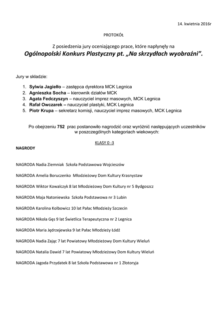 14. kwietnia 2016r PROTOKÓŁ Z posiedze ia jury o e iają ego pra e, które apły ęły a Ogólnopolski Konkurs Plasty zny pt. „Na skrzydła h wyo raźni”. Jury w składzie: 1. 2. 3. 4. 5. Sylwia Jagiełło – zastępca dyrektora MCK Legnica Agnieszka Socha – kierownik działów MCK Agata Fedczyszyn – nauczyciel imprez masowych, MCK Legnica Rafał Owczarek – nauczyciel plastyki, MCK Legnica Piotr Krupa – sekretarz komisji, nauczyciel imprez masowych, MCK Legnica Po obejrzeniu 752 prac postanowiło nagrodzić oraz wyróżnić następujących uczestników w poszczególnych kategoriach wiekowych: KLASY 0 -3 NAGRODY NAGRODA Nadia Zie iak Szkoła Podstawowa Woj ieszów NAGRODA A elia Boru ze ko Młodzieżowy Do Kultury Kras ystaw NAGRODA Wiktor Kowal zyk lat Młodzieżowy Do Kultury r 5 Bydgoszcz NAGRODA Maja Nato iewska Szkoła Podstawowa r Lu i NAGRODA Karoli a Kol owi z lat Pała Młodzieży Sz ze i NAGRODA Nikola Gęs lat Świetli a Terapeuty z a r Leg i a NAGRODA Maria Jędrzejewska lat Pała Młodzieży Łódź NAGRODA Nadia Zają lat Powiatowy Młodzieżowy Do NAGRODA Natalia Dawid 7 lat Powiatowy Młodzieżowy Do Kultury Wieluń Kultury Wieluń NAGRODA Jagoda Przydatek lat Szkoła Podstawowa r Złotoryja WYRÓŻNIENIA WYRÓŻNIENIE Maja Ma tey Pała Młodzieży Warszawa WYRÓŻNIENIE Do i ika Papierz Młodzieżowy Do WYRÓŻNIENIE Mi hali a Sła ek Młodzieżowy Do WYRÓŻNIENIE A elia Głą Kultury Kras ystaw Kultury Kras ystaw lat Powiatowy Młodzieżowy Do Kultury Wieluń WYRÓŻNIENIE Julia Sko ie z a Młodzieżowy Dom Kultury nr 5 Bydgoszcz WYRÓŻNIENIE Le a Nowi ka Młodzieżowy Do Kultury r Bydgosz z WYRÓŻNIENIE Justy a Ga arz Szkoła Podstawowa Ka zorów WYRÓŻNIENIE Julia Tar owska , lat Młodzieżowy Do Kultury Świd i a WYRÓŻNIENIE A elia Będzikowska lat Ognisko Pracy Pozaszkolnej Sierpc WYRÓŻNIENIE Wero ika Pisarska lat Pała Młodzieży Sz ze i WYRÓŻNIENIE Wiktoria Truszkowska lat Pała Młodzieży Sz ze i WYRÓŻNIENIE Iga Paul lat Młodzieżowy Do Kultury Lu i WYRÓŻNIENIE Ala Zwoliński lat Szkoła Podstawowa r WYRÓŻNIENIE Ha Leg i a a Witek lat Pała Młodzieży Sz ze i WYRÓŻNIENIE Natalia Kolawa Szkoła Podstawowa r Lubin KLASY 4 -6 NAGRODY NAGRODA Zofia Głą iak Powiatowe Ce tru NAGRODA Nadia Kopacka Powiatowe Ce tru Eduka ji i Kultury Oleś i a Eduka ji i Kultury Oleś i a NAGRODA Wiktoria Hor a z Powiatowe Ce tru Eduka ji i Kultury Oleś i a NAGRODA Amelia Matusiak 12 lat Pała Młodzieży Sz ze i NAGRODA Le a Witkowska Szkoła Podstawowa r Bielawa NAGRODA Jagienka S e tek lat Pała Młodzieży Łódź NAGRODA Daria Wiś owska Szkoła Podstawowa Stary Ło NAGRODA Ada Lijewska Młodzieżowy Do NAGRODA Karoli a Mi halska Kultury Lidz ark War iński lat Młodzieżowy Do Kultury r Bydgosz z NAGRODA Magdalena Wolanin Szkoła Podstawowa r Leg i a NAGRODA Małgorzata Pabich lat Młodzieżowy Do Kultury – Krzyki – Wro ław NAGRODA Zofia Łukjań zyk lat Szkoła Podstawowa r Złotoryja NAGRODA Julia Ry zyńska lat Młodzieżowy Do NAGRODA Louisa Sta ford NAGRODA Ta ara Leś a lat Młodzieżowy Do Kultury Włodawa Kultury Włodawa lat Młodzieżowe Ce tru Kultury Leg i a WYRÓŻNIENIA WYRÓŻNIENIE Laura Mi or Powiatowe Og isko Pra y Pozaszkol ej „Art” Czechowice – Dziedzice WYRÓŻNIENIE Do i ik Makoś lat Szkoła Podstawowa Szczerbice WYRÓŻNIENIE Sandra Kubera lat Młodzieżowy Do Kultury r Bydgoszcz WYRÓŻNIENIE Aleksa dra Ku iej zyk Szkoła Podstawowa Nowa Wieś Grodziska WYRÓŻNIENIE A elia Mi hal zyk Czechowice – Dziedzice WYRÓŻNIENIE Szymon Olchawa lat Powiatowe Og isko Pra y Pozaszkol ej „Art” lat Młodzieżowy Do WYRÓŻNIENIE Iza Łoś Młodzieżowy Do WYRÓŻNIENIE Jaku Li kiewi z WYRÓŻNIENIE Oliwia Górska Kultury Świd i a Kultury Kras ystaw lat Młodzieżowy Do Kultury Włodawa lat Młodzieżowe Ce tru Kultury Legnica GIMNAZJA i PONADGIMNAZJALNE NAGRODY NAGRODA Filip Kowalski Młodzieżowy Do Kultury r Bydgosz z NAGRODA Małgorzata Borek Szkol o – Gi azjal y Zespół Szkół Miłkowi e NAGRODA Aleksa dra Ke pa lat Młodzieżowy Do Kultury r Bydgosz z NAGRODA Marta Gawełek Powiatowe Og isko Pra y Pozaszkol ej „Art” Czechowice – Dziedzice NAGRODA Szy o Ada zak Młodzieżowe Ce tru NAGRODA Małgorzata Pietku lat Młodzieżowy Do NAGRODA Katarzy a Szy ańska NAGRODA Julia Uriasz Kultury Leg i a Kultury r Bydgosz z lat Og isko Pra y Pozaszkol ej Sierp lat Pała Młodzieży Sz ze i NAGRODA Do i ika Kledzik Młodzieżowy Do Kultury Chodzież NAGRODA Magdale a Jaskot Młodzieżowy Do Kultury Ra i órz NAGRODA Mateusz Bule da lat Młodzieżowy Do Kultury Ra i órz WYRÓŻNIENIA WYRÓŻNIENIE Marek Zagórski lat Młodzieżowe Ce tru WYRÓŻNIENIE Klaudia Ka z arek lat Młodzieżowy Do WYRÓŻNIENIE Wiktoria Jaremko Szkolno – Gi Kultury Leg i a Kultury r Bydgosz z azjal y Zespół Szkół Miłkowi e WYRÓŻNIENIE Nina Bardzińska Młodzieżowy Do Kultury Chodzież WYRÓŻNIENIE Urszula Kru zała Powiatowy Młodzieżowy Do WYRÓŻNIENIE Oliwia Pi dera lat Młodzieżowy Do WYRÓŻNIENIE Marty a Pągielska Gi azju Kultury Otwo k Kultury – Krzyki – Wro ław r Oleś i a WYRÓŻNIENIE Aleksandra Rajczakowska Gimnazjum nr 5 Lubin WYRÓŻNIENIE Ag ieszka Galij WYRÓŻNIENIE Zuza lat Młodzieżowy Do a Olszewska Kultury r Bydgosz z lat Młodzieżowe Ce tru Kultury Leg i a WYRÓŻNIENIE Małgorzata Mat zuk lat Młodzieżowe Centrum Kultury Legnica ***** NAGRODA SPECJALNA ***** Barbara Kuruc 15 lat - MCK Legnica Na ty protokół zakoń zo o.