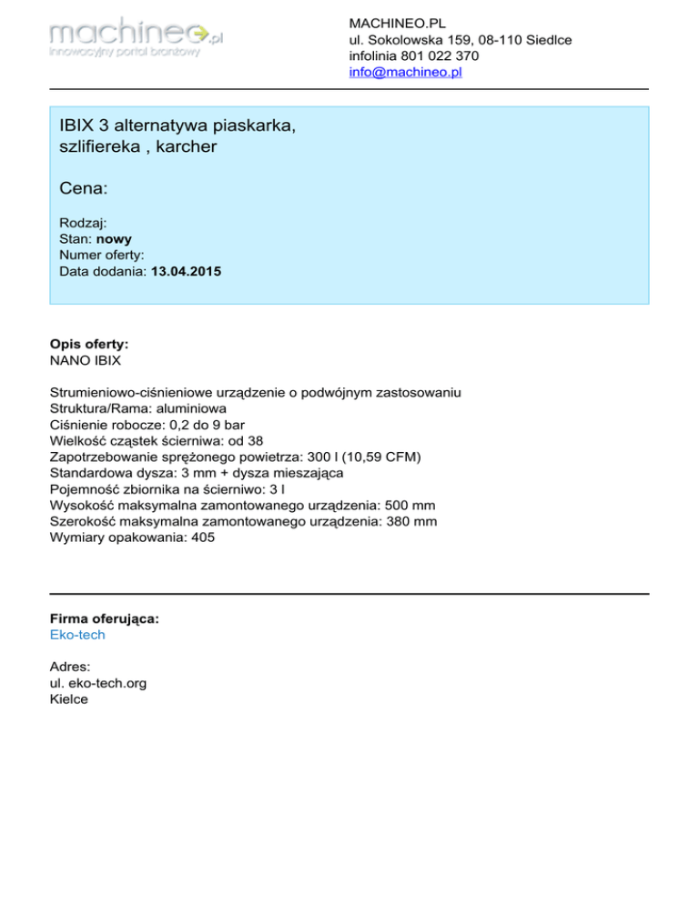 MACHINEO.PL ul. Sokolowska 159, 08-110 Siedlce infolinia 801 022 370 [email protected] IBIX 3 alternatywa piaskarka, szlifiereka , karcher Cena: Rodzaj: Stan: nowy Numer oferty: Data dodania: 13.04.2015 Opis oferty: NANO IBIX Strumieniowo-ciśnieniowe urządzenie o podwójnym zastosowaniu Struktura/Rama: aluminiowa Ciśnienie robocze: 0,2 do 9 bar Wielkość cząstek ścierniwa: od 38 Zapotrzebowanie sprężonego powietrza: 300 l (10,59 CFM) Standardowa dysza: 3 mm + dysza mieszająca Pojemność zbiornika na ścierniwo: 3 l Wysokość maksymalna zamontowanego urządzenia: 500 mm Szerokość maksymalna zamontowanego urządzenia: 380 mm Wymiary opakowania: 405 Firma oferująca: Eko-tech Adres: ul. eko-tech.org Kielce