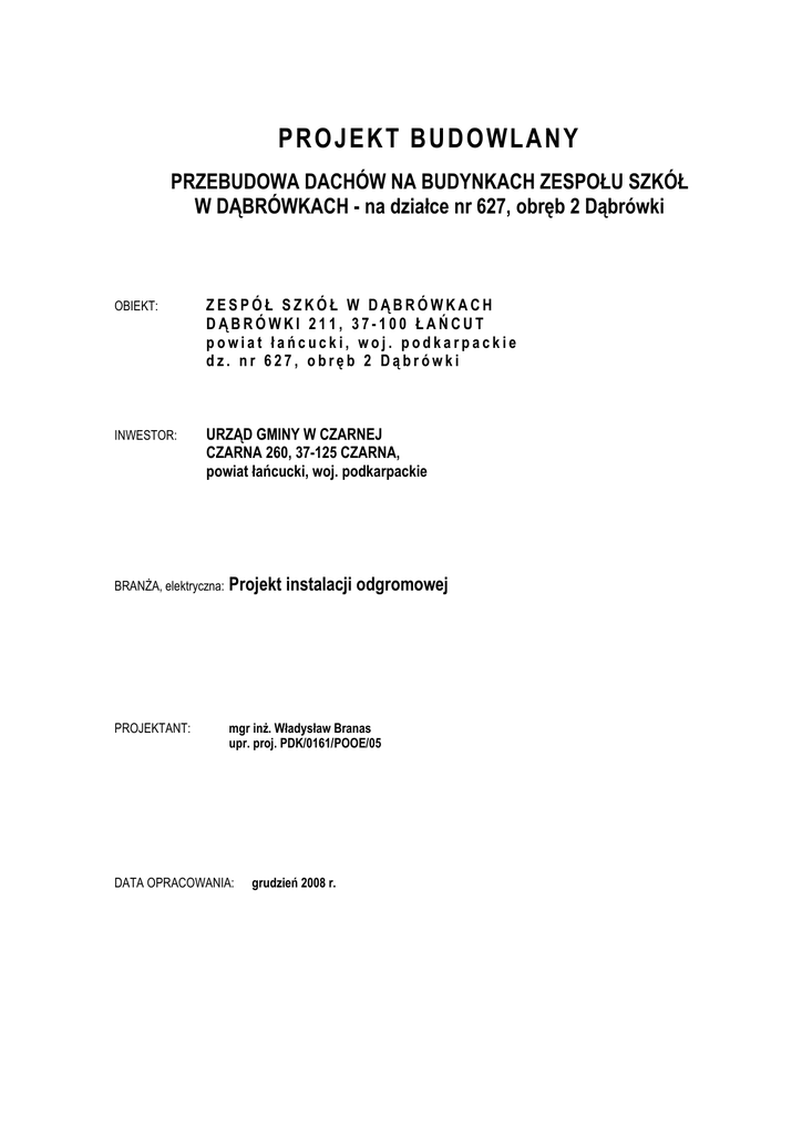 P RO J EKT BU DOWL AN Y PRZEBUDOWA DACHÓW NA BUDYNKACH ZESPOŁU SZKÓŁ W DĄBRÓWKACH - na działce nr 627, obręb 2 Dąbrówki OBIEKT: ZESPÓŁ SZKÓŁ W DĄBRÓWKACH DĄBRÓWKI 211, 37-100 ŁAŃCUT powiat łańcucki, woj. podkarpackie dz. nr 627, obręb 2 Dąbrówki INWESTOR: URZĄD GMINY W CZARNEJ CZARNA 260, 37-125 CZARNA, powiat łańcucki, woj. podkarpackie BRANśA, elektryczna: Projekt instalacji odgromowej PROJEKTANT: mgr inŜ. Władysław Branas upr. proj. PDK/0161/POOE/05 DATA OPRACOWANIA: grudzień 2008 r. PROJEKT BUDOWLANY INSTALACJI ODGROMOWEJ PRZEBUDOWY DACHÓW NA BUDYNKACH ZESPOŁU SZKÓŁ W DABRÓWKACH – na działce nr 627, obręb 2 Dąbrówki 2. SPIS ZAWARTOŚCI PROJEKTU 1. STRONA TYTUŁOWA 2. SPIS ZAWARTOŚCI PROJEKTU 3. WSTĘP 3.1. Przedmiot opracowania 3.2. Zakres opracowania 3.3. Projekty związane 4. OPIS TECHNICZNY 4.1. Istniejąca instalacja odgromowa 4.2. Projektowana instalacja odgromowa 4.3. Postanowienia ogólne 5. OBLICZENIA 5.1. Obliczenie poziomu ochrony dla urządzenia piorunochronnego 6. RYSUNKI Lp. 1 Nr rysunku 1 Przedmiot rysunku Plan instalacji odgromowej – rzut dachu Strona 2 PROJEKT BUDOWLANY INSTALACJI ODGROMOWEJ PRZEBUDOWY DACHÓW NA BUDYNKACH ZESPOŁU SZKÓŁ W DABRÓWKACH – na działce nr 627, obręb 2 Dąbrówki 3. WSTĘP 3.1. Przedmiot opracowania Przedmiotem opracowania jest projekt instalacji odgromowej w Zespole Szkół w Dąbrówkach. 3.2. Zakres opracowania Projekt swoim zakresem obejmuje wykonanie instalacji odgromowej na projektowanej przebudowie dachów oraz wykonanie zwodów pionowych wraz z podłączeniem do istniejącej instalacji uziemiającej. 3.3. Projekty związane Projekt architektoniczno-budowlany. 4. OPIS TECHNICZNY 4.1. Istniejąca instalacja odgromowa W związku z przebudową dachów na wszystkich segmentach budynku Zespołu Szkół naleŜy wykonać demontaŜ istniejącej instalacji odgromowej. DemontaŜowi podlegają: • zwody poziome jakie znajdują się na dachach poszczególnych segmentów przewidzianych do przebudowy (zwody wykonane z drutu, układanym na klockach klejonych do pokrycia dachu, mocowany napręŜnie, na uchwytach wbijanych) • zwody pionowe jakie znajdują się na ścianach poszczególnych segmentów przewidzianych do przebudowy (zwody wykonane z drutu mocowanym napręŜnie, układanym na wspornikach wbijanych do ścian zewnętrznych budynku) • złącza probiercze. Prace demontaŜowe instalacji odgromowej zostaną wykonane przez firmę wykonującą rozbiórkę istniejącego dachu. 4.2. Projektowana instalacja odgromowa Budynek Zespołu Szkół jest obiektem zwykłym. Dla budynku wyznaczono III poziom ochrony odgromowej. Na dachu budynku projektuje się wykonanie siatki zwodów z drutu FeZn Φ 8mm na wspornikach przykręcanych do pokrycia dachu. Na kominach wykonać zwody poziome z drutu FeZn Φ 8mm na wspornikach wbijanych do kominów. Zwody łączyć z zwodami poziomymi dachu zaciskami śrubowymi, krzyŜowymi. Zwody pionowe projektuje się wymienić. Zwody wykonać z drutu FeZn Φ8mm układanym na wspornikach wbijanych do ścian. Zwody łączyć z przewodami odprowadzającymi przez złącza śrubowe, probiercze (linkapłaskownik) ZP. Istniejący rozstaw przewodów odprowadzających instalacji uziemiającej pozostaje bez zmian. 4.3. Postanowienia ogólne Projekt wykonano w oparciu o normy: • PN-IEC 61024-1. Ochrona odgromowa obiektów budowlanych. Zasady ogólne. • PN-IEC 61024-1-1. Ochrona odgromowa obiektów budowlanych. Zasady ogólne. Wybór poziomów ochrony dla urządzeń. • PN-IEC 61024-1-2. Ochrona odgromowa obiektów budowlanych. Zasady ogólne. Przewodnik B – Projektowanie, montaŜ, konserwacja i sprawdzanie. Po wykonaniu instalacji przeprowadzić kontrolne pomiary sprawdzające rezystancji uziemienia i odgromowej. Z pomiarów sporządzić stosowne protokoły oraz metrykę urządzenia piorunochronnego. 5. OBLICZENIA 5.1. Obliczenie poziomu ochrony dla urządzenia piorunochronnego Do obliczenia poziomu ochrony dla urządzenia piorunochronnego zastosowano metodę wymiarowania sieci. Gęstość doziemnych wyładowań piorunowych na rok: Ng = 0,04 x Ta 1,25 Ng = 0,04 x 25 1,25 = 2,24 Strona 3 PROJEKT BUDOWLANY INSTALACJI ODGROMOWEJ PRZEBUDOWY DACHÓW NA BUDYNKACH ZESPOŁU SZKÓŁ W DABRÓWKACH – na działce nr 627, obręb 2 Dąbrówki Spodziewana częstość bezpośrednich wyładowań piorunowych w obiekt na rok (segmentu o największej kubaturze): Nd = Ng x Ae x 10 -6 RównowaŜna powierzchnia zbierania wyładowań przez obiekt: Ae = a x b + 6 x h x (a+b) + 9xΠ x h 2 2 Ae = 35 x 18 +6 x 11x (35 + 18) + 9 x 3,14 x 11 = 7547,46 Nd = 2,24 x 7547,46 x 10 -6 = 0,0169 Nc = 0,001 Skuteczność urządzenia piorunochronnego: Nc 0,001 E > 1 - ---- = 1 - ---------- = 0,941 Nd 0,0169 Dla skuteczności urządzenia piorunochronnego E = 0,95 wymagany jest III poziom ochrony odgromowej. Rezystancja uziemienia Ru < 10Ω. 6. RYSUNKI Strona 4