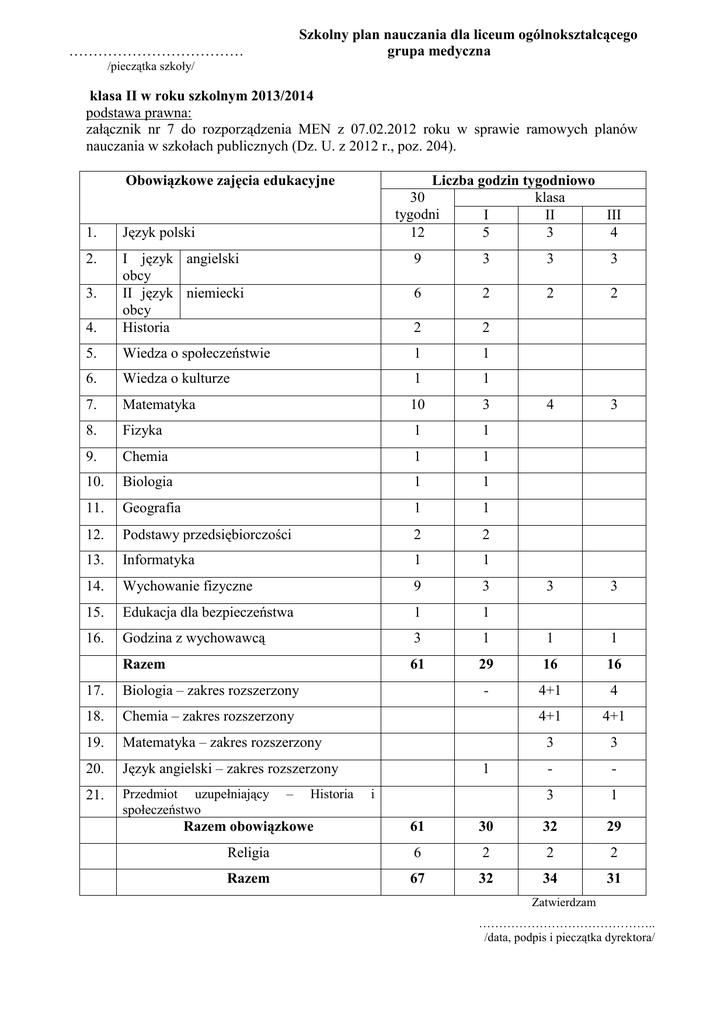 Szkolny plan nauczania dla liceum ogólnokształcącego grupa medyczna ……………………………… /pieczątka szkoły/ klasa II w roku szkolnym 2013/2014 podstawa prawna: załącznik nr 7 do rozporządzenia MEN z 07.02.2012 roku w sprawie ramowych planów nauczania w szkołach publicznych (Dz. U. z 2012 r., poz. 204). Liczba godzin tygodniowo 30 klasa tygodni I II III 12 5 3 4 Obowiązkowe zajęcia edukacyjne 1. Język polski 2. 4. I język angielski obcy II język niemiecki obcy Historia 5. 9 3 3 3 6 2 2 2 2 2 Wiedza o społeczeństwie 1 1 6. Wiedza o kulturze 1 1 7. Matematyka 10 3 4 3 8. Fizyka 1 1 9. Chemia 1 1 10. Biologia 1 1 11. Geografia 1 1 12. Podstawy przedsiębiorczości 2 2 13. Informatyka 1 1 14. Wychowanie fizyczne 9 3 3 3 15. Edukacja dla bezpieczeństwa 1 1 16. Godzina z wychowawcą 3 1 1 1 Razem 61 29 16 16 - 4+1 4 4+1 4+1 3 3 - - 3 1 3. 17. Biologia – zakres rozszerzony 18. Chemia – zakres rozszerzony 19. Matematyka – zakres rozszerzony 20. Język angielski – zakres rozszerzony 21. Przedmiot uzupełniający społeczeństwo – Historia 1 i Razem obowiązkowe 61 30 32 29 Religia 6 2 2 2 Razem 67 32 34 31 Zatwierdzam …………………………………….. /data, podpis i pieczątka dyrektora/