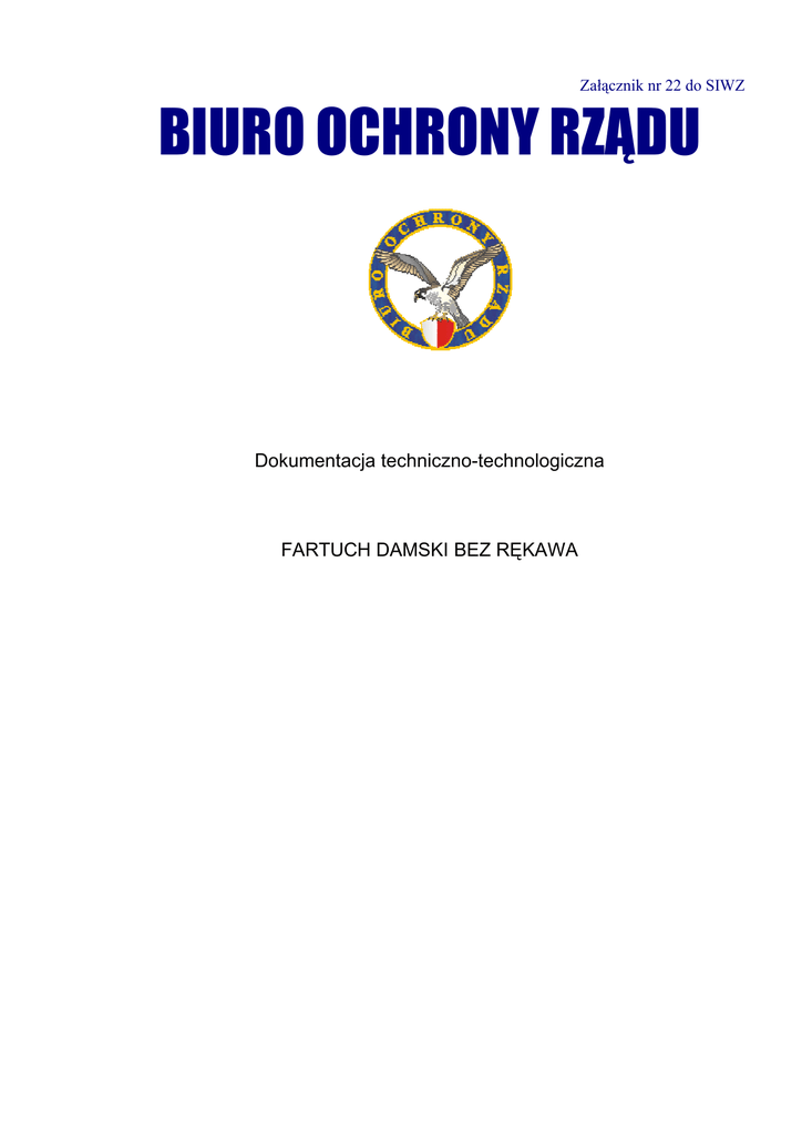 Załącznik nr 22 do SIWZ BIURO OCHRONY RZĄDU Dokumentacja techniczno-technologiczna FARTUCH DAMSKI BEZ RĘKAWA Spis treści 1. Rysunek modelowy fartucha damskiego bez rękawa. 3 2. Ogólny opis fartucha damskiego bez rękawa. 4 3. Wymagania techniczne. 4 3.1. Wykaz materiałów zasadniczych i dodatków. 4 3.2. Rodzaje szwów i ściegów maszynowych. 4 3.3. Tabela klasyfikacji wielkości. 5 3.4. Zestawienie części składowych. 5 4. Opis wykonania wyrobu. 6 5. Rysunek techniczny. 7 6. Cechowanie i pakowanie. 8 7. Gwarancie. 9 8. Tabele wymiarów wyrobu gotowego. 9-10 9. Arkusz ewidencji wprowadzonych zmian. 11 2 1. RYSUNEK MODELOWY FARTUCHA DAMSKIEGO BEZ RĘKAWA. Rysunek nr 1 – rysunek modelowy fartucha damskiego bez rękawa. 3 2. OPIS OGÓLNY FARTUCHA DAMSKIEGO BEZ RĘKAWA. Fartuch damski bez rękawa z przodem rozpinanym. Na tyle w szwach bocznych wszyte paski ściągające. Na obu przodach fartucha, na linii bioder naszyte kieszenie boczne. Dół wykończony obrębem. Wykrój szyi i wykroje pach wykończone lamówka w kolorze białym. 3. WYMAGANIA TECHNICZNE. 3.1. WYKAZ MATERIAŁÓW ZASADNICZYCH I DODATKÓW. Tkanina zasadnicza : 1) skład surowcowy : a) 67% poliester, 33% bawełna; lub b) 65% poliester, 35% bawełna. 2) Gramatura : a) 165 ± 10 g/m²; lub b) 215 ± 10 g/m². 3) Kolor tkaniny zasadniczej – granatowy lub niebieski : 3.2. RODZAJE SZWÓW I ŚCIEGÓW MASZYNOWYCH. Szwy : a) overlok 5-nitkowy (zszycie ramion i boków); b) stębnowy 1 + 1 cm (zszycie pasków ściągających i doszycie obłoŜeń); c) obrębiajacy 1 + 2 cm (góra kieszeni i dół fartucha); d) stębnówki – 5 mm (krawędzie przodów i paski ściągające). 4 3.3. TABELA KLASYFIKACJI WIELKOŚCI. Tabela nr 1 Wzrost 152 158 164 170 176 Obwód klatki piersiowej 88 S 92 96 M 100 104 L 108 112 XL 116 120 XXL 124 3.4. ZESTAWIENIE CZĘŚCI SKŁADOWYCH. Tabela nr 2 L.p. Nazwa elementu Ilość elementów 1 2 3 1 Kieszeń dolna. 2 2 Przód. 2 3 Pasek ściągający. 2 4 Tył. 1 5 Wieszak. 1 6 Lamówka. 3 Razem ilość elementów 11 5 4. OPIS WYKONANIA WYROBU. Fartuch damski bez rękawa ma być wykonany zgodnie z PN-EN 340 : 2006 – odzieŜ ochronna – wymagania ogólne. 1) zaszewki – zeszyć zaszewki w przodach i tyle w odległości 1,5 cm za nakłuciem; 2) kieszenie – podwinąć górę kieszeni wg nacinków i przeszyć w odległości 2 cm od krawędzi, naszyć wg nakłuć w przodach fartucha; 3) paski – paski odszyć, wywrócić i wystębnować w odległości 5 mm od krawędzi. Pasek zamocować do tyłu na linii talii kładąc środek paska na nacinki; 4) montaŜ – krawędzie przodów obrzucić overlokiem 3-nitkowym. Zeszyć ramiona oraz boki. W lewy bok wszyć łatkę brakarska oraz wszywkę firmową. Wykrój szyi i wykroje pach wylamować. Przewinąć i wystębnować krawędzie przodów w odległości 5 mm od krawędzi. Podwinąć dół fartucha i przeszyć w odległości 2 cm od krawędzi. 5) guziki – wyznaczyć wg dziurek i przyszyć; 6 5. RYSUNEK TECHNICZNY. Rysunek nr 2 – tył fartucha 7 6. CECHOWANIE I PAKOWANIE. Cechowanie. Fartuch winien zawierać wszytą : 1) wszywkę firmową zawierająca nazwę i znak producenta (pod lamówka na środku tyły fartucha); 2) wszywka rozmiarową (pod lamówka na środku tyły fartucha); 3) wszywkę informacyjną o sposobie konserwacji wyrobu. Oznaczenia sposobu konserwacji, zgodnie z PN-90/P-04608 ( w lewym boku 15 cm od pachy). Do fartucha winna być dołączona : Etykieta jednostkowa zawierająca następujące dane (pod pierwszym guzikiem) : - nazwę, adres i znak firmowy producenta; - nazwę wyrobu i numer wzoru; - symbol i skład surowcowy materiału zasadniczego z określeniem wykończenia uszlachetniającego wyrób; - wielkość wyrobu; - znak stopnia jakości i kontroli odbioru; - miesiąc i rok produkcji wyrobu; - oznaczenie sposobu konserwacji wg PN-82/P-04608. Na opakowaniu zbiorczym winna być zamocowana : Etykieta na opakowanie zbiorcze zawierająca następujące dane : - nazwę, adres i znak firmowy producenta; - nazwę wyrobu i numer wzoru; - ogólną liczbę sztuk zawartych w opakowaniu; - wielkość wyrobów; - jakość wyrobów; - numer pakującego; - miesiąc i rok produkcji wyrobu; Pakowanie. Fartuch zapiąć na wszystkie guziki. Boki fartucha przewinąć do tyłu. ZłoŜyć poprzecznie na pół i jeszcze raz na pół. Fartuch winien być zapakowane po 1 szt. w worek foliowy, a następnie w kartony zbiorcze po 20 szt. jednego rozmiaru. 8 7. Gwarancje. Producent udzieli 12 miesięcznej gwarancji na wyrób. 8. TABELA WYMIARÓW WYROBU GOTOWEGO. Tabela nr 3 Wyszczególnienie Wzrost Obwód klatki piersiowej Obwód bioder rozmiar Tył – długość tyłu środkiem. Obwód - pod pachą po zapięciu w połowie 152 88 92 96 100 104 108 112 116 96 100 104 108 112 116 120 124 Dopuszczalne odchylenie ± S 100 58 100,5 60 101 62 101,5 64 102 66 102,5 68 103 70 103,5 72 1,5 1,0 88 92 96 100 104 108 112 116 Tabela nr 4 Wyszczególnienie Wzrost Obwód klatki piersiowej Obwód bioder rozmiar Tył – długość tyłu środkiem. Obwód - pod pachą po zapięciu w połowie 158 96 100 104 108 112 116 120 124 Dopuszczalne odchylenie ± 102 58 102,5 60 M 103 62 103,5 64 104 66 104,5 68 105 70 105,5 72 1,5 1,0 88 92 96 100 104 108 112 116 Tabela nr 5 Wyszczególnienie Wzrost Obwód klatki piersiowej Obwód bioder rozmiar Tył – długość tyłu środkiem. Obwód - pod pachą po zapięciu w połowie 164 96 100 104 108 112 116 120 124 Dopuszczalne odchylenie ± 104 58 104,5 60 105 62 105,5 64 L 106 66 106,5 68 107 70 107,5 72 1,5 1,0 9 Tabela nr 6 Wyszczególnienie Wzrost Obwód klatki piersiowej Obwód bioder rozmiar Tył – długość tyłu środkiem. Obwód - pod pachą po zapięciu w połowie 170 88 92 96 100 104 108 112 116 96 100 104 108 112 116 120 124 Dopuszczalne odchylenie ± 106 58 106,5 60 107 62 107,5 64 108 66 108,5 68 XL 109 70 109,5 72 1,5 1 88 92 96 100 104 108 112 116 Tabela nr 7 Wyszczególnienie Wzrost Obwód klatki piersiowej Obwód bioder