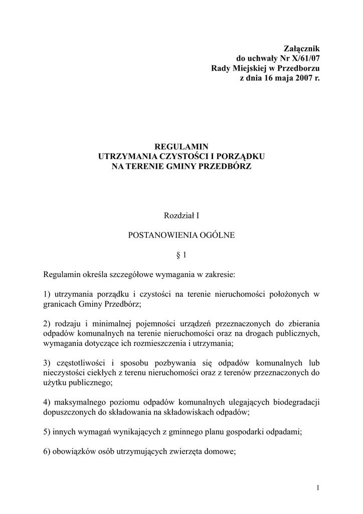 Załącznik do uchwały Nr X/61/07 Rady Miejskiej w Przedborzu z dnia 16 maja 2007 r. REGULAMIN UTRZYMANIA CZYSTOŚCI I PORZĄDKU NA TERENIE GMINY PRZEDBÓRZ Rozdział I POSTANOWIENIA OGÓLNE §1 Regulamin określa szczegółowe wymagania w zakresie: 1) utrzymania porządku i czystości na terenie nieruchomości położonych w granicach Gminy Przedbórz; 2) rodzaju i minimalnej pojemności urządzeń przeznaczonych do zbierania odpadów komunalnych na terenie nieruchomości oraz na drogach publicznych, wymagania dotyczące ich rozmieszczenia i utrzymania; 3) częstotliwości i sposobu pozbywania się odpadów komunalnych lub nieczystości ciekłych z terenu nieruchomości oraz z terenów przeznaczonych do użytku publicznego; 4) maksymalnego poziomu odpadów komunalnych ulegających biodegradacji dopuszczonych do składowania na składowiskach odpadów; 5) innych wymagań wynikających z gminnego planu gospodarki odpadami; 6) obowiązków osób utrzymujących zwierzęta domowe; 1 7) utrzymywania zwierząt gospodarskich na terenach wyłączonych z produkcji rolniczej; 8) wyznaczania obszarów przeprowadzania. obowiązkowej deratyzacji i terminów jej §2 1. Ilekroć mowa w regulaminie o: 1) właścicielu nieruchomości – należy przez to rozumieć także współwłaścicieli, użytkowników wieczystych oraz jednostki organizacyjne i osoby posiadające nieruchomość w zarządzie lub użytkowaniu, a także inne podmioty władające nieruchomościami. Jeżeli nieruchomość jest zabudowana budynkiem wielorodzinnym, w którym ustanowiono odrębne własności lokali, obowiązki właściciela nieruchomości obciążają osoby sprawujące zarząd nieruchomością wspólną lub właścicieli, jeżeli zarząd nie został wybrany; 2) odpadach komunalnych – należy przez to rozumieć odpady powstające w gospodarstwach domowych, a także odpady niezawierające odpadów niebezpiecznych pochodzące od innych wytwórców odpadów, które ze względu na swój charakter lub skład są podobne do odpadów powstających w gospodarstwach domowych; 3) odpadach wielkogabarytowych – należy przez to rozumieć teki strumień odpadów, które ze względu na swoje rozmiary i masę, nie mogą być umieszczane w typowych pojemnikach przeznaczonych do zbierania odpadów komunalnych; 4) odpadach ulegających biodegradacji – należy przez to rozumieć odpady, które ulegają rozkładowi tlenowemu lub beztlenowemu przy udziale mikroorganizmów; 5) odpadach zielonych – należy przez to rozumieć frakcję odpadów ulegających biodegradacji, powstających w wyniku pielęgnacji i uprawy ogrodów i terenów zielonych; 6) odpadach opakowaniowych - należy przez to rozumieć wszystkie opakowania, w tym opakowania wielokrotnego użytku wycofane z ponownego użycia, stanowiące odpady w rozumieniu przepisów o odpadach, z wyjątkiem odpadów powstających w procesie produkcji opakowań; 2 7) odpadach budowlanych - należy przez to rozumieć odpady z budowy, remontów i demontażu obiektów budowlanych, powstałych w gospodarstwach domowych; 8) odpadach niebezpiecznych - należy przez to rozumieć frakcję odpadów niebezpiecznych w rozumieniu ustawy o odpadach, w szczególności: baterie, akumulatory, świetlówki, resztki farb, lakierów, rozpuszczalników, środków do impregnacji drewna, olejów mineralnych i syntetycznych, benzyn i opakowaniach po tych substancjach, leków i opakowaniach po nich, pozostałości środków ochrony roślin i nawozów i opakowania po nich, opakowania po aerozolach, zużyte opatrunki; 9) nieczystościach ciekłych – należy przez to rozumieć ścieki gromadzone przejściowo w zbiorniku bezodpływowym; 10) zbiornikach bezodpływowych – należy przez to rozumieć instalacje i urządzenia przeznaczone do gromadzenia nieczystości ciekłych w miejscu ich powstawania; 11) stacjach zlewnych – należy przez to rozumieć instalacje i urządzenia zlokalizowane przy kolektorach sieci kanalizacyjnej lub przy oczyszczalniach ścieków służące do przyjmowania nieczystości ciekłych dowożonych pojazdami asenizacyjnymi z miejsc gromadzenia; 12) zwierzętach domowych – należy przez to rozumieć zwierzęta przebywające wraz z człowiekiem w jego domu lub innym odpowiednim pomieszczeniu, utrzymywane przez człowieka w charakterze jego towarzysza, a szczególności: psy, koty, ptaki egzotyczne, chomiki, świnki morskie, ryby i żółwie hodowane w akwarium oraz inne zwierzęta uznane za nadające się do trzymania w mieszkaniach w celach niehodowlanych; 13) zwierzętach gospodarskich - należy przez to rozumieć zwierzęta zgodnie z ustawą z 20 sierpnia 1997 r. o organizacji hodowli i rozrodzie zwierząt gospodarskich (Dz. U. z 2002 r. Nr 201, poz. 1762 ze zm.); 14) budynku mieszkalnym jednorodzinnym - należy przez to rozumieć budynek wolno stojący albo budynek w zabudowie bliźniaczej, szeregowej lub grupowej służący zaspokojeniu potrzeb mieszkaniowych, stanowiący konstrukcyjnie samodzielną całość, w którym dopuszcza się wydzielenie nie więcej niż dwóch lokali mieszkalnych albo jednego lokalu mieszkalnego i lokalu użytkowego o powierzchni całkowitej nieprzekraczającej 30% powierzchni całkowitej budynku; 3 15) budynku mieszkalnym wielorodzinnym – należy przez to rozumieć zabudowę budynkami wielomieszkalnymi i wielolokalowymi, o wielu wejściach, liczącymi więcej niż trzy kondygnacje mieszkalne (parter, pierwsze i drugie piętro), które mogą być połączone ze sobą i w ten sposób tworzyć zabudowę z wieloma wejściami, 16) budynkach użyteczności publicznej - należy przez to rozumieć budynki przeznaczone do wykonywania funkcji administracji państwowej: samorządowej, wymiaru sprawiedliwości, kultur, kultu religijnego, oświaty, nauki, służby zdrowia, opieki społecznej i socjalnej, obsługi bankowej, handlu, gastronomii, usług, turystyki, sportu, obsługi pasażerów w transporcie drogowym, poczty i telekomunikacji oraz inne ogólnodostępne budy