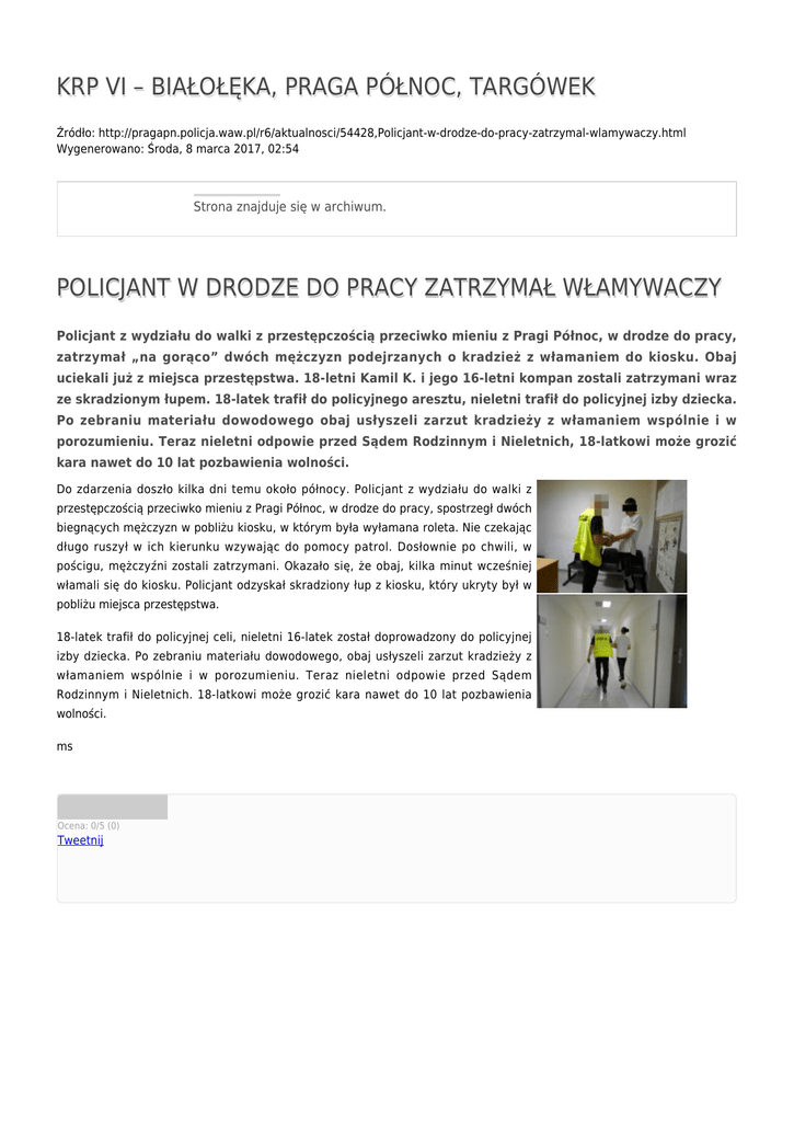KRP VI – BIAŁOŁĘKA, PRAGA PÓŁNOC, TARGÓWEK Źródło: http://pragapn.policja.waw.pl/r6/aktualnosci/54428,Policjant-w-drodze-do-pracy-zatrzymal-wlamywaczy.html Wygenerowano: Środa, 8 marca 2017, 02:54 Strona znajduje się w archiwum. POLICJANT W DRODZE DO PRACY ZATRZYMAŁ WŁAMYWACZY Policjant z wydziału do walki z przestępczością przeciwko mieniu z Pragi Północ, w drodze do pracy, zatrzymał „na gorąco” dwóch mężczyzn podejrzanych o kradzież z włamaniem do kiosku. Obaj uciekali już z miejsca przestępstwa. 18-letni Kamil K. i jego 16-letni kompan zostali zatrzymani wraz ze skradzionym łupem. 18-latek trafił do policyjnego aresztu, nieletni trafił do policyjnej izby dziecka. Po zebraniu materiału dowodowego obaj usłyszeli zarzut kradzieży z włamaniem wspólnie i w porozumieniu. Teraz nieletni odpowie przed Sądem Rodzinnym i Nieletnich, 18-latkowi może grozić kara nawet do 10 lat pozbawienia wolności. Do zdarzenia doszło kilka dni temu około północy. Policjant z wydziału do walki z przestępczością przeciwko mieniu z Pragi Północ, w drodze do pracy, spostrzegł dwóch biegnących mężczyzn w pobliżu kiosku, w którym była wyłamana roleta. Nie czekając długo ruszył w ich kierunku wzywając do pomocy patrol. Dosłownie po chwili, w pościgu, mężczyźni zostali zatrzymani. Okazało się, że obaj, kilka minut wcześniej włamali się do kiosku. Policjant odzyskał skradziony łup z kiosku, który ukryty był w pobliżu miejsca przestępstwa. 18-latek trafił do policyjnej celi, nieletni 16-latek został doprowadzony do policyjnej izby dziecka. Po zebraniu materiału dowodowego, obaj usłyszeli zarzut kradzieży z włamaniem wspólnie i w porozumieniu. Teraz nieletni odpowie przed Sądem Rodzinnym i Nieletnich. 18-latkowi może grozić kara nawet do 10 lat pozbawienia wolności. ms Ocena: 0/5 (0) Tweetnij