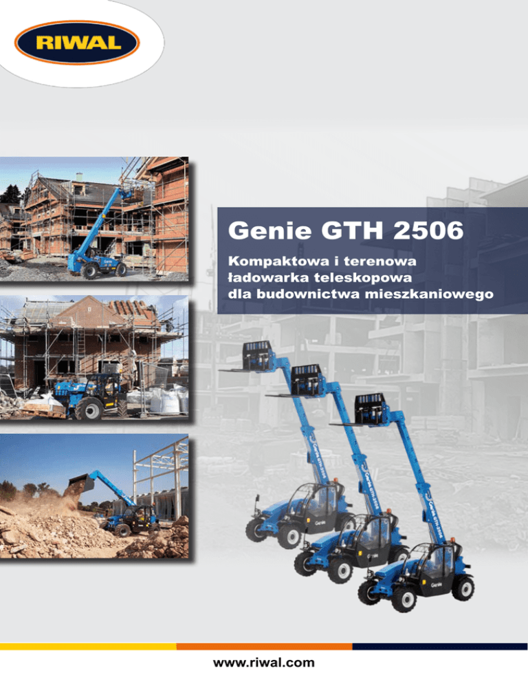 Genie GTH 2506 Kompaktowa i terenowa ładowarka teleskopowa dla budownictwa mieszkaniowego www.riwal.com Genie® GTH 2506 Genie® GTH 2506 to kompaktowa ładowarka teleskopowa oferująca dużą wydajność skoncentrowaną w sprzęcie o niewielkich rozmiarach. Dzięki temu z powodzeniem znajduje zastosowanie na budowach osiedli mieszkaniowych, gdzie ograniczony teren budowy nie pozwala na zastosowanie większych ładowarek. Dzięki kompaktowym rozmiarom i niewielkiej wadze ładowarki, można ją wykorzystać również w pracach wewnątrz budynków. Genie® GTH 2506 wykorzystasz na budowie do montażu fragmentów budynków oraz konstrukcji, czy przenoszenia ładunków oraz rozładunków transportów z materiałami budowlanymi. Ładowarka Genie® GTH 2506 jest niezbędna na Twoim placu budowy. Osiągi: Wysokość podnoszenia: 5,79 m Udźwig maksymalny: 2500 kg Udźwig przy maksymalnym wysięgu: 900 kg Wysokość podnoszenia: 5,79 m Wymiary: Wysokość maszyny: 1,92 m Szerokość maszyny: 1,81 m Szerokość kabiny: 0,86 m Rozstaw kół: 2,32 m Długość maszyny bez wysięgnika: 3,35 m Długość maszyny z widłami: 5,04 m Prześwit: 0,33 m Promień skrętu wewnętrzny: 1,60 m Promień skrętu zewnętrzny: 3,25 m Masa maszyny: 4580 kg Napęd i podzespoły: Silnik diesla DEUTZ TD 2,9 L4: 4-cylindry diesel Prędkość jazdy maksymalna: 26 km/h ZALETY Genie® GTH 2506: • Lekka i kompaktowa kabina ładowarki Genie GTH® 2506 ma 1,81m szerokości oraz 1,92m wysokości • Pomimo niewielkiego rozmiaru, kabina jest ergonomiczna. Jest dość przestronna i wygodna, z regulacją zawieszenia siedzenia, regulowaną kierownicą oraz klimatyzacją. • Wyjątkowo zwrotna, dzięki niewielkiemu promieniowi skrętu • napęd na 4 koła oraz sterowanie zapewniające wybór trzech trybów jazdy (napęd na przednią oś, jazda „krabem” i napęd 4x4) • Przekładnia hydrostatyczna zapewnia stałą, precyzyjną kontrolę prędkości. Zapewnia płynną kontrolę nad jazdą ładowarki oraz możliwość jazdy po terenach nierównych i o większych stopniach nachylenia. • Wielofunkcyjny joystick pozwala na jednoczesne sterowanie wszystkimi ruchami wysięgnika w intuicyjny sposób • Ładowarka dostępna z szeroką gamą akcesoriów, np. widły lub łyżka • Zastosowanie zarówno w warunkach wewnętrznych, jak i zewnętrznych. PODESTY RUCHOME • ŁADOWARKI TELESKOPOWE wynajem • sprzedaż • serwis • części • szkolenia Riwal Poland Sp. z o.o. ul. Zamkowa Wola 31A 96,200 Rawa Mazowiecka www.riwal.com Wynajem maszyn: T. +48 46 895 13 63 E-mail: [email protected] Ponad wszystko. Riwal Sprzedaż maszyn: T. +48 781 800 098 T. +48 885 800 101 E-mail: [email protected]