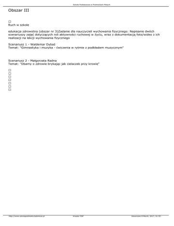 Szkoła Podstawowa w Podmoklach Małych Obszar III Ruch w szkole edukacja zdrowotna (obszar nr 3)Zadanie dla nauczycieli wychowania fizycznego: Napisanie dwóch scenariuszy zajęć dotyczących roli aktywności ruchowej w życiu, wraz z dokumentacją foto/wideo z ich realizacji na lekcji wychowania fizycznego Scenariusz 1 - Waldemar Dybaś Temat: "Gimnastyka i muzyka - ćwiczenia w rytmie z podkładem muzycznym" Scenariusz 2 - Małgorzata Radna Temat: "Dbamy o zdrowie brykając jak cielaczek przy krowie" http://www.szkolapodmokle.babimost.pl Kreator PDF Utworzono 8 March, 2017, 01:55