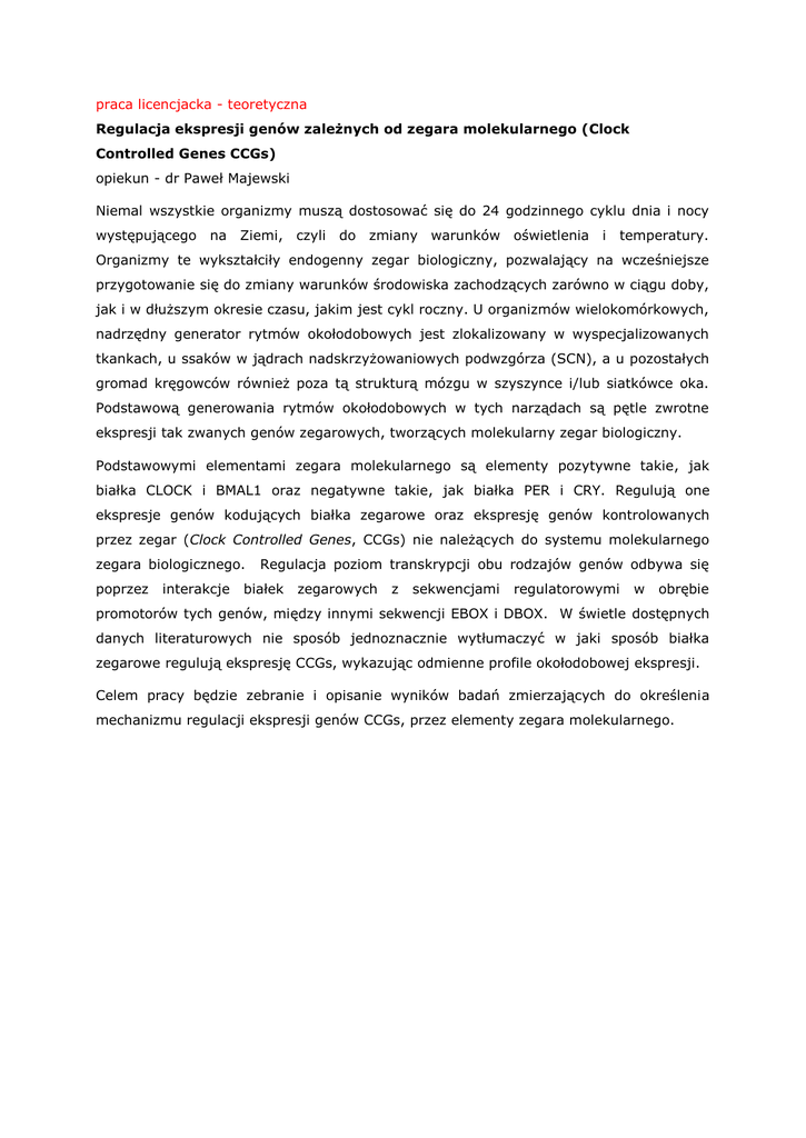 praca licencjacka - teoretyczna Regulacja ekspresji genów zależnych od zegara molekularnego (Clock Controlled Genes CCGs) opiekun - dr Paweł Majewski Niemal wszystkie organizmy muszą dostosować się do 24 godzinnego cyklu dnia i nocy występującego na Ziemi, czyli do zmiany warunków oświetlenia i temperatury. Organizmy te wykształciły endogenny zegar biologiczny, pozwalający na wcześniejsze przygotowanie się do zmiany warunków środowiska zachodzących zarówno w ciągu doby, jak i w dłuższym okresie czasu, jakim jest cykl roczny. U organizmów wielokomórkowych, nadrzędny generator rytmów okołodobowych jest zlokalizowany w wyspecjalizowanych tkankach, u ssaków w jądrach nadskrzyżowaniowych podwzgórza (SCN), a u pozostałych gromad kręgowców również poza tą strukturą mózgu w szyszynce i/lub siatkówce oka. Podstawową generowania rytmów okołodobowych w tych narządach są pętle zwrotne ekspresji tak zwanych genów zegarowych, tworzących molekularny zegar biologiczny. Podstawowymi elementami zegara molekularnego są elementy pozytywne takie, jak białka CLOCK i BMAL1 oraz negatywne takie, jak białka PER i CRY. Regulują one ekspresje genów kodujących białka zegarowe oraz ekspresję genów kontrolowanych przez zegar (Clock Controlled Genes, CCGs) nie należących do systemu molekularnego zegara biologicznego. poprzez interakcje Regulacja poziom transkrypcji obu rodzajów genów odbywa się białek zegarowych z sekwencjami regulatorowymi w obrębie promotorów tych genów, między innymi sekwencji EBOX i DBOX. W świetle dostępnych danych literaturowych nie sposób jednoznacznie wytłumaczyć w jaki sposób białka zegarowe regulują ekspresję CCGs, wykazując odmienne profile okołodobowej ekspresji. Celem pracy będzie zebranie i opisanie wyników badań zmierzających do określenia mechanizmu regulacji ekspresji genów CCGs, przez elementy zegara molekularnego.