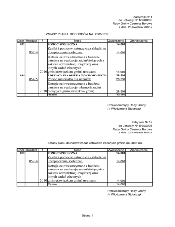 Załącznik Nr 1 do Uchwały Nr 179/XX/05 Rady Gminy Czernice Borowe z dnia 28 kwietnia 2005 r ZMIANY PLANU DOCHODÓW NA 2005 ROK Dział Rozdział 852 § Treść POMOC SPOŁECZNA Zwiększenia 14 000 Zasiłki i pomoc w naturze oraz składki na ubezpieczenia społeczne 85214 Dotacje celowe otrzymane z budżetu państwa na realizację zadań bieżących z zakresu administracji rządowej oraz innych zadań zleconych 2010 gminie(związkom gmin) ustawami 854 EDUKACYJNA OPIEKA WYCHOWAWCZA 85415 Pomoc materialna dla uczniów Dotacje celowe otrzymane z budżetu państwa na realizację własnych zadań 2030 bieżących gmin(związków gmin) Razem Zmniejszenia 14 000 14 000 28 556 28 556 28 556 42 556 Przewodniczący Rady Gminy /-/ Włodzimierz Stolarczyk Załącznik Nr 1a do Uchwały Nr 179/XX/05 Rady Gminy Czernice Borowe z dnia 28 kwietnia 2005 r Zmiany planu dochodów zadań ustawowe zleconych gminie na 2005 rok. Dział Rozdział 852 § Treść POMOC SPOŁECZNA Zwiększenia 14 000 Zasiłki i pomoc w naturze oraz składki na 85214 ubezpieczenia społeczne Dotacje celowe otrzymane z budżetu państwa na realizację zadań bieżących z zakresu administracji rządowej oraz innych zadań zleconych 2010 gminie(związkom gmin) ustawami Razem Zmniejszenia 14 000 14 000 14 000 Przewodniczący Rady Gminy /-/ Włodzimierz Stolarczyk Strona 1 Załącznik Nr 2 do Uchwały Nr 179/XX/05 Rady Gminy Czernice Borowe z dnia 28 kwietnia 2005 r Zmiany planu wydatków na 2005 rok Dział Rozdział 700 70005 § Treść GOSPODARKA MIESZKANIOWA Gospodarka gruntami i nieruchomościami Wydatki inwestycyjne jednostek 6050 budżetowych 750 ADMINISTRACJA PUBLICZNA 75011 Urzędy Wojewódzkie 4010 Wynagrodzenia osobowe pracowników Odpisy na zakładowy fundusz świadczeń 4440 socjalnych Urzędy gmin (miast i miast na prawach 75023 powiatu) 4300 Zakup usług pozostałych Odpisy na zakładowy fundusz świadczeń 4440 socjalnych Zwiększenia 120000 Zmniejszenia 120000 120000 1078 2 936 199 199 199 199 879 2737 879 OŚWIATA I WYCHOWANIE 33890 2737 10180 Szkoły podstawowe 4170 Wynagrodzenia bezosobowe 4210 Zakup materiałów i wyposażenia 4260 Zakup energii 4300 Zakup usług pozostałych 4430 Różne opłaty i składki Odpisy na zakładowy fundusz świadczeń 4440 socjalnych Wydatki na zakupy inwestycyjne 6060 jednostek budżetowych 80110 Gimnazja Odpisy na zakładowy fundusz świadczeń 4440 socjalnych Wydatki na zakupy inwestycyjne 6060 jednostek budżetowych 80113 Dowożenie uczniów do szkół 4210 Zakup materiałów i wyposażenia 80195 Pozostała działalność Odpisy na zakładowy fundusz świadczeń 4440 socjalnych 28931 180 801 80101 851 OCHRONA ZDROWIA 85154 Dział Rozdział Przeciwdziałanie alkoholizmowi 3110 Świadczenia społeczne 4210 Zakup materiałów i wyposażenia § Treść 180 10805 11900 180 2000 351 3695 1061 1061 10000 3000 3000 898 898 6700 1924 6700 1924 1400 Zwiększenia Strona 2 10000 1700 Zmniejszenia 4170 Wynagrodzenia bezosobowe 4300 Zakup usług pozostałych 4410 Podróże służbowe krajowe 852 POMOC SPOŁECZNA 85212 85214 85219 85228 Świadczenia rodzinne oraz składki na ubezpieczenia emerytalne i rentowe z ubezpieczenia społecznego 4010 Wynagrodzenia osobowe pracowników Odpisy na zakładowy fundusz świadczeń 4440 socjalnych Zasiłki i pomoc w naturze oraz składki na ubezpieczenia społeczne 3110 Świadczenia społeczne Ośrodki pomocy społecznej 4010 Wynagrodzenia osobowe pracowników Odpisy na zakładowy fundusz świadczeń 4440 socjalnych Usługi opiekuńcze i specjalistyczne usługi opiekuńcze Odpisy na zakładowy fundusz świadczeń 4440 socjalnych 854 EDUKACYJNA OPIEKA WYCHOWAWCZA Świetlice szkolne 4220 Zakup środków żywności Odpisy na zakładowy fundusz świadczeń 4440 socjalnych 85415 Pomoc materialna dla uczniów 3240 Stypendia dla uczniów 3260 Inne formy pomocy dla uczniów 2800 224 2500 14750 750 167 167 167 167 14000 14000 583 583 500 83 28 556 85401 GOSPODARKA KOMUNALNA I OCHRONA ŚRODOWISKA 900 90004 Utrzymanie zieleni w miastach i gminach Dotacja celowa z budżetu na finansowanie lub dofinansowanie zadań 2820 zleconych do realizacji stowarzyszeniom 90095 Pozostała działalność Wydatki inwestycyjne jednostek 6059 budżetowych KULTURA I OCHRONA DZIEDZICTWA NARODOWEGO 921 92195 926 Dział Rozdział 92695 Pozostała działalność Dotacja celowa z budżetu na finansowanie lub dofinansowanie zadań 2820 zleconych do realizacji stowarzyszeniom Odpisy na zakładowy fundusz świadczeń 4440 socjalnych § KULTURA FIZYCZNA I SPORT Treść Pozostała działalność Strona 3 500 83 12019 12019 11900 119 28 556 27128 1428 97000 1000 1000 96000 96000 2000 333 2000 333 2000 1200 Zwiększenia 333 1200 Zmniejszenia 1200 1200 4170 Wynagrodzenia bezosobowe 4430 Różne opłaty i składki Razem 1200 1200 305174 29342 Przewodniczący Rady Gminy /-/ Włodzimierz Stolarczyk Załącznik Nr 2a do Uchwały Nr 179/XX/05 Rady Gminy Czernice Borowe z dnia 28 kwietnia 2005 r Zmiany planu wydatków zadań ustawowo zleconych gminie na 2005 rok. Dział Rozdział 750 75011 852 § Treść ADMINISTRACJA PUBLICZNA Urzędy Wojewódzkie 4010 Wynagrodzenia osobowe pracowników Odpisy na zakładowy fundusz świadczeń 4440 socjalnych POMOC SPOŁECZNA Świadczenia rodzinne oraz składki na ubezpieczenia emerytalne i rentowe z 85212 ubezpieczenia społecznego 4010 Wynagrodzenia osobowe pracowników Odpisy na zakładowy fundusz świadczeń 4440 socjalnych Zasiłki i pomoc w naturze oraz składki na 85214 ubezpieczenia społeczne 3110 Świadczenia społeczne Razem Zwiększenia 199 Zmniejszenia 199 199 199 199 14167 199 167 167 167 167 167 14000 14000 14366 Przewodniczący Rady Gminy /-/ Włodzimierz Stolarczyk Strona 4 366 Załącznik Nr 2b do Uchwały Nr 179/XX/05 Rady Gminy Czernice Borowe z dnia 28 kwietnia 2005 r Zmiany planu wydatków zadań związanych z rozwiązywaniem problemów alkoholowych na 2005 rok Dział Rozdział 851 85154 § Treść OCHRONA ZDROWIA Przeciwdziałanie alkoholizmowi 3110 Świ