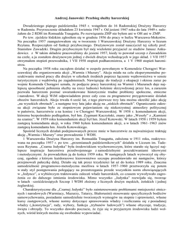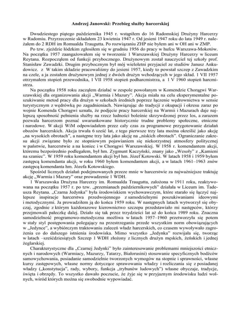 Andrzej Janowski: Przebieg służby harcerskiej Dwudziestego piątego października 1945 r. wstąpiłem do 16 Radomskiej Drużyny Harcerzy w Radomiu. Przyrzeczenie składałem 23 kwietnia 1947 r. Od jesieni 1947 roku do lata 1949 r. należałem do 2 RDH im Romualda Traugutta. Po rozwiązaniu ZHP nie byłem ani w OH ani w ZMP. Po tzw. zjeździe łódzkim zgłosiłem się w grudniu 1956 do pracy w hufcu Warszawa-Mokotów. Na początku 1957 zaangażowałem się w tworzenie 1 Warszawskiej Drużyny Harcerzy w liceum Reytana. Rozpocząłem od funkcji przybocznego. Drużynowym został nauczyciel tej szkoły prof. Stanisław Zawadzki. Drugim przybocznym był mój wieloletni przyjaciel ze studiów Janusz Ankudowicz. z W takim składzie pracowaliśmy do jesieni 1957, kiedy to powstał szczep z Zawadzkim na czele, a ja zostałem drużynowym jednej z dwóch drużyn wchodzących w jego skład. 1 VII 1957 otrzymałem stopień przewodnika, 1 VII 1958 stopień podharcmistrza, a 1 V 1960 stopień harcmistrza. Na początku 1958 roku zacząłem działać w zespole powołanym w Komendzie Chorągwi Warszawskiej dla organizowania akcji „Warmia i Mazury”. Akcja miała na celu eksperymentalne poszukiwanie metod pracy dla drużyn w szkołach średnich poprzez łączenie wędrownictwa w sensie turystycznym z wędrówką po zagadnieniach. Nawiązując do tradycji z okupacji i okresu zaraz po wojnie Komenda Chorągwi uznała, że podjęcie pracy harcerskiej na Warmii i Mazurach daje najlepszą sposobność pełnienia służby na rzecz ludności boleśnie skrzywdzonej przez los, a zarazem pozwala harcerzom poznać uwarunkowane historycznie trudne problemy społeczne, etniczne i narodowe. W akcji WiM odpowiadałem przez cały czas za programowe przygotowanie działań obozów harcerskich. Akcja trwała 6 sześć lat, z tego pierwsze trzy lata można określić jako akcję „na wysokich obrotach”, a następne trzy lata jako akcję na „niskich obrotach”. Ograniczanie zakresu akcji związane było ze stopniowym pojawianiem się niekorzystnej atmosfery politycznej w państwie, harcerstwie a na koniec i w Chorągwi Warszawskiej. W 1958 r. komendantem akcji, któremu bezpośrednio podlegałem, był hm. Zygmunt Kaczyński, znany jako „Wesoły” z „Kamieni na szaniec”. W 1959 roku komendantem akcji był hm. Józef Kotowski. W latach 1958 i 1959 byłem zastępcą komendanta akcji, w roku 1960 byłem komendantem akcji, a w latach 1961–1963 znów zastępcą komendanta hm. Józefa Kotowskiego. Spośród licznych działań podejmowanych przeze mnie w harcerstwie za najważniejsze traktuję akcję „Warmia i Mazury” oraz prowadzenie 1 WDH. 1 Warszawska Drużyna Harcerzy im. Romualda Traugutta, założona w 1911 roku, reaktywowana na początku 1957 r. po tzw. „przemianach październikowych” działała w Liceum im. Tadeusza Reytana. „Czarna Jedynka” była środowiskiem wychowawczym, które starało się łączyć najlepsze inspiracje harcerstwa przedwojennego z samodzielnymi poszukiwaniami ideowymi i metodycznymi. Ja prowadziłem ją do końca 1959 roku. W następnych latach wytworzył się obyczaj, zgodnie z którym każdorazowe kierownictwo szczepu przedstawiało mi następców, którzy przejmowali pałeczkę dalej. Działo się tak przez trzydzieści lat aż do końca 1989 roku. Znaczna samodzielność programowo-metodyczna możliwa w latach 1957–1960 przetworzyła się potem w stały styl postępowania polegający na przestrzeganiu przede wszystkim norm obowiązujących w „Jedynce”, a wybiórczym traktowaniu zaleceń władz harcerskich, co czasem wywoływało zagrożenia co do dalszego istnienia środowiska. Mimo wszystko „Jedynka” rozwijała się, tworząc w latach –sześćdziesiątych Szczep 1 WDH złożony z licznych drużyn męskich, żeńskich i jednej żeglarskiej. Charakterystyczne dla „Czarnej Jedynki” było zainteresowanie problemami mniejszości etnicznych i narodowych (Warmiacy, Mazurzy, Tatarzy, Białorusini) stosowanie specyficznych bodźców samowychowania, posiadanie samodzielnie tworzonych wymogów na stopnie i sprawności, własne kursy zastępowych, własne normy dotyczące sprawowania władzy i rozliczania się z posiadanej władzy („konstytucja”, rady, wybory, funkcja „trybunów ludowych”) własne obyczaje, tradycje, święta i obrzędy. To wszystko dawało poczucie, że żyje się w przyjaznym środowisku ludzi wolnych, wśród których można się swobodnie wypowiadać. Na początku lat sześćdziesiątych miałem duże wątpliwości co do kierunku w jakim idzie ZHP, dlatego też powiązanie z „Jedynką” uważałem za znacznie istotniejsze niż lojalność wobec całej organizacji. Zrezygnowałem wtedy z bycia członkiem Komendy Chorągwi. Od 1960 do 1964 pracowałem zawodowo w Ośrodku Badań Psycho-Pedagogicznych Głównej Kwatery Harcerstwa. Prowadziłem badania nad drużynami starszoharcerskimi oraz nad kadrą instruktorską. W latach 1965–6 pracowałem w redakcji miesięcznika „Harcerstwo” jako sekretarz redakcji. Pod koniec lat sześćdziesiątych –powstała „Gromada Włóczęgów” zrzeszająca absolwentów „Jedynki” i czynnych instruktorów szczepu. „Gromada” organizowała spotkania z ludźmi, którzy chcieli i umieli przedstawić harcerzom ważne problemy społeczne, ideowe i kulturalne. Jedno z takich spotkań zostało w grudniu 1971 roku rozbite przez Służbę Bezpieczeństwa. Od lat sześćdziesiątych mój związek z całym ZHP był dość słaby. W roku 1981 zainicjowałem dyskusję prasową drukując w tygodniku „Kultura” tekst „Czy harcerstwo ma jeszcze szanse?”, a potem tekst „Jeszcze o szansach harcerstwa”. W okresie „Karnawału Solidarności” sądziłem, że właściwa droga odrodzenia harcerstwa biegnie z pominięciem ZHP, więc razem z Tomaszem Strzemboszem zaangażowałem się w wspieranie Niezależnego Ruchu Harcerskiego (przyjmując funkcję przewodniczącego NRH). W latach 1982– 1989 jak