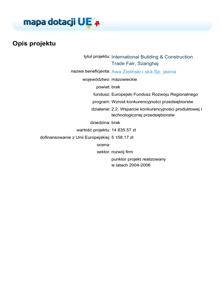 Opis projektu tytuł projektu: International Building & Construction Trade Fair, Szanghaj nazwa beneficjenta: Awa Zieliński i ska Sp. jawna województwo: mazowieckie powiat: brak fundusz: Europejski Fundusz Rozwoju Regionalnego program: Wzrost konkurencyjności przedsiębiorstw działanie: 2.2. Wsparcie konkurencyjności produktowej i technologicznej przedsiębiorstw dziedzina: brak wartość projektu: 14 835.57 zł dofinansowanie z Unii Europejskiej: 5 158.17 zł ocena: sektor: rozwój firm punktor projekt realizowany w latach 2004-2006