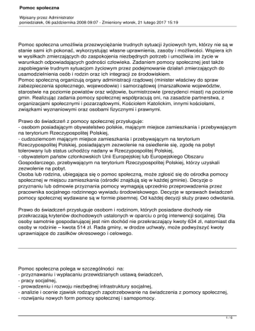 Pomoc społeczna Wpisany przez Administrator poniedziałek, 06 października 2008 09:07 - Zmieniony wtorek, 21 lutego 2017 15:19 Pomoc społeczna umożliwia przezwyciężanie trudnych sytuacji życiowych tym, którzy nie są w stanie sami ich pokonać, wykorzystując własne uprawnienia, zasoby i możliwości. Wspiera ich w wysiłkach zmierzających do zaspokojenia niezbędnych potrzeb i umożliwia im życie w warunkach odpowiadających godności człowieka. Zadaniem pomocy społecznej jest także zapobieganie trudnym sytuacjom życiowym przez podejmowanie działań zmierzających do usamodzielnienia osób i rodzin oraz ich integracji ze środowiskiem. Pomoc społeczną organizują organy administracji rządowej (minister właściwy do spraw zabezpieczenia społecznego, wojewodowie) i samorządowej (marszałkowie województw, starostwie na poziomie powiatów oraz wójtowie, burmistrzowie (prezydenci miast) na poziomie gmin. Realizując zadania pomocy społecznej współpracują oni, na zasadzie partnerstwa, z organizacjami społecznymi i pozarządowymi, Kościołem Katolickim, innymi kościołami, związkami wyznaniowymi oraz osobami fizycznymi i prawnymi. Prawo do świadczeń z pomocy społecznej przysługuje: - osobom posiadającym obywatelstwo polskie, mającym miejsce zamieszkania i przebywającym na terytorium Rzeczypospolitej Polskiej, - cudzoziemcom mającym miejsce zamieszkania i przebywającym na terytorium Rzeczypospolitej Polskiej, posiadającym zezwolenie na osiedlenie się, zgodę na pobyt tolerowany lub status uchodźcy nadany w Rzeczypospolitej Polskiej, - obywatelom państw członkowskich Unii Europejskiej lub Europejskiego Obszaru Gospodarczego, przebywającym na terytorium Rzeczypospolitej Polskiej, którzy uzyskali zezwolenie na pobyt. Osoba lub rodzina, ubiegająca się o pomoc społeczną, może zgłosić się do ośrodka pomocy społecznej w miejscu zamieszkania (ośrodki znajdują się w każdej gminie). Decyzje o przyznaniu lub odmowie przyznania pomocy wymagają uprzednio przeprowadzenia przez pracownika socjalnego rodzinnego wywiadu środowiskowego. Decyzje w sprawach świadczeń pomocy społecznej wydawane są w formie pisemnej. Od każdej decyzji służy prawo odwołania. Prawo do świadczeń przysługuje osobom i rodzinom, których posiadane dochody nie przekraczają kryteriów dochodowych ustalonych w oparciu o próg interwencji socjalnej. Dla osoby samotnie gospodarującej jest nim dochód nie przekraczający kwoty 634 zł, natomiast dla osoby w rodzinie – kwota 514 zł. Rada gminy, w drodze uchwały, może podwyższyć kwoty uprawniające do zasiłków okresowego i celowego. Pomoc społeczna polega w szczególności na: - przyznawaniu i wypłacaniu przewidzianych ustawą świadczeń, - pracy socjalnej, - prowadzeniu i rozwoju niezbędnej infrastruktury socjalnej, - analizie i ocenie zjawisk rodzących zapotrzebowanie na świadczenia z pomocy społecznej, - rozwijaniu nowych form pomocy społecznej i samopomocy. 1/6 Pomoc społeczna Wpisany przez Administrator poniedziałek, 06 października 2008 09:07 - Zmieniony wtorek, 21 lutego 2017 15:19 Główne cele pomocy społecznej: - wsparcie osób i rodzin w przezwyciężeniu trudnej sytuacji życiowej, doprowadzenie - w miarę możliwości - do ich życiowego usamodzielniania i umożliwienie im życia w warunkach odpowiadających godności człowieka, - zapewnienie dochodu na poziomie interwencji socjalnej – dla osób nie posiadających dochodu lub o niskich dochodach, w wieku poprodukcyjnym i osobom niepełnosprawnym, - zapewnienie dochodu do wysokości poziomu interwencji socjalnej osobom i rodzinom o niskich dochodach, które wymagają okresowego wsparcia, - zapewnienie profesjonalnej pomocy rodzinom dotkniętym skutkami patologii społecznej, w tym przemocą w rodzinie, - integracja ze środowiskiem osób wykluczonych społecznie, - stworzenie sieci usług socjalnych adekwatnych do potrzeb w tym zakresie. Pomoc społeczna od dnia 1 maja 2004 r. funkcjonuje na podstawie ustawy z dnia 12 marca 2004 r. o pomocy społecznej (Dz.U. Nr 64, poz. 593, zm. Dz.U. Nr 202, poz. 1551 i Nr 221, poz. 1738 oraz z 2010r. Nr 125 poz. 842, z 2011 r Nr 81, poz. 440, Dz. U. z dn. 29.06.2016r. poz. 930 ze zm.) Pomoc społeczna jest instytucją polityki społecznej państwa, mającą na celu umożliwienie osobom i rodzinom przezwyciężanie trudnych sytuacji życiowych, których nie są one w stanie pokonać, wykorzystując własne uprawnienia, zasoby i możliwości. Pomoc społeczną organizują organy administracji rządowej (minister właściwy do spraw zabezpieczenia społecznego, wojewodowie) i samorządowej (marszałkowie województw, starostowie na poziomie powiatów oraz wójtowie, burmistrzowie (prezydenci miast) na poziomie gmin. Organy te realizując zadania pomocy społecznej współpracują, na zasadzie partnerstwa, z organizacjami społecznymi i pozarządowymi, Kościołem Katolickim, innymi kościołami, związkami wyznaniowymi oraz osobami fizycznymi i prawnymi. Pomoc społeczna wspiera osoby i rodziny w wysiłkach zmierzających do zaspokojenia niezbędnych potrzeb i umożliwia im życie w warunkach odpowiadających godności człowieka. Zadaniem pomocy społecznej jest zapobieganie trudnym sytuacjom życiowym przez podejmowanie działań zmierzających do życiowego usamodzielnienia osób i rodzin oraz ich integracji ze środowiskiem. Osoby i rodziny korzystające z pomocy społecznej są obowiązane do współdziałania w rozwiązywaniu ich trudnej sytuacji życiowej. Prawo do świadczeń z pomocy społecznej przysługuje: - osobom posiadającym obywatelstwo polskie mającym miejsce zamieszkania i przebywającym na terytorium Rzeczypospolitej Polskiej, - cudzoziemcom mającym miejsce zamieszkania i przebywającym na terytorium Rzeczypospolitej Polskiej posiadającym zezwolenie na osiedlenie się, zgodę na pobyt tolerowany lub status uchodźcy nadany w Rzeczypospolitej Polskiej, - obywatelom państw członk