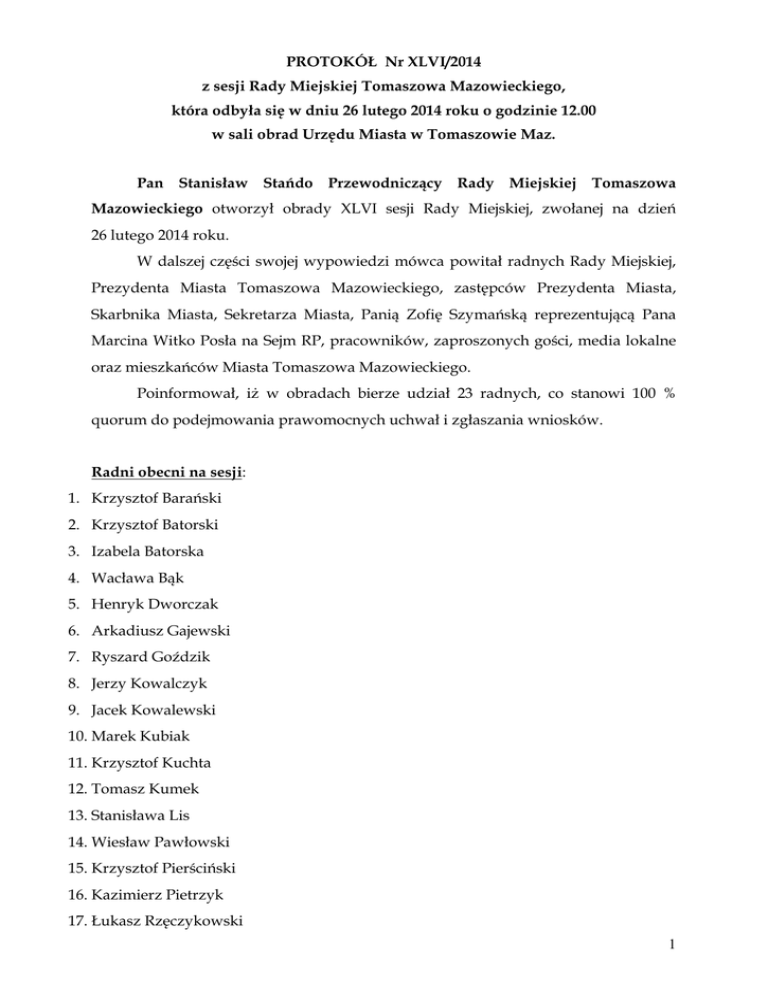 PROTOKÓŁ Nr XLVI/2014 z sesji Rady Miejskiej Tomaszowa Mazowieckiego, która odbyła się w dniu 26 lutego 2014 roku o godzinie 12.00 w sali obrad Urzędu Miasta w Tomaszowie Maz. Pan Stanisław Stańdo Przewodniczący Rady Miejskiej Tomaszowa Mazowieckiego otworzył obrady XLVI sesji Rady Miejskiej, zwołanej na dzień 26 lutego 2014 roku. W dalszej części swojej wypowiedzi mówca powitał radnych Rady Miejskiej, Prezydenta Miasta Tomaszowa Mazowieckiego, zastępców Prezydenta Miasta, Skarbnika Miasta, Sekretarza Miasta, Panią Zofię Szymańską reprezentującą Pana Marcina Witko Posła na Sejm RP, pracowników, zaproszonych gości, media lokalne oraz mieszkańców Miasta Tomaszowa Mazowieckiego. Poinformował, iż w obradach bierze udział 23 radnych, co stanowi 100 % quorum do podejmowania prawomocnych uchwał i zgłaszania wniosków. Radni obecni na sesji: 1. Krzysztof Barański 2. Krzysztof Batorski 3. Izabela Batorska 4. Wacława Bąk 5. Henryk Dworczak 6. Arkadiusz Gajewski 7. Ryszard Goździk 8. Jerzy Kowalczyk 9. Jacek Kowalewski 10. Marek Kubiak 11. Krzysztof Kuchta 12. Tomasz Kumek 13. Stanisława Lis 14. Wiesław Pawłowski 15. Krzysztof Pierściński 16. Kazimierz Pietrzyk 17. Łukasz Rzęczykowski 1 18. Stanisław Stańdo 19. Tomasz Trzonek 20. Tomasz Wawro 21. Krystyna Wilk 22. Tomasz Zdonek 23. Cezary Żegota Lista obecności stanowi załącznik do niniejszego protokołu. Na wniosek radnego Jacka Kowalewskiego przed rozpoczęciem realizacji porządku obrad sesji uczczono minutą ciszy pamięć ofiar poległych w Kijowie w obronie Majdanu Niepodległości. Dotyczy punktu 2. Przedstawienie porządku obrad XLVI sesji Rady Miejskiej. Przewodniczący obrad poinformował, iż przedmiotowy porządek obrad został przekazany radnym w formie pisemnej w ustawowym terminie. Mówca poinformował, iż wpłynął wniosek Pana Rafała Zagozdona Prezydenta Miasta o włączenie do porządku obrad sesji projektu uchwały w sprawie zmiany i sprostowania omyłki pisarskiej w uchwale nr XXXIII/285/2012 Rady Miejskiej Tomaszowa Mazowieckiego z dnia 20 grudnia 2012 roku w sprawie podziału Gminy Miasto Tomaszów Mazowiecki na stałe obwody głosowania, ustalenia ich numerów, granic oraz siedzib obwodowych komisji wyborczych. Przewodniczący obrad poinformował, iż włączenie przedmiotowego projektu uchwały do porządku sesji wymaga zgody Rady Miejskiej w głosowaniu i poddał go pod głosowanie: Wynik głosowania: w głosowaniu udział wzięło 19 radnych, za włączeniem przedmiotowego projektu uchwały do porządku sesji oddano 19 głosów, przy braku głosów przeciwnych i przy braku głosów wstrzymujących. Przewodniczący obrad poinformował, iż wniosek o włączenie do porządku obrad sesji projektu uchwały w sprawie zmiany i sprostowania omyłki pisarskiej w uchwale nr XXXIII/285/2012 Rady Miejskiej Tomaszowa Mazowieckiego z dnia 20 grudnia 2012 roku w sprawie podziału Gminy Miasto Tomaszów Mazowiecki na stałe obwody głosowania, 2 ustalenia ich numerów, granic oraz siedzib obwodowych komisji wyborczych uzyskał wymaganą liczbę głosów. Przedmiotowy projekt uchwały został wpisany jako pkt. 9 porządku obrad. W dalszej kolejności Pan Tomasz Kumek Wiceprzewodniczący Rady Miejskiej przedstawił porządek sesji po zmianach, a mianowicie: 1. Otwarcie sesji i powitanie zebranych. 2. Przedstawienie porządku obrad XLVI sesji Rady Miejskiej. 3. Przyjęcie protokołu z XLV sesji Rady Miejskiej Tomaszowa Maz. z dnia 29 stycznia 2014 roku. 4. Podjęcie uchwały w sprawie dokonania zmian w „Budżecie Miasta Tomaszowa Mazowieckiego na 2014 rok”. 5. Podjęcie uchwały w sprawie zawarcia porozumień międzygminnych dotyczących przejęcia przez Gminę Miasto Tomaszów Mazowiecki prowadzenia gminnego transportu zbiorowego w zakresie przewozu osób i bagażu komunikacją autobusową na terenie gmin: Gminy Tomaszów Mazowiecki, Gminy Lubochnia, Gminy Ujazd, Gminy Wolbórz. 6. Podjęcie uchwały o zmianie uchwały nr III/14/2010 Rady Miejskiej Tomaszowa Mazowieckiego z dnia 14 grudnia 2010 roku w sprawie zatwierdzenia wyboru Przewodniczących i Wiceprzewodniczących stałych Komisji Rady Miejskiej Tomaszowa Mazowieckiego. 7. Podjęcie uchwały o zmianie uchwały nr XXXVI/317/2013 Rady Miejskiej Tomaszowa Mazowieckiego z dnia 27 marca 2013 roku w sprawie ustalenia strefy płatnego parkowania pojazdów samochodowych na drogach publicznych w Tomaszowie Mazowieckim oraz wysokości stawek opłat za parkowanie w tej strefie i sposobu ich pobierania. 8. Podjęcie uchwały w sprawie zatwierdzenia projektu „Wsparcie” Poddziałanie 7.1.1 realizowanego w 2014 r. ze środków Europejskiego Funduszu Społecznego w ramach Priorytetu VII Programu Operacyjnego Kapitał Ludzki. 9. Podjęcie uchwały w sprawie zmiany i sprostowania omyłki pisarskiej w uchwale nr XXXIII/285/2012 Rady Miejskiej Tomaszowa Mazowieckiego z dnia 20 grudnia 2012 roku w sprawie podziału Gminy Miasto Tomaszów 3 Mazowiecki na stałe obwody głosowania, ustalenia ich numerów, granic oraz siedzib obwodowych komisji wyborczych. 10. Sprawozdanie z działalności Miejskiego Ośrodka Pomocy Społecznej w Tomaszowie Mazowieckim w 2013 r. 11. Sprawozdanie z programu „Wspierania Rodziny i Systemu Pieczy Zastępczej”. 12. Sprawozdanie na z wysokości poszczególnych stopniach średnich awansu wynagrodzeń zawodowego nauczycieli w szkołach prowadzonych przez jednostkę samorządu terytorialnego za 2013 rok. 13. Informacja o działalności Prezydenta Miasta w okresie między sesjami oraz z wykonania uchwał podjętych na poprzedniej sesji. 14. Informacja o działalności Przewodniczącego Rady Miejskiej i Wiceprzewodniczących w okresie między sesjami. 15. Interpelacje i wnioski radnych. 16. Korespondencja i sprawy różne. 17. Zamknięcie obrad XLVI sesji Rady Miejskiej. Porządek obrad stanowi załącznik do niniejszego protokołu. Rada Miejska Tomaszowa Mazowieckiego przystąpiła do jego realizacji. Dotyczy punktu 3
