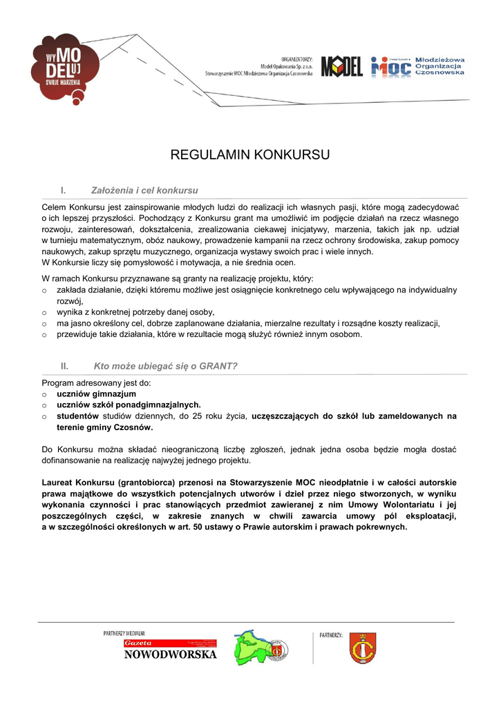 REGULAMIN KONKURSU I. Założenia i cel konkursu Celem Konkursu jest zainspirowanie młodych ludzi do realizacji ich własnych pasji, które mogą zadecydować o ich lepszej przyszłości. Pochodzący z Konkursu grant ma umożliwić im podjęcie działań na rzecz własnego rozwoju, zainteresowań, dokształcenia, zrealizowania ciekawej inicjatywy, marzenia, takich jak np. udział w turnieju matematycznym, obóz naukowy, prowadzenie kampanii na rzecz ochrony środowiska, zakup pomocy naukowych, zakup sprzętu muzycznego, organizacja wystawy swoich prac i wiele innych. W Konkursie liczy się pomysłowość i motywacja, a nie średnia ocen. W ramach Konkursu przyznawane są granty na realizację projektu, który: o zakłada działanie, dzięki któremu możliwe jest osiągnięcie konkretnego celu wpływającego na indywidualny rozwój, o wynika z konkretnej potrzeby danej osoby, o ma jasno określony cel, dobrze zaplanowane działania, mierzalne rezultaty i rozsądne koszty realizacji, o przewiduje takie działania, które w rezultacie mogą służyć również innym osobom. II. Kto może ubiegać się o GRANT? Program adresowany jest do: o uczniów gimnazjum o uczniów szkół ponadgimnazjalnych. o studentów studiów dziennych, do 25 roku życia, uczęszczających do szkół lub zameldowanych na terenie gminy Czosnów. Do Konkursu można składać nieograniczoną liczbę zgłoszeń, jednak jedna osoba będzie mogła dostać dofinansowanie na realizację najwyżej jednego projektu. Laureat Konkursu (grantobiorca) przenosi na Stowarzyszenie MOC nieodpłatnie i w całości autorskie prawa majątkowe do wszystkich potencjalnych utworów i dzieł przez niego stworzonych, w wyniku wykonania czynności i prac stanowiących przedmiot zawieranej z nim Umowy Wolontariatu i jej poszczególnych części, w zakresie znanych w chwili zawarcia umowy pól eksploatacji, a w szczególności określonych w art. 50 ustawy o Prawie autorskim i prawach pokrewnych. III. Sposób wyłaniania grantobiorców Stowarzyszenie MOC Młodzieżowa Organizacja Czosnowska dokona oceny formalnej w oparciu o następujące kryteria: 1. Elektroniczny formularz zgłoszeniowy, dostępny pod adresem www.formularze.ffl.org.pl/17, został wypełniony kompletnie i złożony w terminie, tj. do 19 listopada 2016 r.; 2. Osoba zgłaszająca projekt spełnia warunki opisane w części II Regulaminu; 3. Osoba zgłaszająca projekt dołączyła do formularza kopię dokumentu potwierdzającego status osoby uczącej się, kopię dokumentu potwierdzającego zameldowanie na terenie gminy Czosnów oraz kopię zgody rodzica lub opiekuna prawnego (w przypadku osób niepełnoletnich) na udział w Konkursie; 4. Formularz zgłoszeniowy zawiera harmonogram 3 miesięcznego projektu, realizowanego w okresie między 20 grudnia 2016 r. i 31 marca 2017 r., z uwzględnieniem minimum 14 dni na rozliczenie projektu; 5. Przedstawiony budżet nie zawiera błędów rachunkowych i uwzględnia kwoty brutto; 6. Wartość zgłaszanego projektu wynosi min. 1.000 złotych brutto; 7. Projekt nie dotyczy prowadzenia działalności gospodarczej. Z otrzymanego grantu nie można finansować: o udzielania pożyczek; o przedsięwzięć, które zostały już zrealizowane; o celów religijnych i politycznych oraz uprawiania kultu religijnego; o zakupu środków trwałych i wyposażenia, które nie są merytorycznie uzasadnione; o bezpośredniej pomocy finansowej dla osób fizycznych; o inwestycji (np. zakup gruntów, budowa obiektów, remont budynków, itp.); o wycieczek turystycznych; o finansowania podatku dochodowego od osób fizycznych; o spłaty kredytów i innych zobowiązań. Wnioski, które spełnią wszystkie powyższe wymagania formalne, zostaną przekazane do oceny merytorycznej Komisji Grantowej powołanej z przedstawicieli Model Opakowania Sp. z o.o. i partnerów konkursu. Z autorami najciekawszych projektów Komisja przeprowadzi indywidualne rozmowy, podczas których kandydaci będą mieli okazję zaprezentować swój pomysł. Maksymalny czas prezentacji projektu wynosi 5 min. Komisja wybierze te projekty, które w najwyższym stopniu spełnią następujące kryteria: 1. Odpowiadają na jasno zdefiniowaną potrzebę, wynikającą z wcześniejszych doświadczeń i działań podejmowanych przez uczestnika konkursu, której zaspokojenie gwarantuje jego indywidualny rozwój; 2. Zakładają działania adekwatne do opisanej potrzeby; 3. Jasno i w sposób wymierny przedstawiają planowane korzyści, jakie w efekcie realizacji projektu odniesie jego uczestnik oraz lokalna społeczność; 4. Mają realny do założeń projektu harmonogram działań; 5. Zakładają prezentację efektów działań podjętych w ramach realizacji danego projektu, np. organizacja wystawy zdjęć zrobionych aparatem zakupionym ze środków z grantu; 6. Przewidują kontynuowanie wybranych działań projektu i podtrzymanie aktywności w środowisku lokalnym po zakończeniu jego realizacji; 7. Mają budżet adekwatny do zaplanowanych działań. Wartość i liczbę przyznanych grantów określi Komisja Grantowa. Łączna pula przeznaczona na granty, ufundowana przez Model Opakowania Sp. z o.o., wynosi 10.000 zł. Granty na realizację poszczególnych projektów będą przekazywane na podstawie faktur, umów i rachunków wystawionych na Stowarzyszenie MOC w ramach umowy wolontariatu. III. Termin składania wniosków Elektroniczny formularz zgłoszeniowy należy wypełnić do dnia 19 listopada 2016 r. do godziny 24:00. Nie przyjmujemy wniosków w formie papierowej. Komisja otrzyma do rozpatrzenia wyłącznie wnioski wypełnione kompletnie i złożone w terminie. Wnioski nie spełniające kryteriów formalnych nie będą rozpatrywane. IV. Dodatkowe informacje na temat konkursu Dodatkowe informacje na temat Konkursu „WyMODELuj Swoje Marzenia” można uzyskać: 1. Dawid Królak, Stowarzyszenie MOC Młodzieżowa Organizacja Czosnowska ul. Gmina 6, 05-152 Czosnów tel. 786 27 08 74 e-mail:[email prote