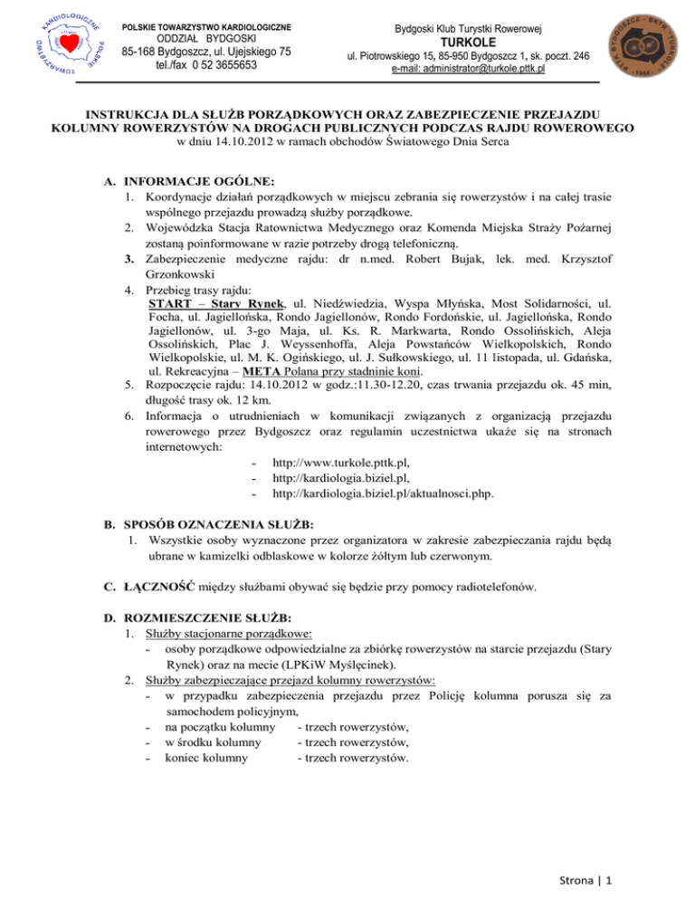 POLSKIE TOWARZYSTWO KARDIOLOGICZNE Bydgoski Klub Turystki Rowerowej 85-168 Bydgoszcz, ul. Ujejskiego 75 tel./fax 0 52 3655653 ul. Piotrowskiego 15, 85-950 Bydgoszcz 1, sk. poczt. 246 e-mail: [email protected] ODDZIAŁ BYDGOSKI TURKOLE INSTRUKCJA DLA SŁUŻB PORZĄDKOWYCH ORAZ ZABEZPIECZENIE PRZEJAZDU KOLUMNY ROWERZYSTÓW NA DROGACH PUBLICZNYCH PODCZAS RAJDU ROWEROWEGO w dniu 14.10.2012 w ramach obchodów Światowego Dnia Serca A. INFORMACJE OGÓLNE: 1. Koordynacje działań porządkowych w miejscu zebrania się rowerzystów i na całej trasie wspólnego przejazdu prowadzą służby porządkowe. 2. Wojewódzka Stacja Ratownictwa Medycznego oraz Komenda Miejska Straży Pożarnej zostaną poinformowane w razie potrzeby drogą telefoniczną. 3. Zabezpieczenie medyczne rajdu: dr n.med. Robert Bujak, lek. med. Krzysztof Grzonkowski 4. Przebieg trasy rajdu: START – Stary Rynek, ul. Niedźwiedzia, Wyspa Młyńska, Most Solidarności, ul. Focha, ul. Jagiellońska, Rondo Jagiellonów, Rondo Fordońskie, ul. Jagiellońska, Rondo Jagiellonów, ul. 3-go Maja, ul. Ks. R. Markwarta, Rondo Ossolińskich, Aleja Ossolińskich, Plac J. Weyssenhoffa, Aleja Powstańców Wielkopolskich, Rondo Wielkopolskie, ul. M. K. Ogińskiego, ul. J. Sułkowskiego, ul. 11 listopada, ul. Gdańska, ul. Rekreacyjna – META Polana przy stadninie koni. 5. Rozpoczęcie rajdu: 14.10.2012 w godz.:11.30-12.20, czas trwania przejazdu ok. 45 min, długość trasy ok. 12 km. 6. Informacja o utrudnieniach w komunikacji związanych z organizacją przejazdu rowerowego przez Bydgoszcz oraz regulamin uczestnictwa ukaże się na stronach internetowych: ˗ http://www.turkole.pttk.pl, ˗ http://kardiologia.biziel.pl, ˗ http://kardiologia.biziel.pl/aktualnosci.php. B. SPOSÓB OZNACZENIA SŁUŻB: 1. Wszystkie osoby wyznaczone przez organizatora w zakresie zabezpieczania rajdu będą ubrane w kamizelki odblaskowe w kolorze żółtym lub czerwonym. C. ŁĄCZNOŚĆ między służbami obywać się będzie przy pomocy radiotelefonów. D. ROZMIESZCZENIE SŁUŻB: 1. Służby stacjonarne porządkowe: ˗ osoby porządkowe odpowiedzialne za zbiórkę rowerzystów na starcie przejazdu (Stary Rynek) oraz na mecie (LPKiW Myślęcinek). 2. Służby zabezpieczające przejazd kolumny rowerzystów: ˗ w przypadku zabezpieczenia przejazdu przez Policję kolumna porusza się za samochodem policyjnym, ˗ na początku kolumny - trzech rowerzystów, ˗ w środku kolumny - trzech rowerzystów, ˗ koniec kolumny - trzech rowerzystów. Strona | 1 E. ZADANIA SŁUŻB PORZĄDKOWYCH: 1. Stacjonarne służby porządkowe: ˗ rejestracja uczestników rajdu, ˗ omówienie trasy wspólnego przejazdu i zasad bezpieczeństwa, ˗ informowanie osób zainteresowanych imprezą (widzów, spacerowiczów, okolicznych mieszkańców) o celu, przebiegu i czasowych utrudnieniach związanych z imprezą, ˗ utrzymywanie stałego kontaktu i niezwłoczne informowanie służb miejskich i Policji o wszelkich utrudnieniach i nieprawidłowościach związanych z przebiegiem rajdu, ˗ reagowanie na wszelkie przejawy złego zachowania, ˗ dbanie o czystość i porządek w miejscu zgromadzenia. 2. Służby zabezpieczające przejazd kolumny rowerzystów: ˗ czuwanie nad prawidłowym i bezpiecznym przejazdem rowerzystów na całej jego trasie, ˗ w przypadku zabezpieczenia przejazdu przez Policję, porządkowi formują kolumnę rowerzystów jadąca za samochodem policyjnym, ˗ na końcu kolumny grupy rowerzystów będzie jechać jeden samochód techniczny oznakowany pomarańczowym światłem ostrzegawczym, ˗ utrzymanie równego tempa przejazdu kolumny na całej trasie (ok. 15km/h), ˗ wykonywanie poleceń służb Policji w celu zatrzymania kolumny, zmiany kierunku przejazdu lub jej przeformowania, ˗ utrzymywanie stałego kontaktu i informowanie przedstawiciela Policji i koordynatora rajdu o wszelkich utrudnieniach i nieprawidłowościach w przebiegu przejazdu. F. IMIENNY WYKAZ OSÓB WCHODZĄCYCH W SKŁAD SŁUŻB PORZĄDKOWYCH: 1. Stacjonarne służby porządkowe: ˗ Włodzimierz Wójciak - koordynator ˗ Rajmund Ratajczak ˗ Robert Bujak ˗ lek. med. Krzysztof Grzonkowski ˗ Magdalena Ściesińska 2. Służby zabezpieczające przejazd kolumny rowerzystów: czoło kolumny: ˗ Rajmund Ratajczak ˗ Przemysław Ściesiński ˗ Jan Juszczyk środek kolumny: ˗ Włodzimierz Wójciak ˗ Łukasz Juszczak ˗ Kajetan Kliszewski koniec kolumny: ˗ Marek Leśniewski ˗ Bogusław Matelski ˗ Bogdan Młynarczyk zabezpieczenie medyczne na trasie przejazdu: ˗ dr n. med. Robert Bujak, ˗ lek. med. Krzysztof Grzonkowski ORGANIZATORZY Strona | 2