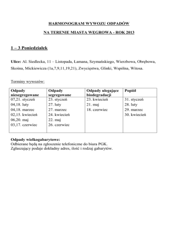 HARMONOGRAM WYWOZU ODPADÓW NA TERENIE MIASTA WĘGROWA - ROK 2013 1 – 3 Poniedziałek Ulice: Al. Siedlecka, 11 – Listopada, Łamana, Szymańskiego, Wierzbowa, Obrębowa, Skośna, Mickiewicza (1a,7,9,11,19,21), Zwycięstwa, Glinki, Wspólna, Witosa. Terminy wywozów: Odpady niesegregowane 07,21. styczeń 04,18. luty 04,18. marzec 02,15. kwiecień 06,20. maj 03,17. czerwiec Odpady segregowane 23. styczeń 27. luty 27. marzec 24. kwiecień 22. maj 26. czerwiec Odpady ulegające biodegradacji 23. kwiecień 21. maj 18. czerwiec Odpady wielkogabarytowe: Odbierane będą na zgłoszenie telefoniczne do biura PGK. Zgłaszający podaje dokładny adres, ilość i rodzaj gabarytów. Popiół 31. styczeń 28. luty 29. marzec 30. kwiecień HARMONOGRAM WYWOZU ODPADÓW NA TERENIE MIASTA WĘGROWA - ROK 2013 1 – 3 Wtorek Ulice: Chopina, Moniuszki, Ludwisarska, Kwiatowa, Nadrzeczna, Narutowicza, Polna, Rzemieślnicza, Sosnowa, Wieniawskiego, Żeromskiego, Klasztorna, Kilińskiego, Kowalska, Ogrodowa, Parkowa, Traugutta Terminy wywozów: Odpady niesegregowane 02,15. styczeń 05,19. luty 05,19. marzec 02,16. kwiecień 07,21. maj 04,18. czerwiec Odpady segregowane 09. styczeń 13. luty 13. marzec 10. kwiecień 08. maj 12. czerwiec Odpady ulegające biodegradacji 22. kwiecień 20. maj 17. czerwiec Odpady wielkogabarytowe: Odbierane będą na zgłoszenie telefoniczne do biura PGK. Zgłaszający podaje dokładny adres, ilość i rodzaj gabarytów. Popiół 29. styczeń 26. luty 28. marzec 29. kwiecień HARMONOGRAM WYWOZU ODPADÓW NA TERENIE MIASTA WĘGROWA - ROK 2013 1 – 3 Środa Ulice: Głowackiego, Jana Pawła, Kosynierów, Nowiny (II część), Połaniecka, Racławicka, Szamoty, Wiejska, Wesoła. Terminy wywozów: Odpady niesegregowane 02,16. styczeń 06,20. luty 06,20. marzec 03,17. kwiecień 02,15. maj 05,19. czerwiec Odpady segregowane 09. styczeń 13. luty 13. marzec 10. kwiecień 08. maj 12. czerwiec Odpady ulegające biodegradacji 22. kwiecień 20. maj 17. czerwiec Odpady wielkogabarytowe: Odbierane będą na zgłoszenie telefoniczne do biura PGK. Zgłaszający podaje dokładny adres, ilość i rodzaj gabarytów. Popiół 29. styczeń 26. luty 28. marzec 29. kwiecień HARMONOGRAM WYWOZU ODPADÓW NA TERENIE MIASTA WĘGROWA - ROK 2013 1 – 3 Czwartek Ulice: Barbasiewicza, Broniewskiego, Bujnowskiej, Kleberga, Kołłątaja, Krasickiego, Obr. Westerplatte, Piaskowa, Piwna, Przechodnia, Sikorskiego, Spacerowa, Staszica. Terminy wywozów: Odpady niesegregowane Odpady segregowane 03,17. styczeń 07,21. luty 07,21. marzec 04,18. kwiecień 02,16. maj 06,20. czerwiec 09. styczeń 13. luty 13. marzec 10. kwiecień 08. maj 12. czerwiec Odpady ulegające biodegradacji 22. kwiecień 20. maj 17. czerwiec Odpady wielkogabarytowe: Odbierane będą na zgłoszenie telefoniczne do biura PGK. Zgłaszający podaje dokładny adres, ilość i rodzaj gabarytów. Popiół 29. styczeń 26. luty 28. marzec 29. kwiecień HARMONOGRAM WYWOZU ODPADÓW NA TERENIE MIASTA WĘGROWA - ROK 2013 1 – 3 Piątek Ulice: Brzozowa, Gdańska, Grudzie I, Miedzanka, Poprzeczna, Świerkowa, Targowa, Zaciszna. Terminy wywozów: Odpady niesegregowane Odpady segregowane 04,18. styczeń 01,15. luty 01,15. marzec 05,19. kwiecień 06,17. maj 07,21. czerwiec 09. styczeń 13. luty 13. marzec 10. kwiecień 08. maj 12. czerwiec Odpady ulegające biodegradacji 22. kwiecień 20. maj 17. czerwiec Odpady wielkogabarytowe: Odbierane będą na zgłoszenie telefoniczne do biura PGK. Zgłaszający podaje dokładny adres, ilość i rodzaj gabarytów. Popiół 29. styczeń 26. luty 28. marzec 29. kwiecień HARMONOGRAM WYWOZU ODPADÓW NA TERENIE MIASTA WĘGROWA- ROK 2013 2 – 4 Poniedziałek Ulice: Al. Solidarności, Bagno, Boh. Warszawy, Gołębiewskiego, Gościniec Niepodległości, Jarnice, Klonowa, Lipowa, Litewska, Młodzieżowa, Piłsudskiego, Przemysłowa, Ruszczyzna, Rynkowa, Rynek Mariacki, Topolowa. Terminy wywozów: Odpady niesegregowane 14,28. styczeń 11,25. luty 11,25. marzec 08,22. kwiecień 13,27. maj 10,24. czerwiec Odpady segregowane 09. styczeń 13. luty 13. marzec 10. kwiecień 08. maj 12. czerwiec Odpady ulegające biodegradacji 22. kwiecień 20. maj 17. czerwiec Odpady wielkogabarytowe: Odbierane będą na zgłoszenie telefoniczne do biura PGK. Zgłaszający podaje dokładny adres, ilość i rodzaj gabarytów. Popiół 29. styczeń 26. luty 28. marzec 29. kwiecień HARMONOGRAM WYWOZU ODPADÓW NA TERENIE MIASTA WĘGROWA - ROK 2013 2 – 4 Wtorek Ulice: Konopnickiej, Kraszewskiego, Mickiewicza (16. 25, 29, 31, 33, 35, 37, 39), Orzeszkowej, Powstańców, Prusa, Reja, Różana, Sienkiewicza, Słowackiego, Korczaka, Jabłonowskiego, Matlińskich, Zarzyckiego. Terminy wywozów: Odpady niesegregowane Odpady segregowane 08,22. styczeń 12,26. luty 12,26. marzec 09,23. kwiecień 14,28. maj 11,25. czerwiec 23. styczeń 27. luty 27. marzec 24. kwiecień 22. maj 26. czerwiec Odpady ulegające biodegradacji 23. kwiecień 21. maj 18. czerwiec Odpady wielkogabarytowe: Odbierane będą na zgłoszenie telefoniczne do biura PGK. Zgłaszający podaje dokładny adres, ilość i rodzaj gabarytów. Popiół 31. styczeń 28. luty 29. marzec 30. kwiecień HARMONOGRAM WYWOZU ODPADÓW NA TERENIE MIASTA WĘGROWA - ROK 2013 2 – 4 Czwartek Ulice: Gajowa, Kościuszki, Leśna, Zelce, Żagana. Terminy wywozów: Odpady niesegregowane 10,24. styczeń 14,28. luty 14,28. marzec 11,25. kwiecień 08,23. maj 13,27. czerwiec Odpady segregowane 23. styczeń 27. luty 27. marzec 24. kwiecień 22. maj 26. czerwiec Odpady ulegające biodegradacji 23. kwiecień 21. maj 18. czerwiec Odpady wielkogabarytowe: Odbierane będą na zgłoszenie telefoniczne do biura PGK. Zgłaszający podaje dokładny adres, ilość i rodzaj gabarytów. Popiół 31. styczeń 28. luty 29. marzec 30. kwiecień HARMONOGRAM WYWOZU ODPADÓW NA TERENIE MIASTA WĘGROWA - ROK 2013 2 – 4 Piątek Ulice: Al. Partyzantów, Grudzie II, Grudzie III, Nowiny (I część), Pogodna, Północna, Słoneczna, Szeroka, Księ