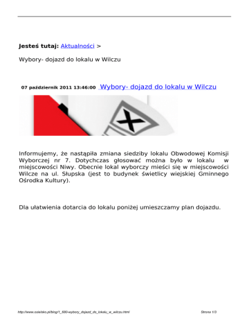Jesteś tutaj: Aktualności > Wybory- dojazd do lokalu w Wilczu 07 październik 2011 13:46:00 Wybory- dojazd do lokalu w Wilczu Informujemy, że nastąpiła zmiana siedziby lokalu Obwodowej Komisji Wyborczej nr 7. Dotychczas głosować można było w lokalu w miejscowości Niwy. Obecnie lokal wyborczy mieści się w miejscowości Wilcze na ul. Słupska (jest to budynek świetlicy wiejskiej Gminnego Ośrodka Kultury). Dla ułatwienia dotarcia do lokalu poniżej umieszczamy plan dojazdu. http://www.osielsko.pl/blog/1_680-wybory_dojazd_do_lokalu_w_wilczu.html Strona 1/3 http://www.osielsko.pl/blog/1_680-wybory_dojazd_do_lokalu_w_wilczu.html Strona 2/3 /V. Dąbrowska/ drukuj Wróć http://www.osielsko.pl/blog/1_680-wybory_dojazd_do_lokalu_w_wilczu.html Powered by TCPDF (www.tcpdf.org) Strona 3/3