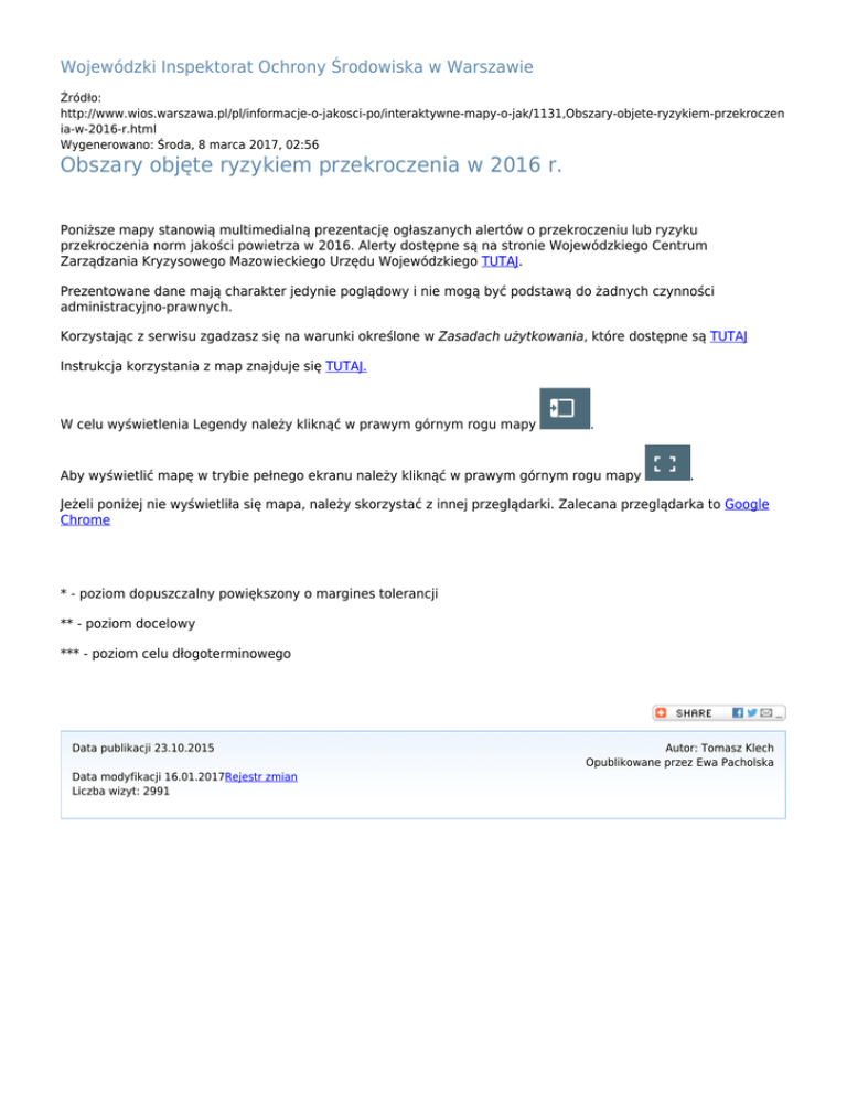 Wojewódzki Inspektorat Ochrony Środowiska w Warszawie Źródło: http://www.wios.warszawa.pl/pl/informacje-o-jakosci-po/interaktywne-mapy-o-jak/1131,Obszary-objete-ryzykiem-przekroczen ia-w-2016-r.html Wygenerowano: Środa, 8 marca 2017, 02:56 Obszary objęte ryzykiem przekroczenia w 2016 r. Poniższe mapy stanowią multimedialną prezentację ogłaszanych alertów o przekroczeniu lub ryzyku przekroczenia norm jakości powietrza w 2016. Alerty dostępne są na stronie Wojewódzkiego Centrum Zarządzania Kryzysowego Mazowieckiego Urzędu Wojewódzkiego TUTAJ. Prezentowane dane mają charakter jedynie poglądowy i nie mogą być podstawą do żadnych czynności administracyjno-prawnych. Korzystając z serwisu zgadzasz się na warunki określone w Zasadach użytkowania, które dostępne są TUTAJ Instrukcja korzystania z map znajduje się TUTAJ. W celu wyświetlenia Legendy należy kliknąć w prawym górnym rogu mapy . Aby wyświetlić mapę w trybie pełnego ekranu należy kliknąć w prawym górnym rogu mapy . Jeżeli poniżej nie wyświetliła się mapa, należy skorzystać z innej przeglądarki. Zalecana przeglądarka to Google Chrome * - poziom dopuszczalny powiększony o margines tolerancji ** - poziom docelowy *** - poziom celu dłogoterminowego Data publikacji 23.10.2015 Data modyfikacji 16.01.2017Rejestr zmian Liczba wizyt: 2991 Autor: Tomasz Klech Opublikowane przez Ewa Pacholska
