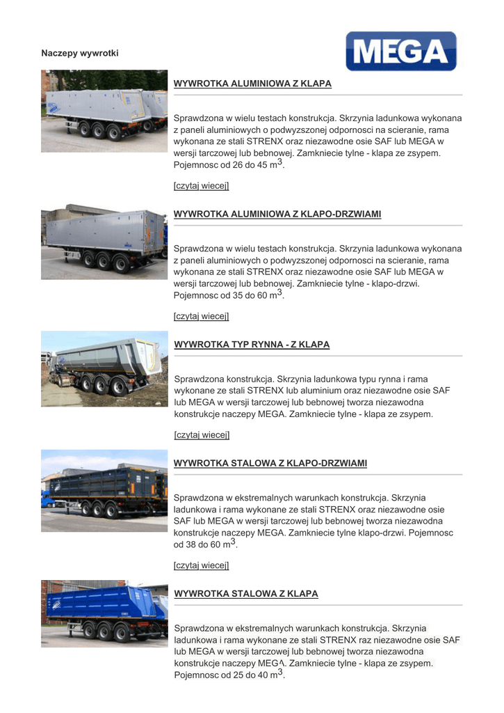 Naczepy wywrotki WYWROTKA ALUMINIOWA Z KLAPA Sprawdzona w wielu testach konstrukcja. Skrzynia ladunkowa wykonana z paneli aluminiowych o podwyzszonej odpornosci na scieranie, rama wykonana ze stali STRENX oraz niezawodne osie SAF lub MEGA w wersji tarczowej lub bebnowej. Zamkniecie tylne - klapa ze zsypem. Pojemnosc od 26 do 45 m3. [czytaj wiecej] WYWROTKA ALUMINIOWA Z KLAPO-DRZWIAMI Sprawdzona w wielu testach konstrukcja. Skrzynia ladunkowa wykonana z paneli aluminiowych o podwyzszonej odpornosci na scieranie, rama wykonana ze stali STRENX oraz niezawodne osie SAF lub MEGA w wersji tarczowej lub bebnowej. Zamkniecie tylne - klapo-drzwi. Pojemnosc od 35 do 60 m3. [czytaj wiecej] WYWROTKA TYP RYNNA - Z KLAPA Sprawdzona konstrukcja. Skrzynia ladunkowa typu rynna i rama wykonane ze stali STRENX lub aluminium oraz niezawodne osie SAF lub MEGA w wersji tarczowej lub bebnowej tworza niezawodna konstrukcje naczepy MEGA. Zamkniecie tylne - klapa ze zsypem. [czytaj wiecej] WYWROTKA STALOWA Z KLAPO-DRZWIAMI Sprawdzona w ekstremalnych warunkach konstrukcja. Skrzynia ladunkowa i rama wykonane ze stali STRENX oraz niezawodne osie SAF lub MEGA w wersji tarczowej lub bebnowej tworza niezawodna konstrukcje naczepy MEGA. Zamkniecie tylne klapo-drzwi. Pojemnosc od 38 do 60 m3. [czytaj wiecej] WYWROTKA STALOWA Z KLAPA Sprawdzona w ekstremalnych warunkach konstrukcja. Skrzynia ladunkowa i rama wykonane ze stali STRENX raz niezawodne osie SAF lub MEGA w wersji tarczowej lub bebnowej tworza niezawodna konstrukcje naczepy MEGA. Zamkniecie tylne - klapa ze zsypem. Pojemnosc od 25 do 40 m3. [czytaj wiecej] WYWROTKA ALUMINIOWA - LEKKA Skrzynia ladunkowa wykonana z najnowszych konstrukcyjnie dostepnych paneli aluminiowych o grubosci 30 mm, o podwyzszonej odpornosci na scieranie.Rama wykonana w ze stali o wysokiej wytrzymalosci konstrukcyjnej. [czytaj wiecej] MEGA Zaklad Produkcji Pojazdow Uzytkowych i Konstrukcji Stalowych Sp. z o. o. | ul. Pilsudskiego 55 | 48-303 Nysa KRS:0000196021 - Sad Rejonowy w Opolu VIII Wydzial Gospodarczy Krajowego Rejestru Sadowego Kapital zakladowy - 60000 PLN | REGON 532431627 | NIP 754-276-24-31