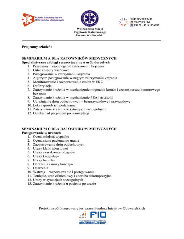 Polskie Stowarzyszenie Ratowników Medycznych Wojewódzka Stacja Pogotowia Ratunkowego Gorzów Wielkopolski ___________________________________________________________________________ Programy szkoleń: SEMINARIUM A DLA RATOWNIKÓW MEDYCZNYCH Specjalistyczne zabiegi resuscytacyjne u osób dorosłych 1. Przyczyny i zapobieganie zatrzymaniu krąŜenia 2. Ostre zespoły wieńcowe 3. Postępowanie w zatrzymaniu krąŜenia 4. Algorytm postępowania w nagłym zatrzymaniu krąŜenia 5. Monitorowanie i rozpoznawanie zmian w EKG 6. Defibrylacja 7. Zatrzymanie krąŜenia w mechanizmie migotania komór i częstoskurczu komorowego bez tętna 8. Zatrzymanie krąŜenia w mechanizmie PEA i asystolii 9. UdraŜnianie dróg oddechowych – bezprzyrządowe i przyrządowe 10. Leki i sposób ich podawania 11. Zatrzymanie krąŜenia w sytuacjach szczególnych 12. Opieka nad pacjentem po resuscytacji SEMINARIUM C DLA RATOWNIKÓW MEDYCZNYCH Postępowanie w urazach 1. Ocena miejsca wypadku 2. Ocena stanu pacjenta po urazie 3. Zaopatrywanie dróg oddechowych 4. Urazy klatki piersiowej 5. Urazy czaszkowo-mózgowe 6. Urazy kręgosłupa 7. Urazy brzucha 8. ObraŜenia i urazy kończyn 9. Oparzenia 10. Wstrząs – rozpoznawanie i postępowanie 11. Tonięcie, uraz ciśnieniowy i choroba dekompresyjna 12. Urazy w sytuacjach szczególnych 13. Zatrzymanie krąŜenia u pacjenta po urazie Projekt współfinansowany jest przez Fundusz Inicjatyw Obywatelskich Polskie Stowarzyszenie Ratowników Medycznych Wojewódzka Stacja Pogotowia Ratunkowego Gorzów Wielkopolski ___________________________________________________________________________ SEMINARIUM DLA DYSPOZYTORÓW MEDYCZNYCH 1. System ratownictwa medycznego na terytorium Rzeczypospolitej Polskiej 2. Jednostki współpracujące z systemem PRM oraz inne jednostki realizujące zadania z zakresu ratownictwa medycznego 3. Łączność – podstawowe pojęcia, alfabet międzynarodowy, zasady komunikacji przez radiotelefon, sieć przywoławcza, sieć telefonii komórkowej, nowoczesne systemy łączności, Globalny System Pozycjonowania. Podstawy przekazu telemedycznego 4. Podstawy prawne i zasady współdziałania z jednostkami współpracującymi z systemem PRM oraz innymi jednostkami realizującymi zadania z zakresu ratownictwa, a takŜe słuŜbami porządku publicznego, w tym zadania i zasady działania KSRG 5. Organizacja systemu powiadamiania 6. Zasady współpracy z lotniczymi zespołami ratownictwa medycznego, wskazania do ich uŜycia i sposób dysponowania 7. Zasady postępowania w przypadku zdarzeń masowych i katastrof i awarii technicznych 8. Zasady koordynacji działań ratowniczych na poziomie województwa oraz w przypadku potrzeby uŜycia zespołów ratownictwa medycznego spoza obszaru województwa 9. Zadania lekarza koordynatora ratownictwa medycznego i zasady współpracy WARSZTATY SZKOLENIOWE A Specjalistyczne zabiegi resuscytacyjne u osób dorosłych 1. Przyczyny i zapobieganie zatrzymaniu krąŜenia 2. Ostre zespoły wieńcowe 3. Postępowanie w zatrzymaniu krąŜenia 4. Algorytm postępowania w nagłym zatrzymaniu krąŜenia 5. Monitorowanie i rozpoznawanie zmian w EKG 6. Defibrylacja 7. Zatrzymanie krąŜenia w mechanizmie migotania komór i częstoskurczu komorowego bez tętna 8. Zatrzymanie krąŜenia w mechanizmie PEA i asystolii 9. UdraŜnianie dróg oddechowych – bezprzyrządowe i przyrządowe 10. Leki i sposób ich podawania 11. Zatrzymanie krąŜenia w sytuacjach szczególnych 12. Opieka nad pacjentem po resuscytacji 13. Ćwiczenia symulowane Projekt współfinansowany jest przez Fundusz Inicjatyw Obywatelskich Polskie Stowarzyszenie Ratowników Medycznych Wojewódzka Stacja Pogotowia Ratunkowego Gorzów Wielkopolski ___________________________________________________________________________ WARSZTATY SZKOLENIOWE C Postępowanie w urazach 14. Ocena miejsca wypadku 15. Ocena stanu pacjenta po urazie 16. Zaopatrywanie dróg oddechowych 17. Urazy klatki piersiowej 18. Urazy czaszkowo-mózgowe 19. Urazy kręgosłupa 20. Urazy brzucha 21. ObraŜenia i urazy kończyn 22. ObraŜenia termiczne 23. Wstrząs – rozpoznawanie i postępowanie 24. Resuscytacja płynowa 25. Tonięcie, uraz ciśnieniowy i choroba dekompresyjna 26. Urazy w sytuacjach szczególnych 27. Zatrzymanie krąŜenia u pacjenta po urazie 28. Ćwiczenia symulowane WARSZTATY SZKOLENIOWE D Postępowanie w wypadkach masowych i katastrofach 1. Planowanie zabezpieczenia medycznego na wypadek katastrof 2. Rodzaje zdarzeń masowych i katastrof 3. Organizacja ratownictwa medycznego w wypadkach masowych i katastrofach 4. Segregacja medyczna – triage 5. Dekontaminacja w zdarzeniach masowych 6. Informacja i komunikacja podczas zdarzenia masowego 7. Łączność radiowa 8. Zarządzanie w zdarzeniach masowych 9. Lotnicze Pogotowie Ratunkowe 10. Sytuacje szczególne 11. Psychologiczne aspekty katastrof 12. Ćwiczenia symulowane Projekt współfinansowany jest przez Fundusz Inicjatyw Obywatelskich