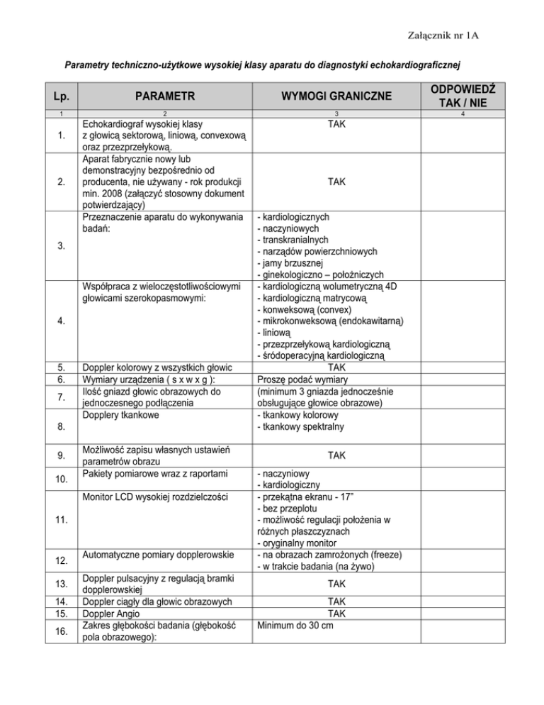Załącznik nr 1A Parametry techniczno-uŜytkowe wysokiej klasy aparatu do diagnostyki echokardiograficznej Lp. PARAMETR WYMOGI GRANICZNE ODPOWIEDŹ TAK / NIE 1 2 3 4 Echokardiograf wysokiej klasy z głowicą sektorową, liniową, convexową oraz przezprzełykową. Aparat fabrycznie nowy lub demonstracyjny bezpośrednio od producenta, nie uŜywany - rok produkcji min. 2008 (załączyć stosowny dokument potwierdzający) Przeznaczenie aparatu do wykonywania badań: TAK 1. 2. 3. Współpraca z wieloczęstotliwościowymi głowicami szerokopasmowymi: 4. 5. 6. 7. Doppler kolorowy z wszystkich głowic Wymiary urządzenia ( s x w x g ): Ilość gniazd głowic obrazowych do jednoczesnego podłączenia Dopplery tkankowe 8. 9. 10. MoŜliwość zapisu własnych ustawień parametrów obrazu Pakiety pomiarowe wraz z raportami Monitor LCD wysokiej rozdzielczości 11. 12. 13. 14. 15. 16. Automatyczne pomiary dopplerowskie Doppler pulsacyjny z regulacją bramki dopplerowskiej Doppler ciągły dla głowic obrazowych Doppler Angio Zakres głębokości badania (głębokość pola obrazowego): TAK - kardiologicznych - naczyniowych - transkranialnych - narządów powierzchniowych - jamy brzusznej - ginekologiczno – połoŜniczych - kardiologiczną wolumetryczną 4D - kardiologiczną matrycową - konweksową (convex) - mikrokonweksową (endokawitarną) - liniową - przezprzełykową kardiologiczną - śródoperacyjną kardiologiczną TAK Proszę podać wymiary (minimum 3 gniazda jednocześnie obsługujące głowice obrazowe) - tkankowy kolorowy - tkankowy spektralny TAK - naczyniowy - kardiologiczny - przekątna ekranu - 17” - bez przeplotu - moŜliwość regulacji połoŜenia w róŜnych płaszczyznach - oryginalny monitor - na obrazach zamroŜonych (freeze) - w trakcie badania (na Ŝywo) TAK TAK TAK Minimum do 30 cm Załącznik nr 1A 17. 18. 19. 20. 21. 22. 23. 24. 25. 26. 27. 28. 29. 30. 31. 32. 33. 34. 35. 36. 37. 38. Zakres częstotliwości pracy aparatu Obrazowanie harmoniczne Regulacja uchylności okna CFM Ilość jednocześnie wyświetlanych ogniskowania wiązki ultradźwiękowej w czasie rzeczywistym Obrazowanie duplex/triplex Częstotliwość odświeŜania obrazu Płynna regulacja szerokości pola obrazowego (field of view) z moŜliwością regulacją połoŜenia wycinka obrazu Regulacja parametrów obrazu po jego zatrzymaniu dla róŜnych trybów obrazowania Mapy szarości dla 2D Mapy szarości dla M-Mode Mapy koloru dla CFM Mapy koloru dla Power Doppler Mapy szarości dla Dopplera pulsacyjnego Pamięć kinowa Wykonywanie pomiarów na uprzednio zarchiwizowanych (na twardym dysku lub nośniku DVD) obrazów pacjentów Formty zapisów: Raw data,JPG,avi. Archiwizacja danych pacjentów: pojedynczych zdjęć i sekwencji video w postaci pętli filmowych w pamięci podręcznej z moŜliwością przenoszenia danych na twardym dysku (o pojemności minimum 150GB) i nośniku DVD + wideoprinter czarno - biały MoŜliwość regulacji parametrów obrazu na uprzednio zarchiwizowanych (na twardym dysku lub nośniku DVD) obrazach pacjentów Wejście EKG Anatomiczny M-Mode i Kolorowy Anatomiczny M-Mode dostępny w czasie rzeczywistym Oprogramowanie do segmentowej oceny kurczliwości mięśnia sercowego za pomocą mapy koloru wyskalowanej w milimetrach wraz z analizą ilościowa i pomiarami (wykresy) Pakiet StreesEcho Funkcja triplex dla głowicy sektorowej Dla Dopplera fali ciągłej 1,5 – 14,0 MHz Dla głowic phase array, convex i linear (zakres regulacji powinien wynosić minimum do +/- 200 Minimum 6 TAK Minimum 600 klatek / s TAK TAK Tak (proszę opisać) Tak (proszę opisać) Tak (proszę opisać) Tak (proszę opisać) Tak (proszę opisać) Minimum 4000 klatek dla trybu B-mode TAK TAK TAK TAK TAK Tak Tak Tak Załącznik nr 1A GŁOWICE USG Głowica elektroniczna – sektorowa matrycowa 1 Zakres częstotliwości pracy 1a. Obrazowanie harmoniczne Liczba elementów tworzących obraz 1b. (kryształów) Głowica elektroniczna – liniowa 1 Zakres częstotliwości pracy 1a. Szerokość Skanu Głowica elektroniczna – convexowa Tak Minimum 2.0 – 4.0 MHz TAK Minimum 128 elementów Tak Minimum 4.0 – 10.0 MHz Max 40mm 1 Zakres częstotliwości pracy Minimum 1.6-5.0 MHz Głowica przezprzełykowa do badań dorosłych 1 Zakres częstotliwości pracy Minimum 3.0 – 7.0 MHz 1a Obrazowanie harmoniczne Tak OPCJE ROZBUDOWY APARATU W PRZYSZŁOŚCI (MUSZĄ BYĆ DOSTEPNE NA DZIEŃ SKŁADANIA OFERTY) Oprogramowanie do automatycznego 1. TAK pomiaru Intima Media Oprogramowanie do badań 2. kontrastowych serca w czasie TAK rzeczywistym DICOM 3.0 3. TAK 4. Obrazowanie 4D serca w czasie rzeczywistym z głowicy wolumetrycznej Głowica ślepego Dopplera – 2MHz 5. TAK TAK Oprogramowanie stereogramowe (przy uŜyciu specjalnych okularów 3D) 6. 7. 8. 9. TAK Oprogramowanie do oceny synchronizacji skurczu mięśnia sercowego wraz z analizą ilościową i pomiarami (wykresy) Oprogramowanie Strain i Strain Rate wraz z analizą ilością i pomiarami (wykresy) Eksport raportów w formatach PDF, CHM, Excel na zewnętrznym systemie TAK TAK TAK Załącznik nr 1A do archiwizacji GWARANCJA I SERWIS 1. 2. 3. 4. 5. 6. Certyfikaty, dopuszczenia, autoryzacja producenta na sprzedaŜ i serwis oferowanego sprzętu Zagwarantowanie dostępności części przez minimum 10 lat od dostawy potwierdzone przez producenta Gwarancja minimum 12 miesiące Przez autoryzowany serwis producenta Instrukcja obsługi w języku polskim Bezpłatna aktualizacja oprogramowania w ramach oferowanych funkcji w okresie trwania gwarancji potwierdzona przez producenta. Bezpłatny przegląd w kaŜdym roku gwarancji TAK, Załączyć do oferty TAK, Załączyć do oferty TAK TAK TAK, Załączyć do oferty TAK