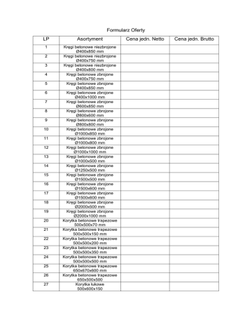 Formularz Oferty LP Asortyment 1 Kręgi betonowe niezbrojone Ø400x850 mm Kręgi betonowe niezbrojone Ø400x750 mm Kręgi betonowe niezbrojone Ø400x800 mm Kręgi betonowe zbrojone Ø400x750 mm Kręgi betonowe zbrojone Ø400x850 mm Kręgi betonowe zbrojone Ø400x1000 mm Kręgi betonowe zbrojone Ø600x850 mm Kręgi betonowe zbrojone Ø800x600 mm Kręgi betonowe zbrojone Ø800x800 mm Kręgi betonowe zbrojone Ø1000x850 mm Kręgi betonowe zbrojone Ø1000x800 mm Kręgi betonowe zbrojone Ø1000x1000 mm Kręgi betonowe zbrojone Ø1000x500 mm Kręgi betonowe zbrojone Ø1250x500 mm Kręgi betonowe zbrojone Ø1500x500 mm Kręgi betonowe zbrojone Ø1500x600 mm Kręgi betonowe zbrojone Ø1500x600 mm Kręgi betonowe zbrojone Ø2000x500 mm Kręgi betonowe zbrojone Ø2000x1000 mm Korytka betonowe trapezowe 500x500x70 mm Korytka betonowe trapezowe 500x500x150 mm Korytka betonowe trapezowe 500x500x200 mm Korytka betonowe trapezowe 500x500x350 mm Korytka betonowe trapezowe 500x500x500 mm Korytka betonowe trapezowe 650x670x600 mm Korytka betonowe trapezowe 650x500x500 Korytka łukowe 500x600x150 2 3 4 5 6 7 8 9 10 11 12 13 14 15 16 17 18 19 20 21 22 23 24 25 26 27 Cena jedn. Netto Cena jedn. Brutto 28 29 30 31 32 Korytka trójkątne 330x180x50 Płyty typu AŻUR/JUMBO 600x400x8 Płyty typu AŻUR/JUMBO 600x400x10 Płyty typu AŻUR/JUMBO 1000x750x10 Rury typu PRAGMA na połączenia kielichowe Ø400mmx6 m (Sztywność obwodowa nie mniejsza, niż 8 kN) 33 Rury typu PRAGMA Ø400mmx6 m bez łączenia kielichowego (Sztywność obwodowa nie mniejsza, niż 8 kN) 34 Rury typu PRAGMA na połączenia kielichowe Ø600mmx6 m (Sztywność obwodowa nie mniejsza, niż 8 kN) 35 Rury typu PRAGMA na połączenia kielichowe Ø500mmx6 m (Sztywność obwodowa nie mniejsza, niż 8 kN) 36 Rury typu PRAGMA Ø600mm x 6 m bez łączenia kielichowego (Sztywność obwodowa nie mniejsza, niż 8 kN) 37 Rury typu PRAGMA na połączenia kielichowe Ø800mm x 6m (Sztywność obwodowa nie mniejsza, niż 8 kN) 38 Rury typu PRAGMA bez połączenia kielichowego Ø800mm x 6m (Sztywność obwodowa nie mniejsza, niż 8 kN) 39 Rury typu PRAGMA Ø400mmx6 m bez łączenia kielichowego (Sztywność obwodowa nie mniejsza, niż 8 kN) 40 41 42 43 44 45 46 Krawężniki drogowe szare 15x25x100 cm Krawężniki drogowe szare 15x30x100 cm Krawężniki drogowe szare 17x30x100 cm Krawężniki drogowe szare 20x30x100 cm Krawężniki drogowe kolor 15x25x100 cm Krawężniki drogowe kolor 15x30x100 cm Krawężniki drogowe kolor 20x30x100 cm 47 48 49 50 51 52 53 Obrzeża trawnikowe szare 8x25x100 cm Obrzeża trawnikowe szare 6x25x100 cm Obrzeża trawnikowe kolor 8x25x100 cm Obrzeża trawnikowe kolor 6x25x100 cm Pokrywa betonowa na krąg Ø800 pełna Pokrywa betonowa na krąg Ø800 z możliwością montażu włazu Pokrywa betonowa na krąg Ø1000 z możliwością montażu włazu 54 Pokrywa betonowa na krąg Ø2000 z możliwością montażu 55 Właz żeliwny nośność 1,5T Ø600 Właz żeliwny nośność 12,5T Ø600 Właz żeliwny nośność 25 T Ø600 Wpust uliczny wytrzymałość 25 T Wpust uliczny wytrzymałość 40 T włazu 56 57 58 59