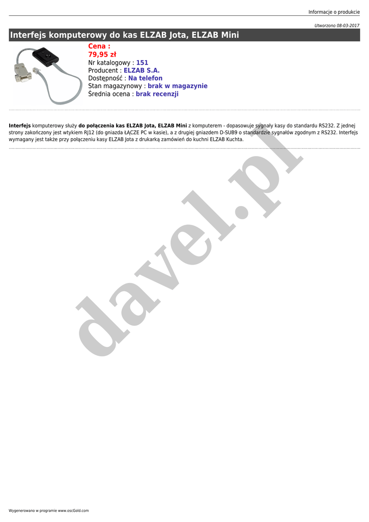 Informacje o produkcie Utworzono 08-03-2017 Interfejs komputerowy do kas ELZAB Jota, ELZAB Mini Cena : 79,95 zł Nr katalogowy : 151 Producent : ELZAB S.A. Dostępność : Na telefon Stan magazynowy : brak w magazynie Średnia ocena : brak recenzji da ve l .p l Interfejs komputerowy służy do połączenia kas ELZAB Jota, ELZAB Mini z komputerem - dopasowuje sygnały kasy do standardu RS232. Z jednej strony zakończony jest wtykiem RJ12 (do gniazda ŁĄCZE PC w kasie), a z drugiej gniazdem D-SUB9 o standardzie sygnałów zgodnym z RS232. Interfejs wymagany jest także przy połączeniu kasy ELZAB Jota z drukarką zamówień do kuchni ELZAB Kuchta. Wygenerowano w programie www.oscGold.com