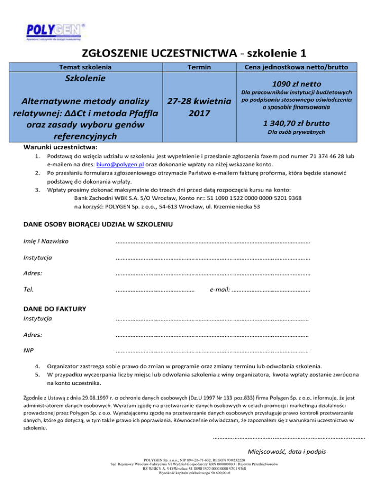 ZGŁOSZENIE UCZESTNICTWA - szkolenie 1 Temat szkolenia Termin Cena jednostkowa netto/brutto Szkolenie 1090 zł netto Alternatywne metody analizy 27-28 kwietnia relatywnej: ΔΔCt i metoda Pfaffla 2017 oraz zasady wyboru genów referencyjnych Dla pracowników instytucji budżetowych po podpisaniu stosownego oświadczenia o sposobie finansowania 1 340,70 zł brutto Dla osób prywatnych Warunki uczestnictwa: 1. 2. 3. Podstawą do wzięcia udziału w szkoleniu jest wypełnienie i przesłanie zgłoszenia faxem pod numer 71 374 46 28 lub e-mailem na dres: [email protected] oraz dokonanie wpłaty na niżej wskazane konto. Po przesłaniu formularza zgłoszeniowego otrzymacie Państwo e-mailem fakturę proforma, która będzie stanowić podstawę do dokonania wpłaty. Wpłaty prosimy dokonać maksymalnie do trzech dni przed datą rozpoczęcia kursu na konto: Bank Zachodni WBK S.A. 5/O Wrocław, Konto nr:: 51 1090 1522 0000 0000 5201 9368 na korzyść: POLYGEN Sp. z o.o., 54-613 Wrocław, ul. Krzemieniecka 53 DANE OSOBY BIORĄCEJ UDZIAŁ W SZKOLENIU Imię i Nazwisko ………………………………………………………………………………………………………. Instytucja ………………………………………………………………………………………………………. Adres: ……………………………………………………………………………………….……………… Tel. ………………………………………… e-mail: ………………………………………… DANE DO FAKTURY Instytucja ……………………………………………………………………………………………………… Adres: ……………………………………………………………………………………………………… NIP ……………………………………………………………………………………………………… 4. 5. Organizator zastrzega sobie prawo do zmian w programie oraz zmiany terminu lub odwołania szkolenia. W przypadku wyczerpania liczby miejsc lub odwołania szkolenia z winy organizatora, kwota wpłaty zostanie zwrócona na konto uczestnika. Zgodnie z Ustawą z dnia 29.08.1997 r. o ochronie danych osobowych (Dz.U 1997 Nr 133 poz.833) firma Polygen Sp. z o.o. informuje, że jest administratorem danych osobowych. Wyrażam zgodę na przetwarzanie danych osobowych w celach promocji i marketingu działalności prowadzonej przez Polygen Sp. z o.o. Wyrażającemu zgodę na przetwarzanie danych osobowych przysługuje prawo kontroli przetwarzania danych, które go dotyczą, w tym także prawo ich poprawiania. Równocześnie oświadczam, że zapoznałem się z warunkami uczestnictwa w szkoleniu. ………………………………..……………………………………………… Miejscowość, data i podpis POLYGEN Sp. z o.o., NIP 894-26-71-632, REGON 930232220 Sąd Rejonowy Wrocław-Fabryczna VI Wydział Gospodarczy KRS 0000008031 Rejestru Przedsiębiorców BZ WBK S.A. 5 O/Wrocław 51 1090 1522 0000 0000 5201 9368 Wysokość kapitału zakładowego 50 600,00 zł ZGŁOSZENIE UCZESTNICTWA - szkolenie 2 Temat szkolenia Termin Cena jednostkowa netto/brutto 1290 zł netto Szkolenie Wyznaczanie poziomu ekspresji genów metodą Real-Time PCR (ΔΔCt i Pfaffla) oraz ocena stopnia degradacji RNA metodą elektroforezy kapilarnej 30-31 maja 2017 Dla pracowników instytucji budżetowych po podpisaniu stosownego oświadczenia o sposobie finansowania 1 586,70 zł brutto Dla osób prywatnych Warunki uczestnictwa: 1. 2. 3. Podstawą do wzięcia udziału w szkoleniu jest wypełnienie i przesłanie zgłoszenia faxem pod numer 71 374 46 28 lub e-mailem na dres: [email protected] oraz dokonanie wpłaty na niżej wskazane konto. Po przesłaniu formularza zgłoszeniowego otrzymacie Państwo e-mailem fakturę proforma, która będzie stanowić podstawę do dokonania wpłaty. Wpłaty prosimy dokonać maksymalnie do trzech dni przed datą rozpoczęcia kursu na konto: Bank Zachodni WBK S.A. 5/O Wrocław, Konto nr:: 51 1090 1522 0000 0000 5201 9368 na korzyść: POLYGEN Sp. z o.o., 54-613 Wrocław, ul. Krzemieniecka 53 DANE OSOBY BIORĄCEJ UDZIAŁ W SZKOLENIU Imię i Nazwisko ………………………………………………………………………………………………………. Instytucja ………………………………………………………………………………………………………. Adres: ……………………………………………………………………………………….……………… Tel. ………………………………………… e-mail: ………………………………………… DANE DO FAKTURY Instytucja ……………………………………………………………………………………………………… Adres: ……………………………………………………………………………………………………… NIP ……………………………………………………………………………………………………… 4. 5. Organizator zastrzega sobie prawo do zmian w programie oraz zmiany terminu lub odwołania szkolenia. W przypadku wyczerpania liczby miejsc lub odwołania szkolenia z winy organizatora, kwota wpłaty zostanie zwrócona na konto uczestnika. Zgodnie z Ustawą z dnia 29.08.1997 r. o ochronie danych osobowych (Dz.U 1997 Nr 133 poz.833) firma Polygen Sp. z o.o. informuje, że jest administratorem danych osobowych. Wyrażam zgodę na przetwarzanie danych osobowych w celach promocji i marketingu działalności prowadzonej przez Polygen Sp. z o.o. Wyrażającemu zgodę na przetwarzanie danych osobowych przysługuje prawo kontroli przetwarzania danych, które go dotyczą, w tym także prawo ich poprawiania. Równocześnie oświadczam, że zapoznałem się z warunkami uczestnictwa w szkoleniu. ………………………………..……………………………………