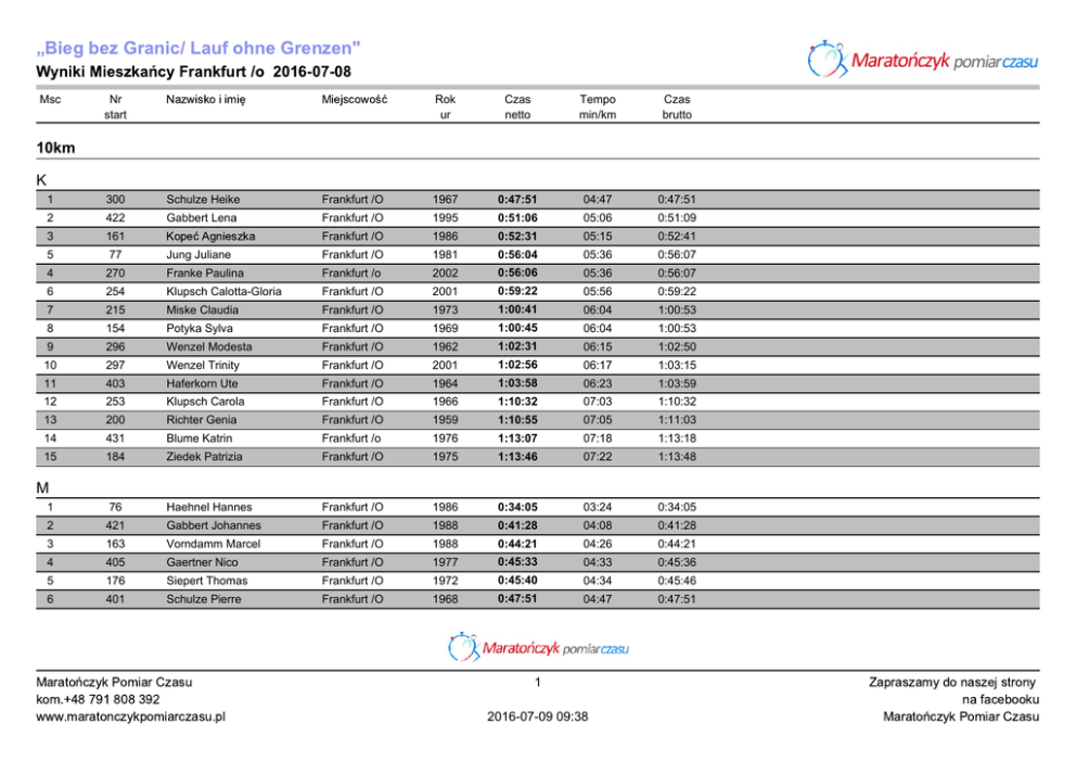 „Bieg bez Granic/ Lauf ohne Grenzen" Wyniki Mieszkańcy Frankfurt /o Msc Nr start Nazwisko i imię 1 300 Schulze Heike 2 422 3 161 5 2016-07-08 Miejscowość Rok ur Czas netto Tempo min/km Czas brutto Frankfurt /O 1967 0:47:51 04:47 0:47:51 Gabbert Lena Frankfurt /O 1995 0:51:06 05:06 0:51:09 Kopeć Agnieszka Frankfurt /O 1986 0:52:31 05:15 0:52:41 77 Jung Juliane Frankfurt /O 1981 0:56:04 05:36 0:56:07 4 270 Franke Paulina Frankfurt /o 2002 0:56:06 05:36 0:56:07 6 254 Klupsch Calotta-Gloria Frankfurt /O 2001 0:59:22 05:56 0:59:22 7 215 Miske Claudia Frankfurt /O 1973 1:00:41 06:04 1:00:53 8 154 Potyka Sylva Frankfurt /O 1969 1:00:45 06:04 1:00:53 9 296 Wenzel Modesta Frankfurt /O 1962 1:02:31 06:15 1:02:50 10 297 Wenzel Trinity Frankfurt /O 2001 1:02:56 06:17 1:03:15 11 403 Haferkorn Ute Frankfurt /O 1964 1:03:58 06:23 1:03:59 12 253 Klupsch Carola Frankfurt /O 1966 1:10:32 07:03 1:10:32 13 200 Richter Genia Frankfurt /O 1959 1:10:55 07:05 1:11:03 14 431 Blume Katrin Frankfurt /o 1976 1:13:07 07:18 1:13:18 15 184 Ziedek Patrizia Frankfurt /O 1975 1:13:46 07:22 1:13:48 1 76 Haehnel Hannes Frankfurt /O 1986 0:34:05 03:24 0:34:05 2 421 Gabbert Johannes Frankfurt /O 1988 0:41:28 04:08 0:41:28 3 163 Vorndamm Marcel Frankfurt /O 1988 0:44:21 04:26 0:44:21 4 405 Gaertner Nico Frankfurt /O 1977 0:45:33 04:33 0:45:36 5 176 Siepert Thomas Frankfurt /O 1972 0:45:40 04:34 0:45:46 6 401 Schulze Pierre Frankfurt /O 1968 0:47:51 04:47 0:47:51 10km K M Maratończyk Pomiar Czasu kom.+48 791 808 392 www.maratonczykpomiarczasu.pl 1 2016-07-09 09:38 Zapraszamy do naszej strony na facebooku Maratończyk Pomiar Czasu Msc Nr start Nazwisko i imię 7 402 Haferkorn Henry 8 407 Gutsche Jens-Uwe Miejscowość Rok ur Czas netto Tempo min/km Czas brutto Frankfurt /O 1963 0:48:16 04:49 0:48:18 Frankfurt /O 1963 0:49:23 04:56 0:49:25 9 425 Stegelmann Carsten Frankfurt /o 1967 0:49:53 04:59 0:50:07 10 299 Kwis Schulz Frankfurt /o 1965 0:51:15 05:07 0:51:17 11 199 Richter Thomas Frankfurt /O 1963 0:53:46 05:22 0:53:53 12 186 Kohlhepp Szymon Frankfurt /O 1990 0:54:26 05:26 0:54:40 13 234 Paulke Joachim Frankfurt /O 1944 1:00:18 06:01 1:00:21 14 406 Geßner Thomas Mario Frankfurt /O 1992 1:01:41 06:10 1:01:56 15 294 Wenzel Gregor Frankfurt /O 1990 1:02:31 06:15 1:02:50 16 271 Radue Jüegen Frankfurt /O 1953 1:02:48 06:16 1:02:55 17 255 Kleinfeldt Lutz Frankfurt /O 1963 1:05:01 06:30 1:05:10 18 240 Klar Karl-Heinz Frankfurt /o 1940 1:06:26 06:38 1:06:34 19 243 Gwizdek Tomek Frankfurt /O 1988 1:08:35 06:51 1:08:59 Liczba zawodników: 34 Maratończyk Pomiar Czasu kom.+48 791 808 392 www.maratonczykpomiarczasu.pl 2 2016-07-09 09:38 Zapraszamy do naszej strony na facebooku Maratończyk Pomiar Czasu