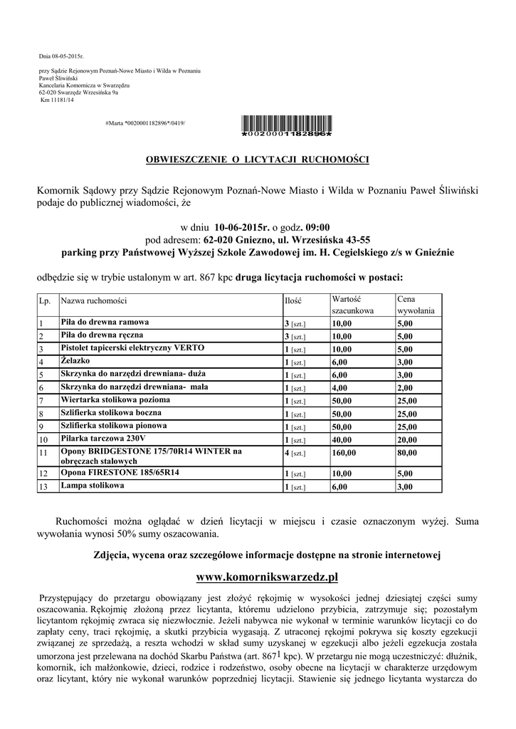 Dnia 08-05-2015r. przy Sądzie Rejonowym Poznań-Nowe Miasto i Wilda w Poznaniu Paweł Śliwiński Kancelaria Komornicza w Swarzędzu 62-020 Swarzędz Wrzesińska 9a Km 11181/14 #Marta *0020001182896*/0419/ *0020001182896* OBWIESZCZENIE O LICYTACJI RUCHOMOŚCI Komornik Sądowy przy Sądzie Rejonowym Poznań-Nowe Miasto i Wilda w Poznaniu Paweł Śliwiński podaje do publicznej wiadomości, że w dniu 10-06-2015r. o godz. 09:00 pod adresem: 62-020 Gniezno, ul. Wrzesińska 43-55 parking przy Państwowej Wyższej Szkole Zawodowej im. H. Cegielskiego z/s w Gnieźnie odbędzie się w trybie ustalonym w art. 867 kpc druga licytacja ruchomości w postaci: 3 [szt.] 3 [szt.] 1 [szt.] 1 [szt.] 1 [szt.] 1 [szt.] 1 [szt.] 1 [szt.] 1 [szt.] 1 [szt.] 4 [szt.] Wartość szacunkowa 10,00 10,00 10,00 6,00 6,00 4,00 50,00 50,00 50,00 40,00 160,00 Cena wywołania 5,00 5,00 5,00 3,00 3,00 2,00 25,00 25,00 25,00 20,00 80,00 1 [szt.] 1 [szt.] 10,00 6,00 5,00 3,00 Lp. Nazwa ruchomości Ilość 1 2 3 4 5 6 7 8 9 10 11 Piła do drewna ramowa Piła do drewna ręczna Pistolet tapicerski elektryczny VERTO Żelazko Skrzynka do narzędzi drewniana- duża Skrzynka do narzędzi drewniana- mała Wiertarka stolikowa pozioma Szlifierka stolikowa boczna Szlifierka stolikowa pionowa Pilarka tarczowa 230V Opony BRIDGESTONE 175/70R14 WINTER na obręczach stalowych Opona FIRESTONE 185/65R14 Lampa stolikowa 12 13 Ruchomości można oglądać w dzień licytacji w miejscu i czasie oznaczonym wyżej. Suma wywołania wynosi 50% sumy oszacowania. Zdjęcia, wycena oraz szczegółowe informacje dostępne na stronie internetowej www.komornikswarzedz.pl Przystępujący do przetargu obowiązany jest złożyć rękojmię w wysokości jednej dziesiątej części sumy oszacowania. Rękojmię złożoną przez licytanta, któremu udzielono przybicia, zatrzymuje się; pozostałym licytantom rękojmię zwraca się niezwłocznie. Jeżeli nabywca nie wykonał w terminie warunków licytacji co do zapłaty ceny, traci rękojmię, a skutki przybicia wygasają. Z utraconej rękojmi pokrywa się koszty egzekucji związanej ze sprzedażą, a reszta wchodzi w skład sumy uzyskanej w egzekucji albo jeżeli egzekucja została umorzona jest przelewana na dochód Skarbu Państwa (art. 8671 kpc). W przetargu nie mogą uczestniczyć: dłużnik, komornik, ich małżonkowie, dzieci, rodzice i rodzeństwo, osoby obecne na licytacji w charakterze urzędowym oraz licytant, który nie wykonał warunków poprzedniej licytacji. Stawienie się jednego licytanta wystarcza do odbycia przetargu. Pełnomocnictwo do udziału w przetargu powinno być stwierdzone dokumentem z podpisem urzędowo poświadczonym, chyba że chodzi o pełnomocnictwo udzielone adwokatowi lub radcy prawnemu (art. 8672 kpc) UWAGA: Licytacja może się nie odbyć bez podania przyczyny. Jeżeli drzwi będą zamknięte, będą otwierane na koszt i odpowiedzialność dłużnika . Asesor komorniczy Asesor komorniczy Aplikant komorniczy Komornik Sądowy Paweł Nowakowski Bartosz Kramer Adam Dębicki Paweł Śliwiński