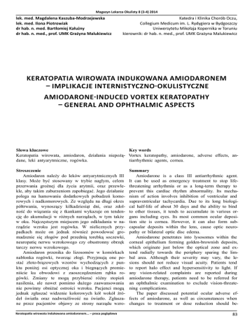 Magazyn Lekarza Okulisty 8 (3-4) 2014 lek. med. Magdalena Kaszuba-Modrzejewska lek. med. Ilona Piotrowiak dr hab. n. med. Bartłomiej Kałużny dr hab. n. med., prof. UMK Grażyna Malukiewicz Katedra i Klinika Chorób Oczu, Collegium Medicum im. L. Rydygiera w Bydgoszczy Uniwersytetu Mikołaja Kopernika w Toruniu kierownik: dr hab. n. med., prof. UMK Grażyna Malukiewicz Keratopatia wirowata indukowana amiodaronem – implikacje internistyczno-okulistyczne Amiodarone-induced vortex keratopathy – general and ophthalmic aspects Słowa kluczowe Key words Keratopatia wirowata, amiodaron, działania niepożą- Vortex keratopathy, amiodarone, adverse effects, andane, leki antyarytmiczne, rogówka. tiarrhythmic agents, cornea. Streszczenie Amiodaron należy do leków antyarytmicznych III klasy. Może być stosowany w trybie nagłym, celem przerwania groźnej dla życia arytmii, oraz przewlekle, aby takim zaburzeniom zapobiegać. Jego działanie polega na hamowaniu dodatkowych pobudzeń komorowych i nadkomorowych. Ze względu na długi okres półtrwania, wynoszący kilkadziesiąt dni, oraz zdolność do wiązania się z tkankami wykazuje on tendencję do akumulacji w różnych narządach, w tym także w oku. Najczęstszym miejscem jego odkładania w narządzie wzroku jest rogówka. W nielicznych przypadkach może on jednak również powodować gromadzenie się złogów pod przednią torebką soczewki, neuropatię nerwu wzrokowego czy obustronny obrzęk tarczy nerwu wzrokowego. Amiodaron przenika do lizosomów w komórkach nabłonka rogówki, tworząc złogi. Przyjmują one postać złoto-brązowych wzorów wychodzących z punktu poniżej osi optycznej oka i biegnących promieniście ku obwodowi z zaoszczędzeniem rąbka rogówki. Zmiany te mogą przybierać różny stopień nasilenia, ale nawet pomimo dużego zaawansowania nie powinny obniżać ostrości wzroku. Pacjenci mogą jednak zgłaszać widzenie kolorowych kół wokół źródeł światła oraz nadwrażliwość na światło. Zgłaszane przez pacjentów objawy ze strony narządu wzroKeratopatia wirowata indukowana amiodaronem... – praca poglądowa Summary Amiodarone is a class III antiarrhythmic agent. It can be used as emergency treatment to stop lifethreatening arrhythmia or as a long-term therapy to prevent this cardiac rhythm abnormality. Its mechanism of action involves inhibition of ventricular and supraventricular tachycardia. Due to its long biological half-life of about 30 days and the ability to bind to other tissues, it tends to accumulate in various organs including eyes. Its most common ocular deposition site is cornea. However, it can also form subcapsular deposits within the lens, cause optic neuropathy or bilateral optic disc edema. Amiodarone penetrates into lysosomes within the corneal epithelium forming golden-brownish deposits, which originate just below the optical zone and extend radially towards the periphery sparing the limbal area. Although their severity may vary, the lesions should not reduce visual acuity. Patients tend to report halo effect and hypersensitivity to light. If any vision-related complaints are reported during amiodarone therapy, patients need to be referred for an ophthalmic examination to exclude vision-threatening complications. The paper discussed potential ocular adverse effects of amiodarone, as well as circumstances when changes to treatment or dose reduction should be83 Magazyn Lekarza Okulisty 8 (3-4) 2014 ku w trakcie terapii amiodaronem powinny skłonić considered. lekarza prowadzącego do kierowania pacjenta na badanie okulistyczne, celem wykluczenia groźnych dla wzroku powikłań. Niniejsza praca przedstawia możliwe skutki terapii amiodaronem dla narządu wzroku i sytuacje kiedy należy rozważyć jej ograniczenie. 84 Keratopatia wirowata indukowana amiodaronem... – praca poglądowa