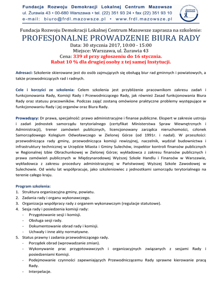 Fundacja Rozwoju Demokracji Lokalnej Centrum Mazowsze zaprasza na szkolenie: PROFESJONALNE PROWADZENIE BIURA RADY Data: 30 stycznia 2017, 10:00 - 15:00 Miejsce: Warszawa, ul. Żurawia 43 Cena: 339 zł przy zgłoszeniu do 16 stycznia. Rabat 10 % dla drugiej osoby z tej samej Instytucji. Adresaci: Szkolenie skierowane jest do osób zajmujących się obsługą biur rad gminnych i powiatowych, a także przewodniczących rad i radnych. Cele i korzyści ze szkolenia: Celem szkolenia jest przybliżenie pracownikom zakresu zadań i funkcjonowania Rady, Komisji Rady i Przewodniczącego Rady, jak również Zasad funkcjonowania Biura Rady oraz statusu pracowników. Podczas zajęć zostaną omówione praktyczne problemy występujące w funkcjonowaniu Rady i jej organów oraz Biura Rady. Prowadzący: Dr prawa, specjalność: prawo administracyjne i finanse publiczne. Ekspert w zakresie ustroju i zadań jednostek samorządu terytorialnego (certyfikat Ministerstwa Spraw Wewnętrznych i Administracji), trener zamówień publicznych, licencjonowany zarządca nieruchomości, członek Samorządowego Kolegium Odwoławczego w Zielonej Górze (od 1991r. i nadal). W przeszłości: przewodnicząca rady gminy, przewodnicząca komisji rewizyjnej, naczelnik, wydział budownictwa i infrastruktury technicznej w Urzędzie Miasta i Gminy Sulechów, inspektor kontroli finansów publicznych w Regionalnej Izbie Obrachunkowej w Zielonej Górze; wykładowca z zakresu finansów publicznych i prawa zamówień publicznych w Międzynarodowej Wyższej Szkole Handlu i Finansów w Warszawie, wykładowca z zakresu procedury administracyjnej w Państwowej Wyższej Szkole Zawodowej w Sulechowie. Od wielu lat współpracuje, jako szkoleniowiec z jednostkami samorządu terytorialnego na terenie całego kraju. Program szkolenia: 1. Struktura organizacyjna gminy, powiatu. 2. Zadania rady i organu wykonawczego. 3. Organizacja współpracy rady z organem wykonawczym (regulacje statutowe). 4. Sesja rady i posiedzenia komisji rady: - Przygotowanie sesji i komisji. - Obsługa sesji rady. - Dokumentowanie obrad rady i komisji. - Uchwały i inne akty normatywne. 5. Status prawny i zadania przewodniczącego rady. - Porządek obrad (wprowadzanie zmian). - Wykonywanie prac przygotowawczych i organizacyjnych związanych z sesjami Rady i posiedzeniami Komisji. - Podejmowanie czynności zapewniających Przewodniczącemu Rady sprawne kierowanie pracą Rady. - Interpelacje. - Rozpatrywanie skarg na organy. 6. Status prawny i zadania przewodniczących komisji i radnych. 7. Współpraca pracowników biura rady z przewodniczącym rady, przewodniczącymi komisji i radnymi. 8. Organizacja biura rady i jego pracy. 9. Przygotowywanie dokumentów, ogłoszeń, zaproszeń związanych z funkcjonowaniem rady. 10. Inne płaszczyzny aktywności biura rady i radnych. ZGŁOSZENIE PROFESJONALNE PROWADZENIE BIURA RADY Data: 30 stycznia 2017, 10:00 - 15:00 Miejsce: Warszawa, ul. Żurawia 43 Cena: 339 zł przy zgłoszeniu do 16 stycznia. Rabat 10 % dla drugiej osoby z tej samej Instytucji. Instytucja (dane do faktury): ................................................................................................ Adres: ................................................................................................................................. NIP: ..................................................................................................................................... L.p. Imię i nazwisko Wydział tel. e-mail 1.......................................................................................................................................... 2.......................................................................................................................................... 3.......................................................................................................................................... Prosimy o zaznaczenie znakiem x, jeśli dotyczy: Proszę o posiłek wegetariański Szkolenie finansowane w ramach Krajowego Funduszu Szkoleniowego szkolenie w ramach Forum Skarbników szkolenie w ramach Forum Sekretarzy szkolenie w ramach Forum Kadr ........................................................... podpis i pieczątka osoby delegującej Zgłoszenia prosimy przesyłać do 23 stycznia 2017 r. fax: (22) 351 93 10, e-mail: [email protected] lub wybrać opcje zapisu przez stronę www.frdl.mazowsze.pl Ewentualną rezygnację ze szkolenia można zgłosić najpóźniej na dwa dni robocze przed szkoleniem. W przypadku niewykorzystania zgłoszonego uczestnictwa - Urząd będzie zobowiązany do sfinansowania 60% odpłatności za uczestnictwo i materiały. FRDL zastrzega sobie prawo odwołania szkolenia. Miejsce szkolenia: Warszawa, ul. Żurawia 43. Lokalizacja 300 metrów od Metra Centrum. Cena: 339 zł netto przy zgłoszeniu do 16 stycznia. Cena po 16 stycznia to 389 zł. Rabat 10 % dla drugiej osoby z tej samej Instytucji. Zwolnienie z VAT w przypadku finansowania ze środków publicznych. W cenie materiały szkoleniowe, zaświadczenie, lunch oraz przerwy kawowe. Płatność przelewem, na podstawie faktury wystawionej w dniu szkolenia. Szkolenia realizujemy również w formie zamkniętej na terenie Instytucji. Zapytania prosimy kierować na adres email: [email protected]