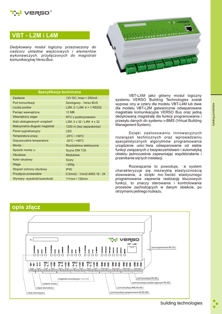 VBT - L2M i L4M Dedykowany moduł logiczny przeznaczony do nadzoru układów wejściowych i elementów wykonawczych, przyłączonych do magistrali komunikacyjnej Verso Bus. Zasilanie 12V DC; Imax = 250mA Port komunikacji Szeregowy - Verso BUS Liczba portów L2M: 2 / L4M: 4 + 1 RS232 Pamięć wewnętrzna 12 MB Wewnętrzny zegar RTC z podtrzymaniem Ilość obsługiwanych urządzeń L2M: 2 x 32 / L4M: 4 x 32 Maksymalna długość magistrali 1200 m (bez separatorów) Panel sygnalizacyjny LED Temperatura pracy -25oC ~+50oC Dopuszczalna temperatura -30oC ~+85oC Montaż Rozdzielnice elektryczne Sposób montażu Szyna DIN T35 Obudowa Modułowa Kolor obudowy Szary Waga ~200g Stopień ochrony obudowy IP40 Przyłącza przewodów 0.5mm2 - 1mm2 AWG 18 - 24 Wymiary: wysokość/szerokość 111mm / 155mm VBT-LXM jako główny moduł logiczny systemu VERSO Building Technologies został wyposażony w cztery dla modelu VBT-L4M lub dwie dla modelu VBT-L2M galwanicznie odseparowane magistrale komunikacyjne VERSO Bus oraz jedną dedykowaną magistralę dla funkcji programowania i przesyłu danych do systemu v-BMS (Virtual Building Managenent System). Dzięki zastosowaniu innowacyjnych rozwiązań technicznych oraz wprowadzeniu specjalistycznych algorytmów programowania urządzenie umożliwia odseparowanie od siebie funkcji związanych z bezpieczeństwem i automatyką obiektu jednocześnie zapewniając współdziałanie i przenikanie się tych instalacji. Rozwiązanie to powoduje, że system charakteryzuje się niezwykłą elastycznością stosowania, a dzięki możliwość elastycznego programowania zapewnia realizację kluczowych funkcji, to znaczy sterowania i kontrolowania procesów zachodzących w danym obiekcie, po otrzymaniu jednego rozkazu. opis złącz ID: VBT - L4M [ port programowania RS 232 ] [ magistrala komunikacyjna 1, 2, 3, 4 ] [ zasilanie modułu ] [ złącze akumulatora ] [ diody informacyjne ] [ port komunikacji RS 485 ] [ port komunikacji modułów logicznych RS 485 ] [ port komunikacji RMS RS 485 ] [ port komunikacji oprogramowania KD RS 485 ] building technologies katalog produktów Specyfikacja techniczna