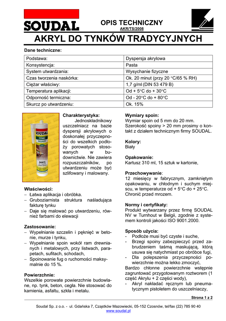 OPIS TECHNICZNY AKR/TS/2008 AKRYL DO TYNKÓW TRADYCYJNYCH Dane techniczne: Podstawa: Konsystencja: System utwardzania: Czas tworzenia naskórka: Ciężar właściwy: Temperatura aplikacji: Odporność termiczna: Skurcz po utwardzeniu: Charakterystyka: Jednoskładnikowy uszczelniacz na bazie dyspersji akrylowych o doskonałej przyczepności do wszelkich podłoży porowatych stosowanych w budownictwie. Nie zawiera rozpuszczalników, po utwardzeniu może być szlifowany i malowany. Właściwości: − Łatwa aplikacja i obróbka. − Gruboziarnista struktura naśladująca fakturę tynku − Daje się malować po utwardzeniu, również farbami do elewacji Zastosowanie: − Wypełnianie szczelin i pęknięć w betonie, murze i tynku, − Wypełnianie spoin wokół ram drewnianych i metalowych, przy listwach, parapetach, sufitach, schodach, − Spoinowanie fug o ruchomości maksymalnie do 15 %. Powierzchnie: Wszelkie porowate powierzchnie budowlane, np. tynk, beton, cegła. Nie stosować do kamienia, asfaltu, szkła i metalu. Dyspersja akrylowa Pasta Wysychanie fizyczne Ok. 20 minut (przy 20 °C/65 % RH) 1,7 g/ml (DIN 53 479 B) Od + 5°C do + 30°C Od - 20°C do + 80°C Ok. 15% Wymiary spoin: Wymiar spoin od 5 mm do 20 mm. Szerokość spoiny > 20 mm prosimy o kontakt z działem technicznym firmy SOUDAL. Kolory: Biały Opakowanie: Kartusz 310 ml, 15 sztuk w kartonie, Przechowywanie: 12 miesięcy w fabrycznym, zamkniętym opakowaniu, w chłodnym i suchym miejscu, w temperaturze od + 5°C do + 25°C. Chronić przed mrozem. Normy i certyfikaty: Produkt wytwarzany przez firmę SOUDAL NV w Turnhout w Belgii, zgodnie z systemem kontroli jakości ISO 9001.2000. Sposób użycia: - Podłoże musi być czyste i suche, - Brzegi spoiny zabezpieczyć przed zabrudzeniem taśmą maskującą, którą usuwa się natychmiast po obróbce fugi, - Dla polepszenia przyczepności powierzchnie można lekko zmoczyć, Bardzo chłonne powierzchnie wstępnie zagruntować przygotowanym roztworem (1 część Akrylu + 2 części wody), - Akryl nakładać ręcznym lub pneumatycznym pistoletem do uszczelniaczy, Strona 1 z 2 Soudal Sp. z o.o. - ul. Gdańska 7, Cząstków Mazowiecki, 05-152 Czosnów, tel/fax (22) 785 90 40 www.soudal.pl OPIS TECHNICZNY AKR/2008 - Fugę wygładzać roztworem mydła lub detergentu przed utworzeniem się naskórka, Czyszczenie narzędzi i podłoża: wodą bezpośrednio po użyciu. Farba elewacyjna powinna mieć wystarczającą elastyczność, aby pochłaniać ruchy akrylu. Ze względu na dużą różnorodność dostępnych rodzajów farb, zalecane przeprowadzenie testu kompatybilności. Uwagi: Nie stosować w miejscach narażonych na ciągłe działanie wody oraz podczas deszczu lub mrozu. Strona 2 z 2 Soudal Sp. z o.o. - Ul. Gdańska 7, Cząstków Mazowiecki, 05-152 Czosnów, tel/fax (22) 785 90 40 www.soudal.pl