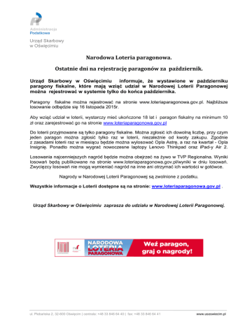 Urząd Skarbowy w Oświęcimiu Narodowa Loteria paragonowa. Ostatnie dni na rejestrację paragonów za październik. Urząd Skarbowy w Oświęcimiu informuje, że wystawione w październiku paragony fiskalne, które mają wziąć udział w Narodowej Loterii Paragonowej można rejestrować w systemie tylko do końca października. Paragony fiskalne można rejestrować na stronie www.loteriaparagonowa.gov.pl. Najbliższe losowanie odbędzie się 16 listopada 2015r. Aby wziąć udział w loterii, wystarczy mieć ukończone 18 lat i paragon fiskalny na minimum 10 zł oraz zarejestrować go na stronie www.loteriaparagonowa.gov.pl Do loterii przyjmowane są tylko paragony fiskalne. Można zgłosić ich dowolną liczbę, przy czym jeden paragon można zgłosić tylko raz w loterii, niezależnie od kwoty zakupu. Zgodnie z zasadami loterii raz w miesiącu będzie można wylosować Opla Astrę, a raz na kwartał - Opla Insignię. Ponadto można wygrać nowoczesne laptopy Lenovo Thinkpad oraz iPad-y Air 2. Losowania najcenniejszych nagród będzie można obejrzeć na żywo w TVP Regionalna. Wyniki losowań będą publikowane na stronie www.loteriaparagonowa.gov.pl/wyniki w dniu losowań. Zwycięzcy losowań nie mogą wymieniać nagród na inne ani otrzymać ich wartości w gotówce. Nagrody w Narodowej Loterii Paragonowej są zwolnione z podatku. Wszystkie informacje o Loterii dostępne są na stronie: www.loteriaparagonowa.gov.pl . Urząd Skarbowy w Oświęcimiu zaprasza do udziału w Narodowej Loterii Paragonowej. ul. Plebańska 2, 32-600 Oświęcim | centrala: +48 33 846 64 40 | fax: +48 33 846 64 41 www.usoswiecim.pl