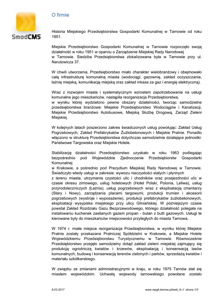 O firmie Historia Miejskiego Przedsiębiorstwa Gospodarki Komunalnej w Tarnowie od roku 1951. Miejskie Przedsiębiorstwo Gospodarki Komunalnej w Tarnowie rozpoczęło swoją działalność w roku 1951 w oparciu o Zarządzenie Miejskiej Rady Narodowej w Tarnowie. Siedziba Przedsiębiorstwa zlokalizowana była w Tarnowie przy ul. Narutowicza 37. W chwili utworzenia, Przedsiębiorstwo miało charakter wielobranżowy i obejmowało całą infrastrukturę komunalną miasta (wodociągi, gazownię, zakład oczyszczania, łaźnię miejską, komunikację miejską oraz zakład inkasa za gaz i energię elektryczną). Wraz z rozwojem miasta i systematycznym wzrostem zapotrzebowania na usługi komunalne jego mieszkańców, nastąpiła reorganizacja Przedsiębiorstwa, w wyniku której wydzielono pewne obszary działalności, tworząc samodzielne przedsiębiorstwa branżowe: Miejskie Przedsiębiorstwo Wodociągów i Kanalizacji, Miejskie Przedsiębiorstwo Autobusowe, Miejską Służbę Drogową, Zarząd Zieleni Miejskiej. W kolejnych latach poszerzono zakres świadczonych usług powołując: Zakład Usług Pogrzebowych, Zakład Prefabrykatów Żużlobetonowych i Miejskie Pralnie. Ponadto włączono w strukturę Przedsiębiorstwa dotychczas samodzielnie działające jednostki: Państwowe Targowiska oraz Miejskie Hotele. Stabilizację działalności Przedsiębiorstwo uzyskało w roku 1963 podlegając bezpośrednio pod Wojewódzkie Zjednoczenie Przedsiębiorstw Gospodarki Komunalnej w Krakowie, a pośrednio pod Prezydium Miejskiej Rady Narodowej w Tarnowie. Świadczyło wtedy usługi w zakresie: wywozu nieczystości stałych i płynnych z terenu miasta, utrzymania czystości ulic i chodników oraz przejezdności ulic w czasie okresu zimowego, usług hotelowych (Hotel Polski, Polonia, Leliwa), usług przyrodoleczniczych (Łaźnia), usług pogrzebowych wraz z eksploatacją cmentarzy (Stary i Nowy), zarządzania placami targowymi, produkcji trumien i akcesorii pogrzebowych (wystroje i wyposażenie), produkcji prefabrykatów żużlobetonowych, eksploatacji wysypiska miejskiego przy ulicy Gliniańskiej. W późniejszym czasie powstał Zakład Rozdziału Gazu Bezprzewodowego, którego działalność polegała na instalowaniu kuchenek zasilanych gazem propan - butan z butli gazowych. Usługi te kierowane były do mieszkańców miejscowości przyległych do miasta Tarnowa. W 1974 r. miała miejsce reorganizacja Przedsiębiorstwa, w wyniku której Miejskie Pralnie zostały przekazane Pralniczej Spółdzielni w Krakowie, a Miejskie Hotele Wojewódzkiemu Przedsiębiorstwu Turystycznemu w Tarnowie. Równocześnie Przedsiębiorstwo przejęło samodzielny dotąd zakład zieleni miejskiej zajmujący się produkcją ogrodniczą kwiatów i krzewów, eksploatacją i konserwacją lasów komunalnych, budową i konserwacją terenów zielonych i parków, sprzedażą kwiatów i materiału szkółkarskiego. W związku ze zmianami administracyjnymi w kraju, w roku 1975 Tarnów stał się miastem wojewódzkim. Uchwałą wojewody tarnowskiego powołane zostało 8.03.2017 www.mpgk.tarnow.pl/web_fx // strona 1/3 Wojewódzkie Zrzeszenie Przedsiębiorstw Gospodarki Komunalnej i Mieszkaniowej z siedzibą w Tarnowie przy ul. Okrężnej, w którego skład weszło m.in. nasze przedsiębiorstwo. W maju 1992 r. decyzją Urzędu Miasta Tarnowa utworzono Miejski Zarząd Cmentarzy co skutkowało tym, że cała dotychczasowa działalność zakładu usług pogrzebowych skupiona w obrębie naszego przedsiębiorstwa, została przekazana do nowej jednostki. W wyniku realizacji programu prywatyzacyjnego, tj. restrukturyzacji Przedsiębiorstwa z dniem 29.05.1992 r. firma otrzymała status Miejskiego Przedsiębiorstwa Gospodarki Komunalnej Spółka z o.o. w Tarnowie, w której jedynym udziałowcem została Gmina Miasta Tarnowa. Kapitał zakładowy spółki wynoszący 300 000 zł został objęty w całości przez Gminę Miasta Tarnowa. Skład pierwszego zarządu MPGK Sp. z o.o. przestawiał się następująco: Krzysztof Ćwik - Prezes Zarządu, Dyrektor Spółki, Marian Papiernik – Wiceprezes Zarządu, Zastępca Dyrektora Spółki, Zofia Strzesak - Członek Zarządu, Główna Księgowa. Ówczesny zakres działalności Spółki obejmował: wywóz nieczystości stałych i płynnych z terenu m. Tarnowa, letnie i zimowe utrzymanie czystości ulic, konserwacja i utrzymanie zieleni, składowanie odpadów komunalnych, obsługa i konserwacja szaletów miejskich. W roku 1993 przeniesiono całą administrację z dotychczasowej siedziby Przedsiębiorstwa przy ul. Narutowicza 37 do adaptowanego na ten cel budynku kontenerowego przy ul. Bandrowskiego 14. W roku 1996 Spółka przekazała wysypisko miejskie będące w strukturze firmy, powstającej właśnie samodzielnej jednostce pod nazwą Zakład Składowania Odpadów Komunalnych. Z dniem 30.04.2002 r. z przyczyn rynkowych nastąpiła likwidacja działalności w zakresie konserwacji i utrzymania zieleni. W związku z tym obiekty zlokalizowane przy ul. Słowackiego 3 w Tarnowie przekazano na rzecz Związku Harcerstwa Polskiego w Tarnowie. W lipcu 2007 r. przeniesiono siedzibę Przedsiębiorstwa z ul. Bandrowskiego 14 na ul. Okrężną 11. Po wszelkich dotychczasowych przeobrażeniach Spółka aktualnie prowadzi działalność w zakresie: wywozu nieczystości stałych, letniego i zimowego utrzymania czystości ulic, zbiórki surowców podlegających recyklingowi. Obecnie Zarząd Spółki stanowią: Mariusz Burnóg - Prezes Zarządu Andrzej Klempka - Wiceprezes Zarządu Zgodnie z Kodeksem spółek handlowych nadzór nad pracą Zarządu Spółki sprawuje, w imieniu Właściciela, Rada Nadzorcza. Aktualny skład osobowy Rady Nadzorczej MPGK Sp. z o. o. w Tarnowie : 8.03.2017 www.mpgk.tarnow.pl/web_fx // strona 2/3 Patrycja Bałchanowska - Przewodnicząca Rady Nadzorczej - przedstawiciel Właściciela, Piotr Wardawa - Zastępca Przewodniczącej Rady Nadzorczej - przedstawiciel Właściciela, Rafał Nakielny - Członek R