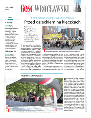 I 5 czerwca 2011 nr 22/817 krótko II Marsz dla Rodzin przeszedł 28 maja ulicami Wrocławia Czuwanie przed Zesłaniem Ducha Świętego, zorganizowane przez wrocławskie wspólnoty w kościele pw. św. Maksymiliana M. Kolbego, rozpocznie się w wigilię uroczystości – 11 czerwca o 19.30. W programie wykład ks. Mariusza Rosika – o 21.00, modlitwa o wylanie Ducha Świętego oraz o 23.45 Eucharystia pod przewodnictwem bp. Edwarda Janiaka. Biblia i muzyka Wrocław. Kolejne spotkanie w cyklu „Verbum cum Musica” odbędzie się 12 czerwca o 19.00 w kościele pw. NMP na Piasku. Biblijnej prelekcji towarzyszyć będzie występ chóru „Ars Cantandi” z Uniwersytetu Ekonomicznego we Wrocławiu. Agata Combik Przed dzieckiem na klęczkach W wigilię Z prymasem Wyszyńskim i Joszko Brodą, na Mszy św., w barwnym korowodzie, a później na zielonej trawie przy ciasteczkach świętowali w sercu miasta. Z gromadą maluchów szli szczęśliwi rodzice, dziadkowie oraz rozśpiewane ciocie i wujkowie. „Kto w rodzinie, ten nie zginie!”, „Chodźcie z nami, z rodzinami!” – zachęcali zdumionych wrocławian, idąc z relikwiami św. Joanny Beretty Moli z Ostrowa Tumskiego, przez rynek, do parku Słowackiego. Marsz wyruszył po Eucharystii w kościele pw. NMP na Piasku. Przewodniczył jej ks. Marian Biskup, który w homilii przywołał zmarłego dokładnie przed 30 laty kard. S. Wyszyńskiego. – Wszyscy powinni być na klęczkach przed najmniejszym dzieciątkiem ochrzczonym przez Kościół w Polsce Pod galeriami handlowymi zabrzmiały pieśni o Zmartwychwstałym Panu – mówił, nawiązując do słów Prymasa Tysiąclecia. „Gdy Bóg jest usuwany z wychowania i ze wszystkich miejsc w życiu publicznym, musi się znaleźć w Polsce bezpieczne miejsce dla Niego. Poza świątynią tym miejscem jest rodzina” – zabrzmiały kolejne słowa kardynała. Rodzinne święto trwało na festynie w parku Słowackiego. Ze sceny rozlegały się dźwięki zespołu One Agata Combik Jedyna taka obrączka B o choćby mi przyszło postradać me życie – tak wolę – niż żyć, a mieć w sercu ranę – słowa rotmistrza Witolda Pileckiego widnieją na poświęconym mu pomniku odsłoniętym w 63. rocznicę jego śmierci. Symboliczna obrączka autorstwa Jerzego Kaliny, nawiązująca do biżuterii patriotycznej i wyrażająca wierność ojczyźnie, została odsłonięta na Promenadzie Staromiejskiej przez prezydenta R. Dutkiewicza i prezesa wrocławskiego oddziału ŚZŻ AK J. Woźniaka. Niezależnie od pytań, czy obrączka kojarzy się jednoznacznie z bohaterskim wojownikiem o wolność, który poniósł śmierć w komunistycznej Polsce, pomnik pozostaje ważnym owocem starań wielu osób o upamiętnienie postaci rotmistrza we Wrocławiu. • 5 czerwca 2011 Gość Niedzielny Wrocław, 25. 05. 2011. Biskup E. Janiak i kardynał H. Gulbinowicz w czasie poświęcenia pomnika in Him, a następnie Dzieci z Brodą; przy stoiskach można było m.in. zapoznać się z miejską ofertą dla rodzin. Marek Maj ze wspólnoty Koinonia Jan Chrzciciel, głównego organizatora spotkania, zachęcał do dawania radosnego świadectwa o Bożym planie wobec rodziny. – Dziękuję Ci, Panie, że mój Kościół jest miejscem świętowania i uczty – mówił, otoczony skaczącymi dziećmi. Agata Combik gość wrocławski gość wrocławski tkanie, by członkowie szkolnych kół misyjnych mogli zobaczyć, że są częścią większej grupy ludzi troszczących się o sprawy misji – mówił ks. dr Krzysztof Borecki, duszpasterz Papieskich Dzieł Misyjnych Archidiecezji Wrocławskiej. Podkreślił, że niezwykle ważne jest budzenie odpowiedzialności za chrześcijan w krajach misyjnych od najmłodszych lat. – Najbardziej podobała mi się zabawa w Zorro – powiedział siedmioletni Mateusz z Trzebnicy. xrk 15 lat dla dzieci 40–45 dzieci. W świetlicy oprócz wolontariuszy pracuje wykwalifikowana kadra nauczycielska. 29 czerwca w parafialnym ogrodzie odbył się jubileuszowy festyn charytatywny. – Zbieramy na działalność i na kolonię w Ustroniu Morskim – dodaje U. Krajewska. Dzięki zebranym pieniądzom i wsparciu sponsorów do Ustronia będą mogli pojechać również najmłodsi z mniej zamożnych rodzin. kab Gość Niedzielny 5 czerwca 2011 ks. rafał kowalski Takiego wydarzenia sportowego w naszym kraju jeszcze nie było. 10 września na nowym wrocławskim stadionie odbędzie się walka o mistrzostwo świata federacji WBC. jednak pewien, że o tym, kto będzie jego posiadaczem, zadecyduję ja. Jeśli będę chciał go oddać, zrobię to. Teraz jeszcze tego nie chcę – deklarował. Kliczko zapowiedział, że jeśli dwóch bokserów takiej klasy spotyka się w ringu, to zawsze gwarantowane jest świetne widowisko. Taktyka Czy po 10 września Ukrainiec nadal będzie posiadaczem mistrzowskiego pasa? W ten sposób zainauguruje działalność wrocławska arena przygotowana z myślą o Euro 2012. Gwiazdy wrześniowego wieczoru stolicę Dolnego Śląska odwiedziły już 24 maja, by wspólnie zaprosić do udziału w tym wielkim sportowym święcie. – Nigdy nie myślałem, że będzie mi dane walczyć o pas mistrzowski w wadze ciężkiej, i to jeszcze na stadionie – mówił Tomasz Adamek. Polski bokser jest przekonany, że arena na wrocławskich Pilczycach wypełni się po brzegi, a bokserzy stworzą świetne widowisko. Jeszcze nigdy w historii boksu walka o mistrzostwo świata w wadze ciężkiej nie odbywała się w Polsce. Dzięki nowej infrastrukturze imprezy tej rangi są możliwe. Michał Janicki, prezes zarządu wrocław- skiego stadionu, zapewnia, że arena zostanie przygotowana na czas: – Już w połowie sierpnia swoje mecze na stadionie będzie rozgrywał Śląsk Wrocław, potem czeka nas impreza Monster Truck i koncert Georga Michaela. Festiwal uprzejmości – Szedłem jak burza w wadze ciężkiej i wygrałem do tej pory swoje walki. Zrobię wszystko, by zostać mistrzem świata, obiecałem to kibicom