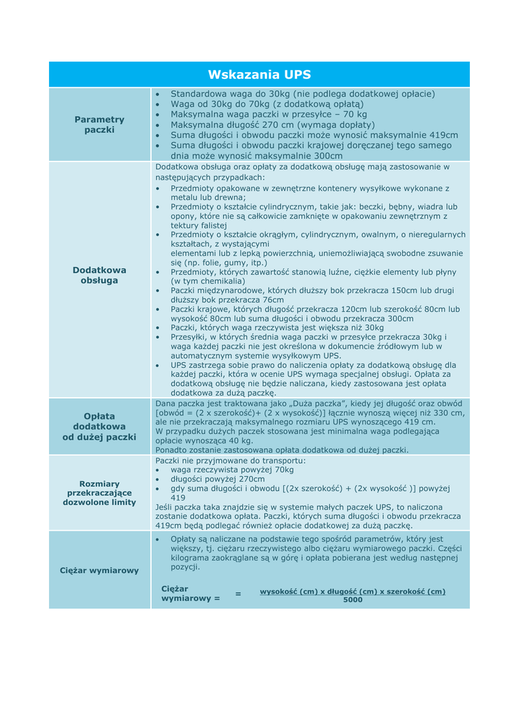 Wskazania UPS Parametry paczki Dodatkowa obsługa Opłata dodatkowa od dużej paczki Rozmiary przekraczające dozwolone limity Dodatkowa obsługa oraz opłaty za dodatkową obsługę mają zastosowanie w następujących przypadkach: • Przedmioty opakowane w zewnętrzne kontenery wysyłkowe wykonane z metalu lub drewna; • Przedmioty o kształcie cylindrycznym, takie jak: beczki, bębny, wiadra lub opony, które nie są całkowicie zamknięte w opakowaniu zewnętrznym z tektury falistej • Przedmioty o kształcie okrągłym, cylindrycznym, owalnym, o nieregularnych kształtach, z wystającymi elementami lub z lepką powierzchnią, uniemożliwiającą swobodne zsuwanie się (np. folie, gumy, itp.) • Przedmioty, których zawartość stanowią luźne, ciężkie elementy lub płyny (w tym chemikalia) • Paczki międzynarodowe, których dłuższy bok przekracza 150cm lub drugi dłuższy bok przekracza 76cm • Paczki krajowe, których długość przekracza 120cm lub szerokość 80cm lub wysokość 80cm lub suma długości i obwodu przekracza 300cm • Paczki, których waga rzeczywista jest większa niż 30kg • Przesyłki, w których średnia waga paczki w przesyłce przekracza 30kg i waga każdej paczki nie jest określona w dokumencie źródłowym lub w automatycznym systemie wysyłkowym UPS. UPS zastrzega sobie prawo do naliczenia opłaty za dodatkową obsługę dla każdej paczki, która w ocenie UPS wymaga specjalnej obsługi. Opłata za dodatkową obsługę nie będzie naliczana, kiedy zastosowana jest opłata dodatkowa za dużą paczkę. Dana paczka jest traktowana jako „Duża paczka”, kiedy jej długość oraz obwód [obwód = (2 x szerokość)+ (2 x wysokość)] łącznie wynoszą więcej niż 330 cm, ale nie przekraczają maksymalnego rozmiaru UPS wynoszącego 419 cm. W przypadku dużych paczek stosowana jest minimalna waga podlegająca opłacie wynosząca 40 kg. Ponadto zostanie zastosowana opłata dodatkowa od dużej paczki. Paczki nie przyjmowane do transportu: waga rzeczywista powyżej 70kg długości powyżej 270cm gdy suma długości i obwodu [(2x szerokość) + (2x wysokość )] powyżej 419 Jeśli paczka taka znajdzie się w systemie małych paczek UPS, to naliczona zostanie dodatkowa opłata. Paczki, których suma długości i obwodu przekracza 419cm będą podlegać również opłacie dodatkowej za dużą paczkę. Ciężar wymiarowy Standardowa waga do 30kg (nie podlega dodatkowej opłacie) Waga od 30kg do 70kg (z dodatkową opłatą) Maksymalna waga paczki w przesyłce – 70 kg Maksymalna długość 270 cm (wymaga dopłaty) Suma długości i obwodu paczki może wynosić maksymalnie 419cm Suma długości i obwodu paczki krajowej doręczanej tego samego dnia może wynosić maksymalnie 300cm Opłaty są naliczane na podstawie tego spośród parametrów, który jest większy, tj. ciężaru rzeczywistego albo ciężaru wymiarowego paczki. Części kilograma zaokrąglane są w górę i opłata pobierana jest według następnej pozycji. Ciężar wymiarowy = = wysokość (cm) x długość (cm) x szerokość (cm) 5000